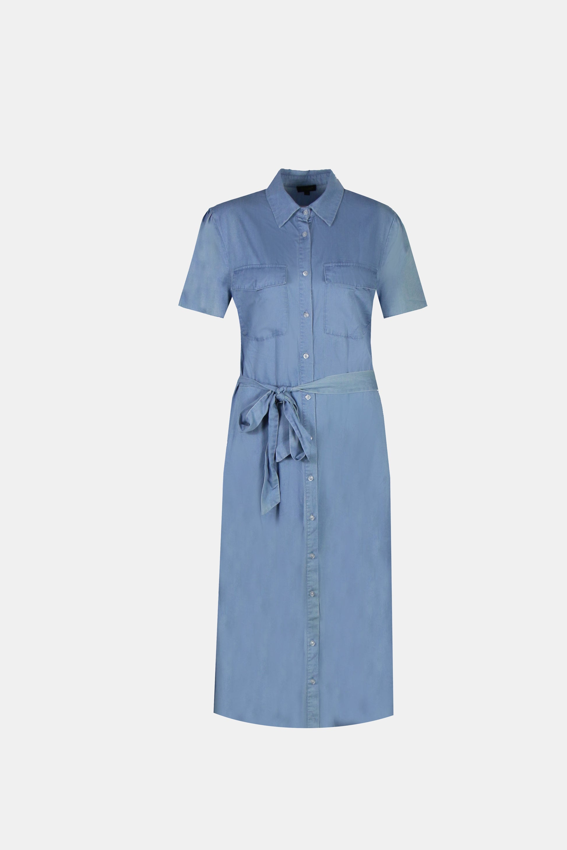 De Aevy jurk heeft korte mouwen en een blousekraag met knoopjes tot de onderkant. De jurk heeft twee zakken op de buste en een strikkoord voor een getailleerd effect.