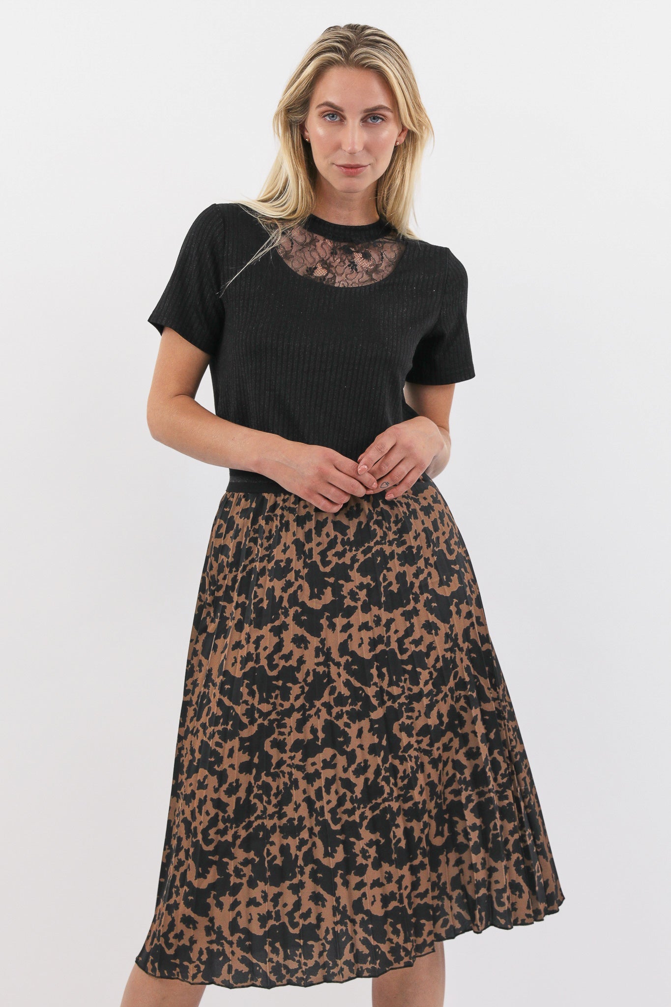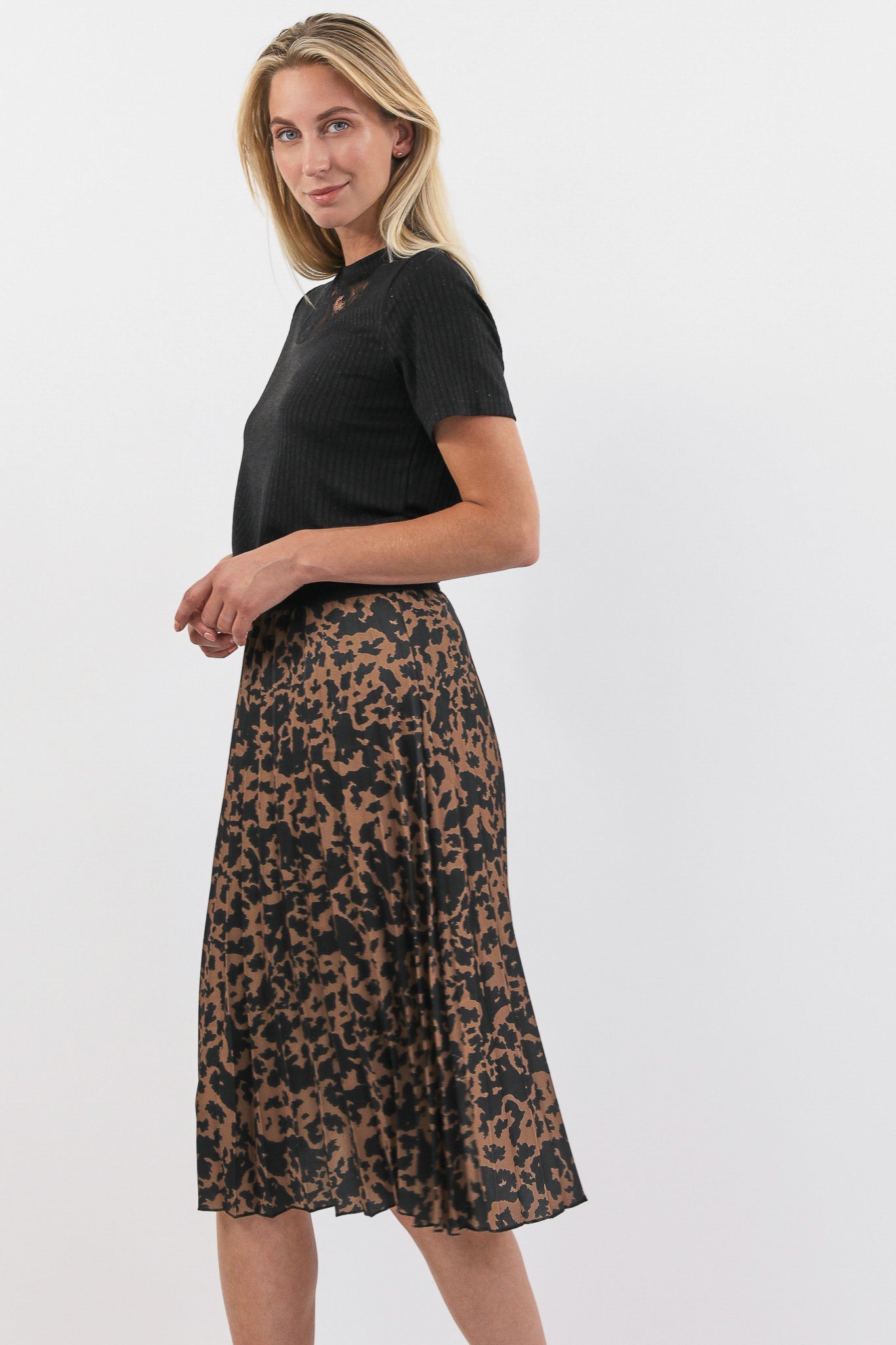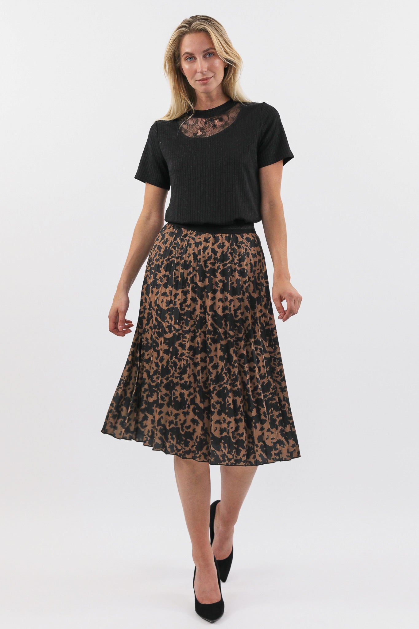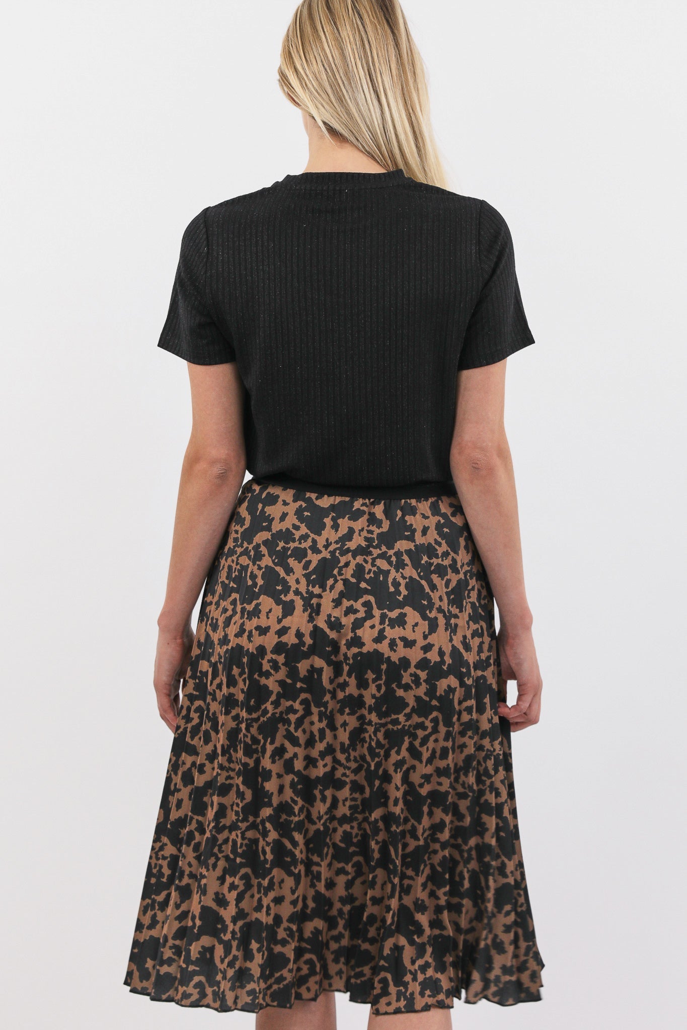 De Agnes rok is een midi plissé rok met een elastische tailleband. De rok is voorzien van een print en komt in het zwart/camel en zwart/grijs.