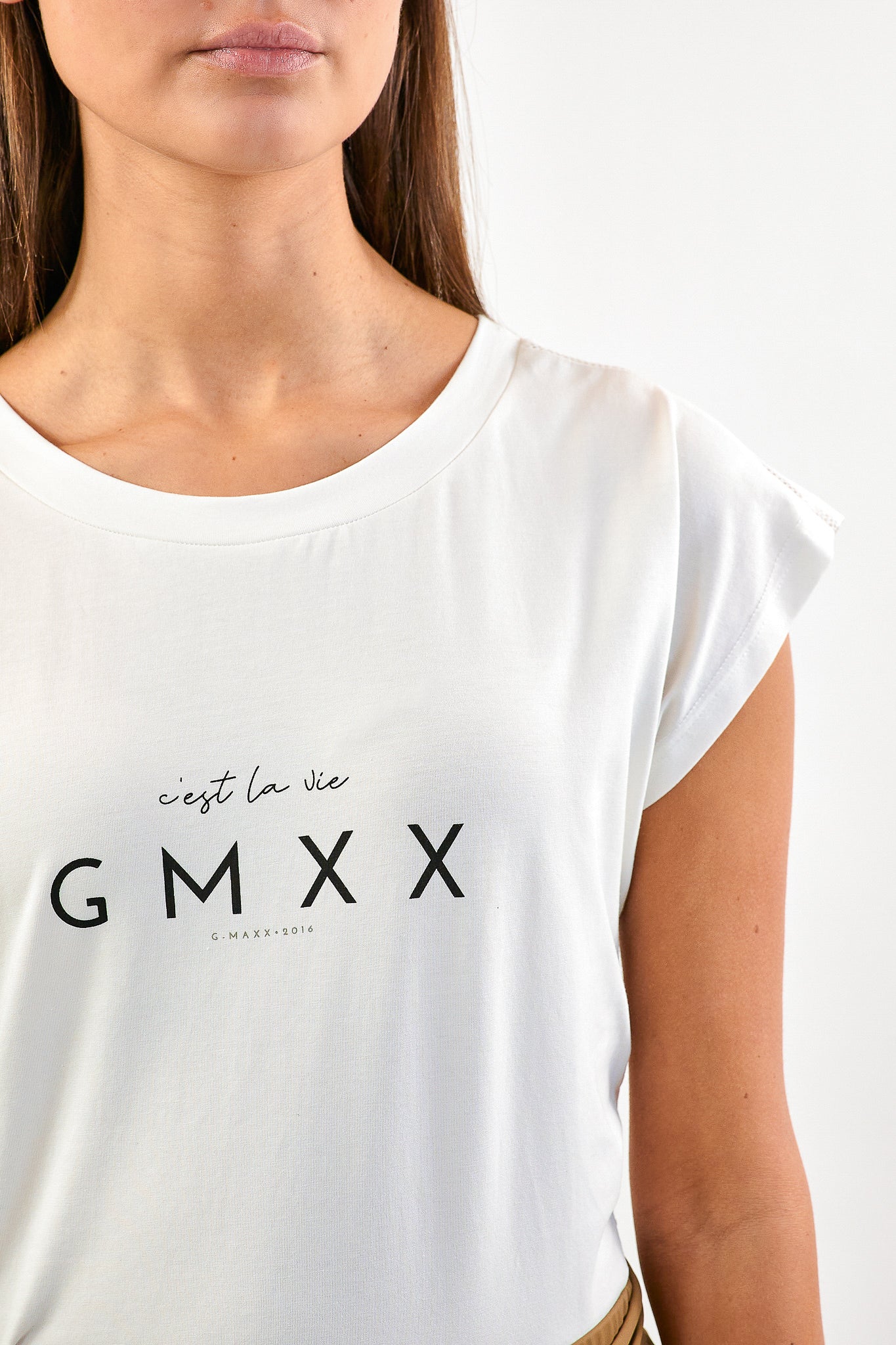 Het Alin T-shirt heeft een ronde hals en wijdere korte mouwen. Het T-shirt heeft de tekst 'c'est la vie gmxx'. Komt in de kleuren zwart en wit.