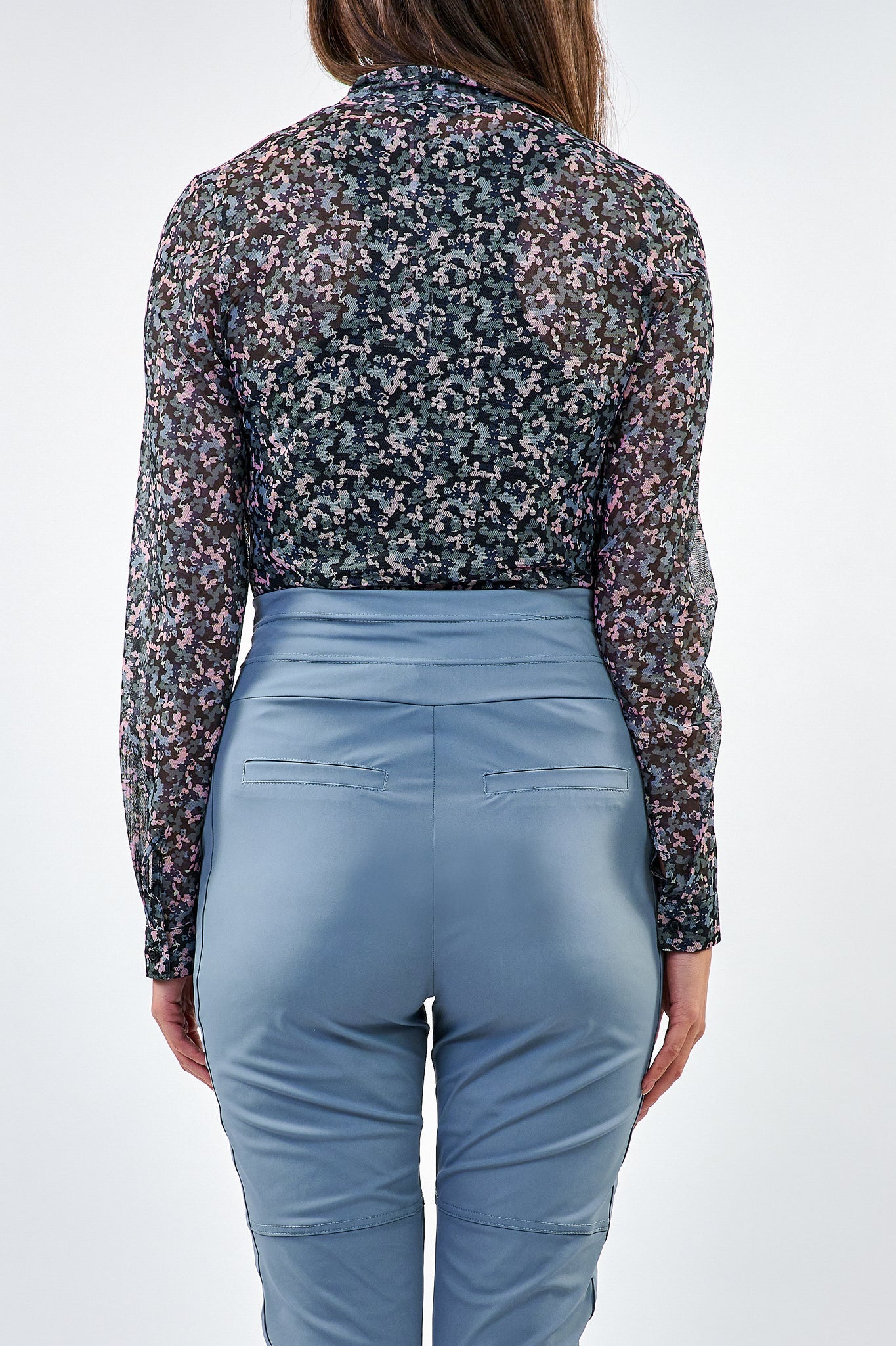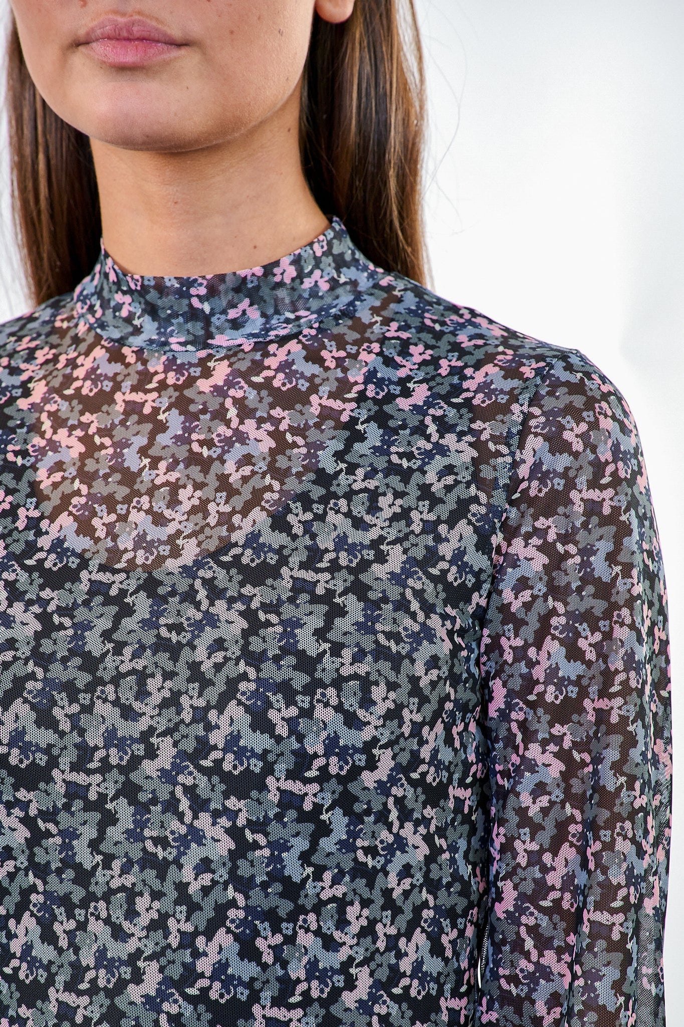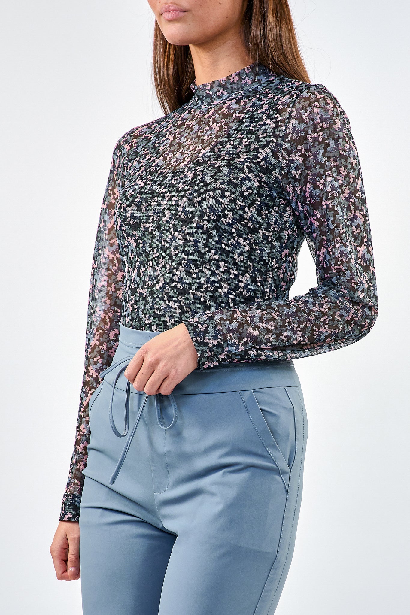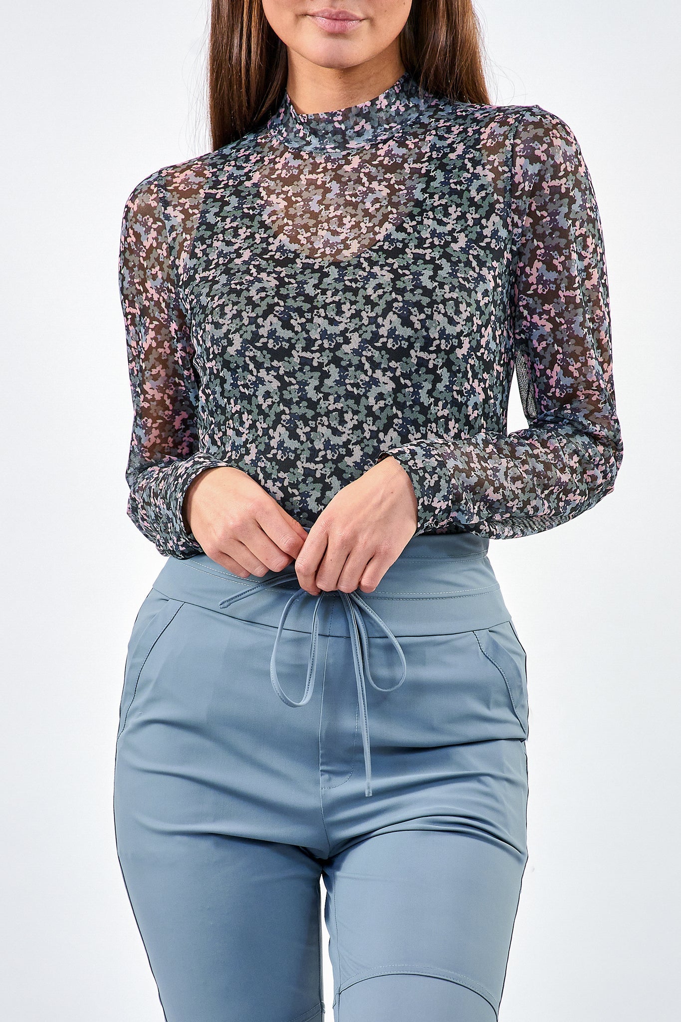 De Alinda top is gemaakt van de doorzichtige mesh-stof. De top heeft een zwart topje met spaghettibandjes eronder, een korte col en een subtiele bloemenprint.