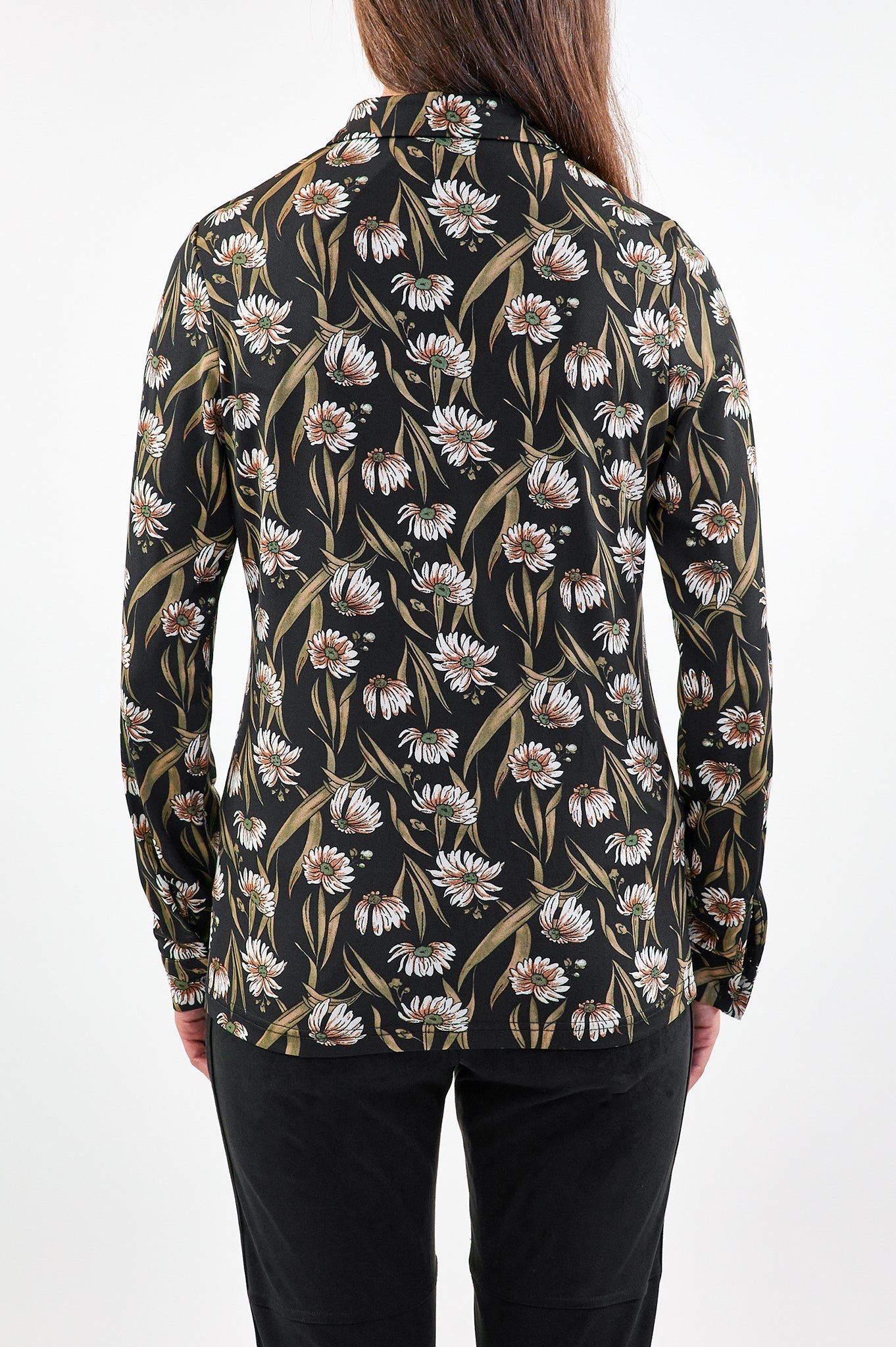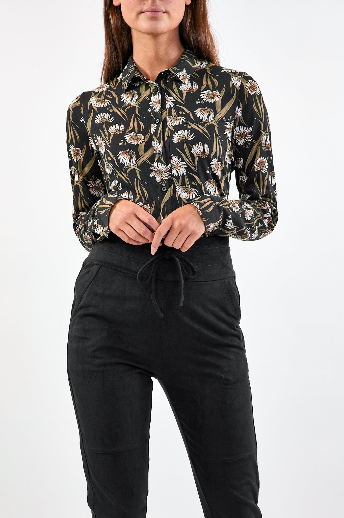 De Amalia blouse heeft een getailleerde pasvorm en is gemaakt van de comfortabele travelstof. De blouse heeft een bloemenprint en is voorzien van een knoopsluiting.