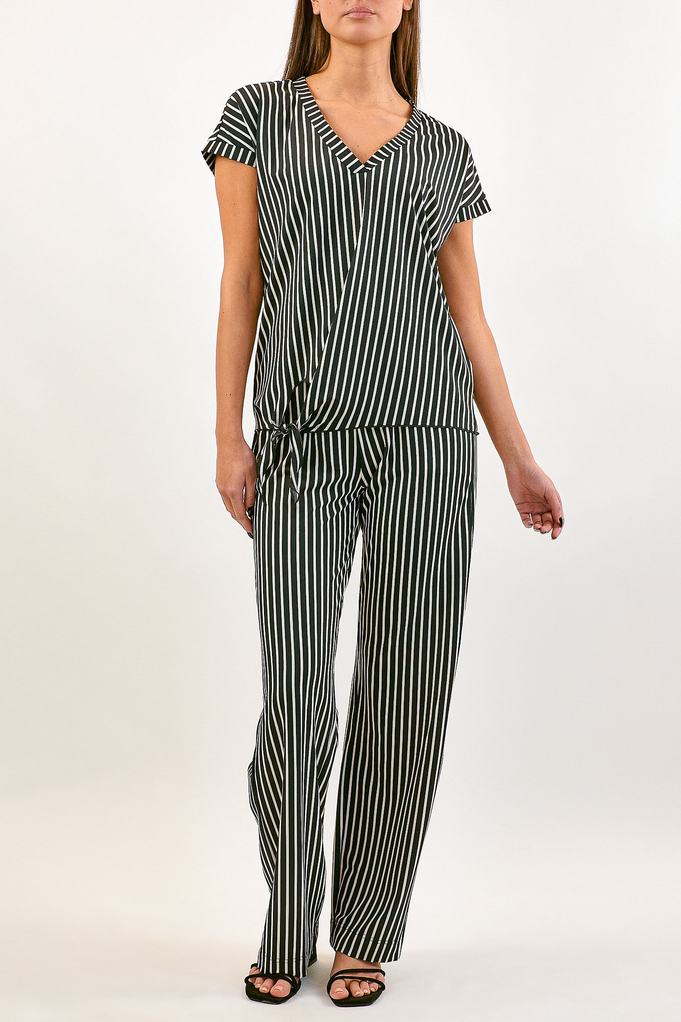 De Amara top heeft een V-hals en korte mouwen. Op de heup zit een speelse strik. Gemaakt van de comfortabele travelstof. Combineer met de Brigitte broek voor een matchende set in dezelfde print.