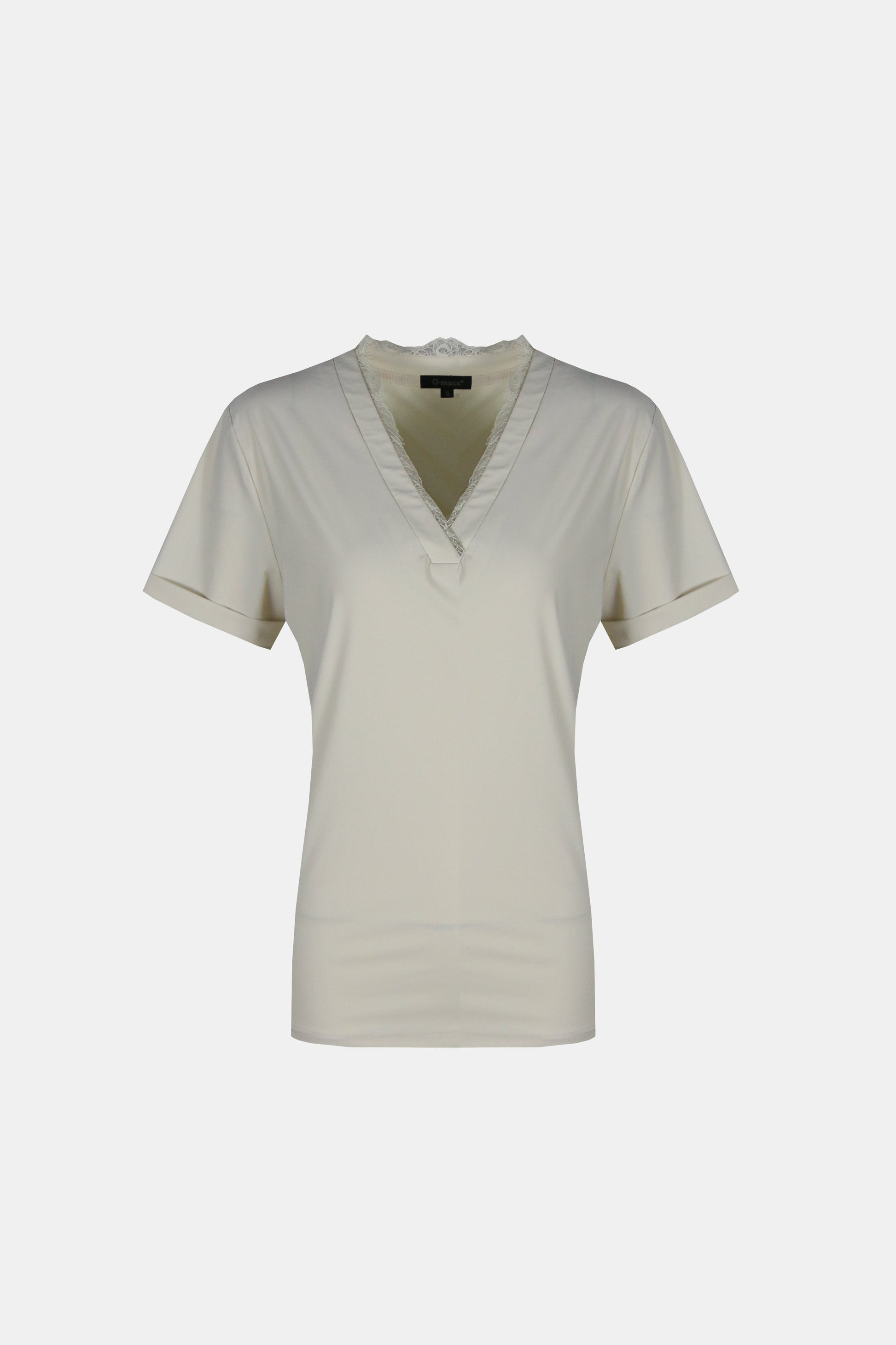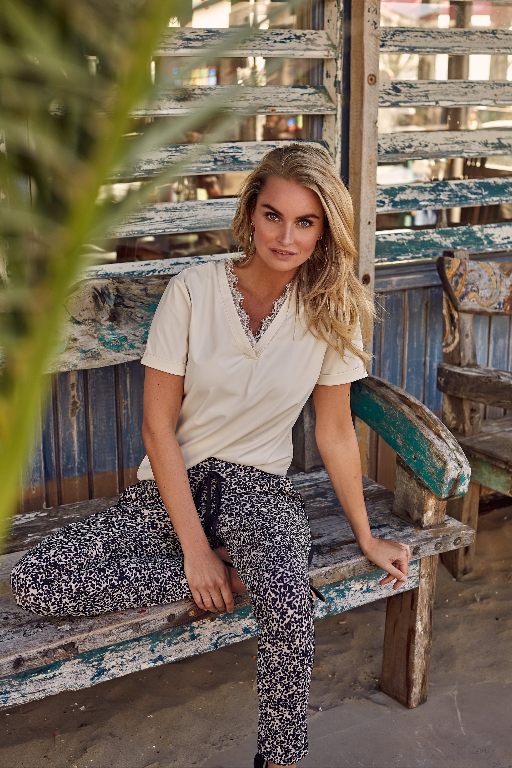 De Amelie top heeft korte mouwen en een kanten effect op de V-hals. De top is gemaakt van de comfortabele travelstof.
