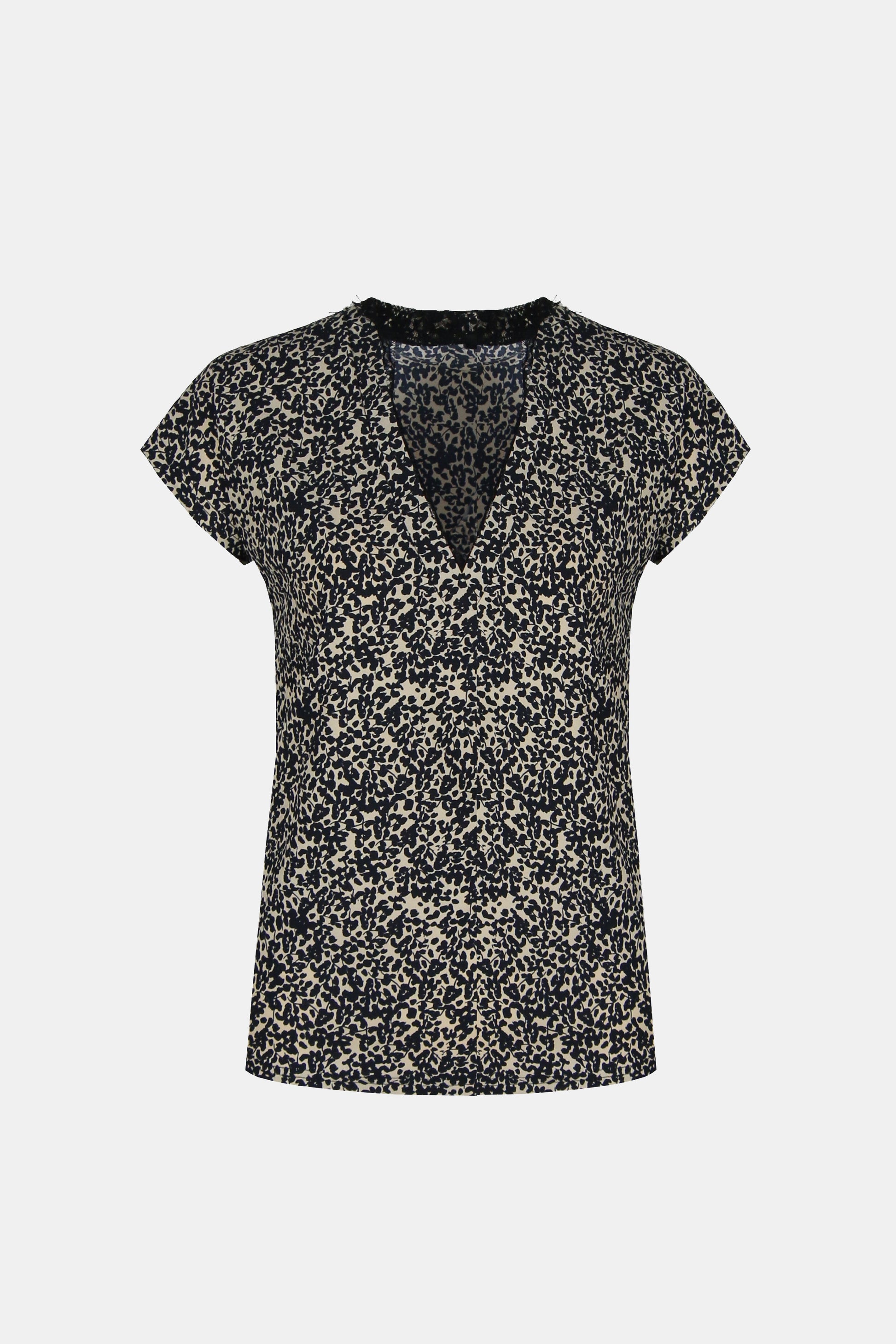 De Amelie top heeft een V-hals en korte mouwtjes. De top heeft een bruinzwarte print en is gemaakt van de comfortabele travelstof. Combineer met de Tiffany broek voor een matchende set in dezelfde print.
