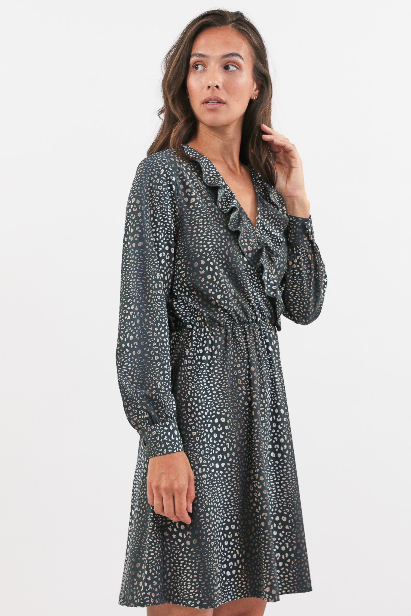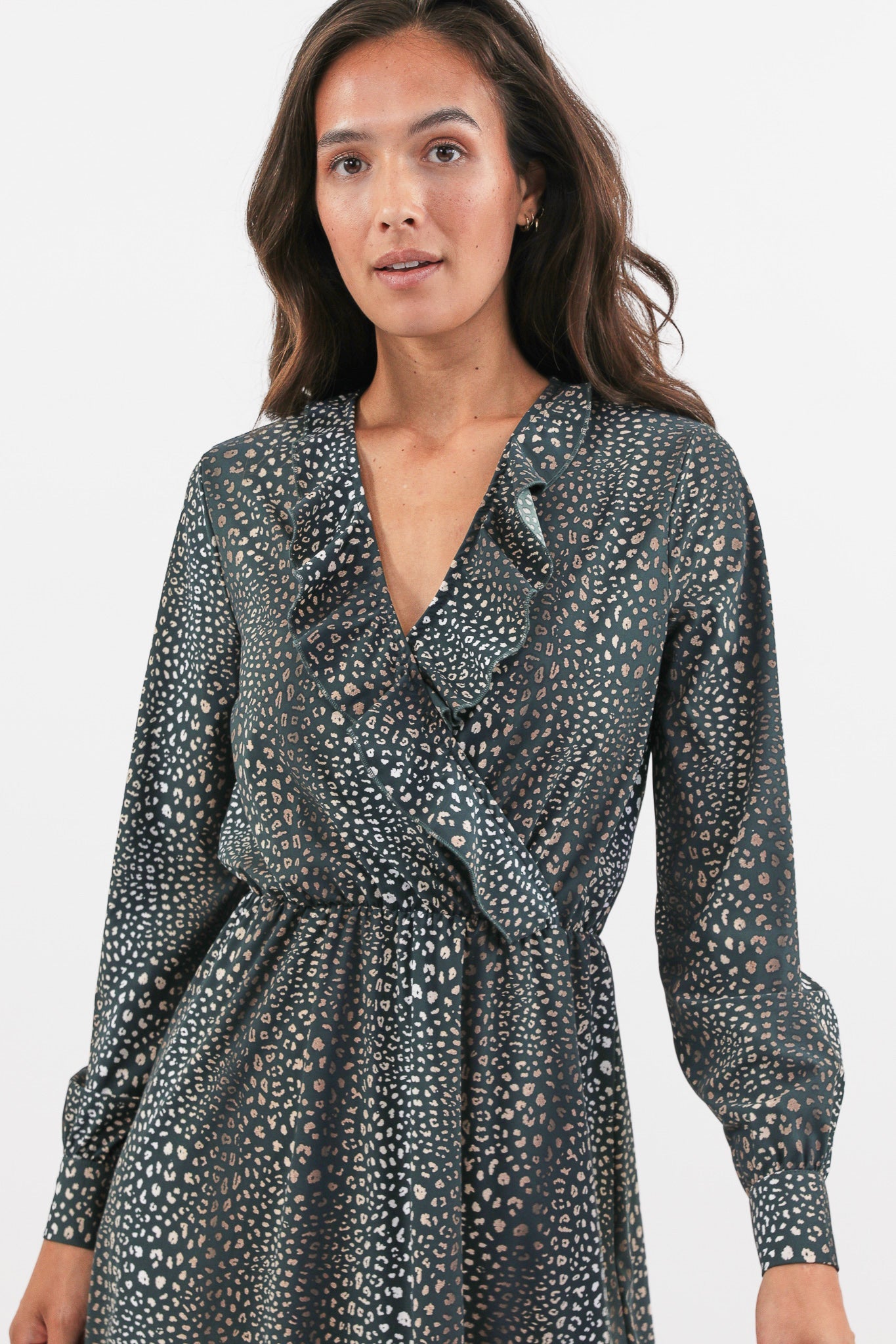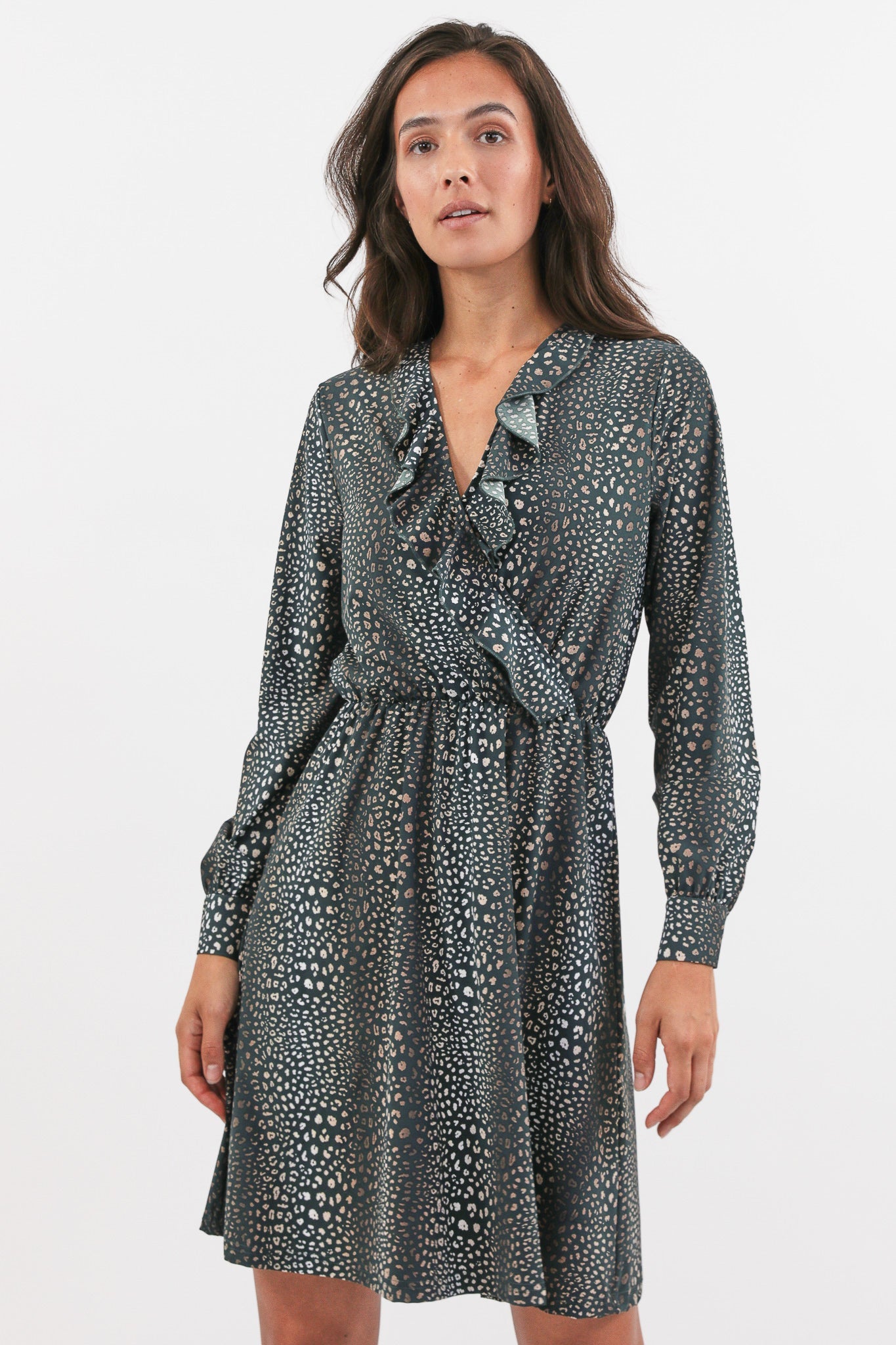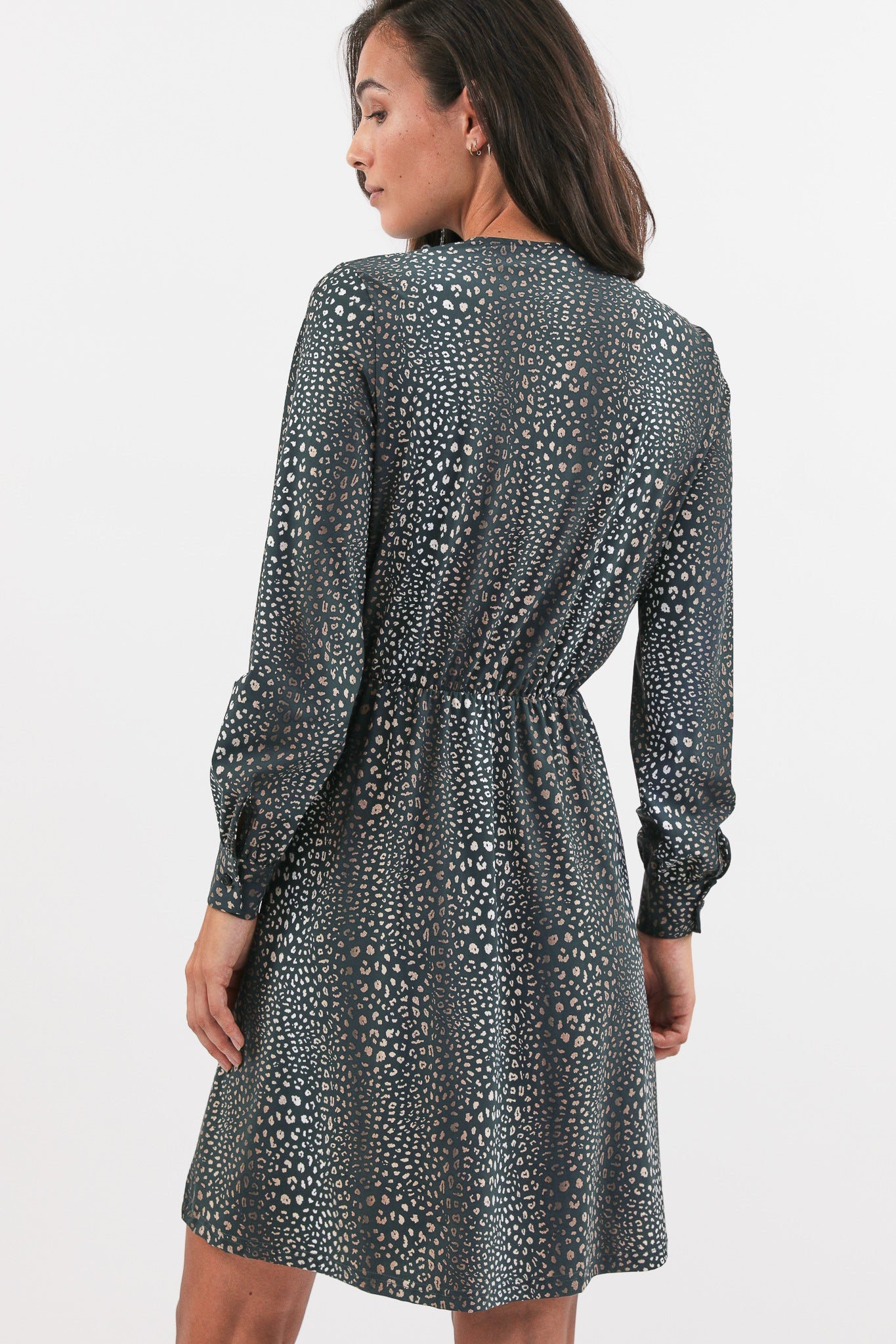 De Amy jurk heeft lange mouwen en een overslag aan de bovenkant. Om de taille zit een elastische rand. De jurk is voorzien van een print en is gemaakt van fijne en comfortabele travelstof. De jurk komt in het zwart/mix en groen mix.
