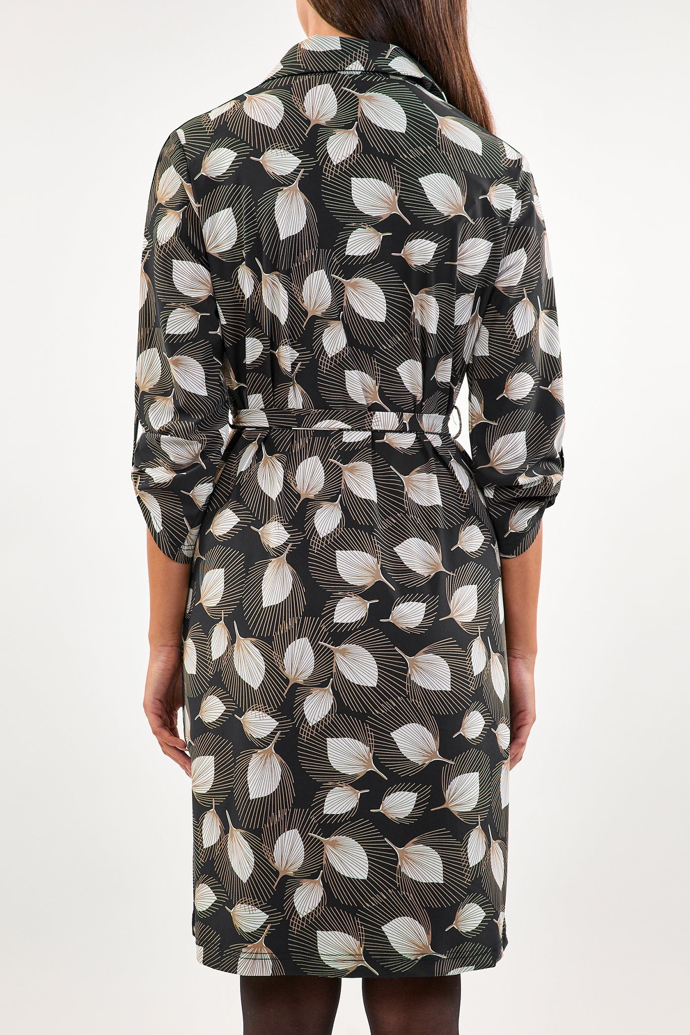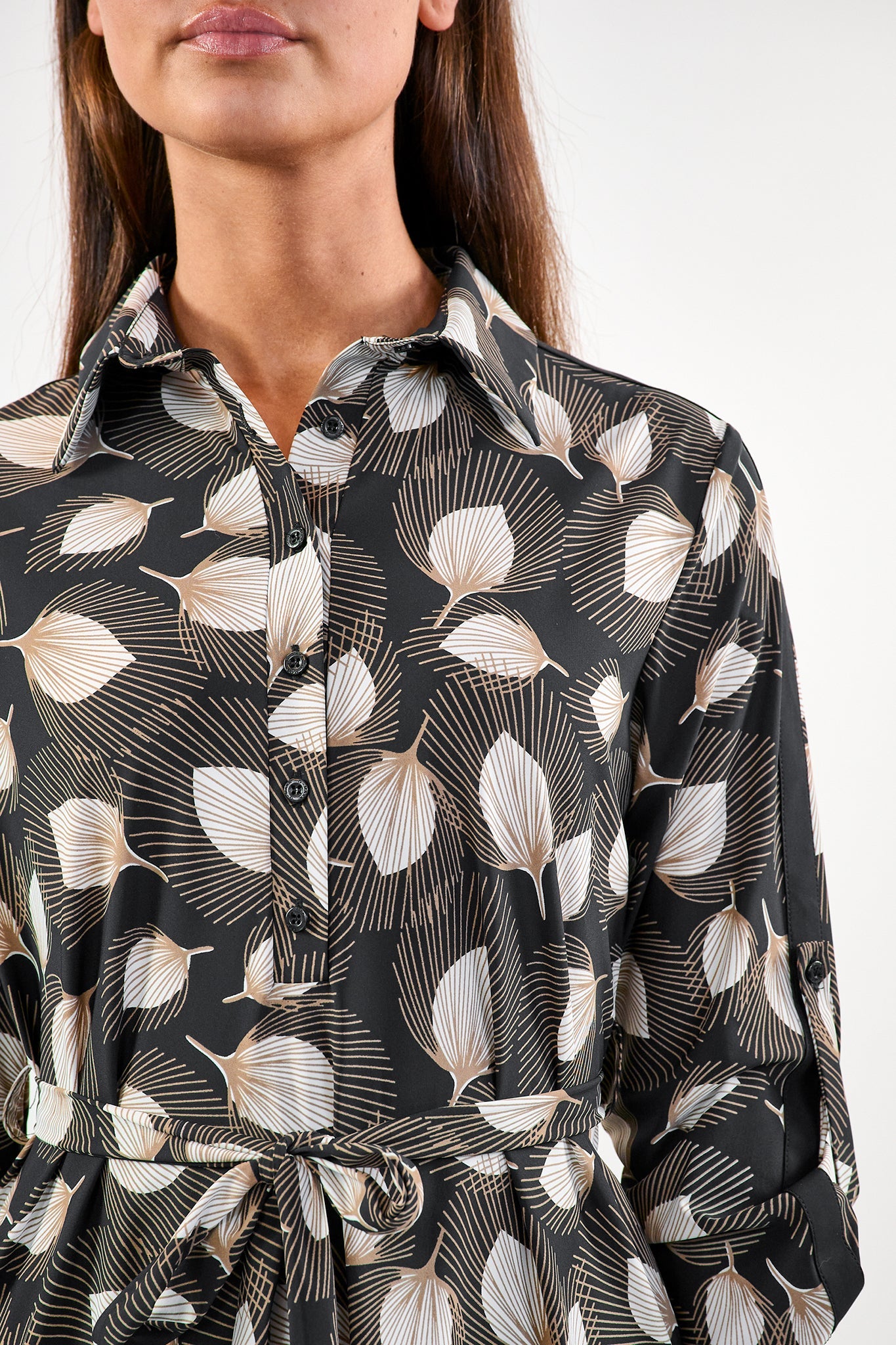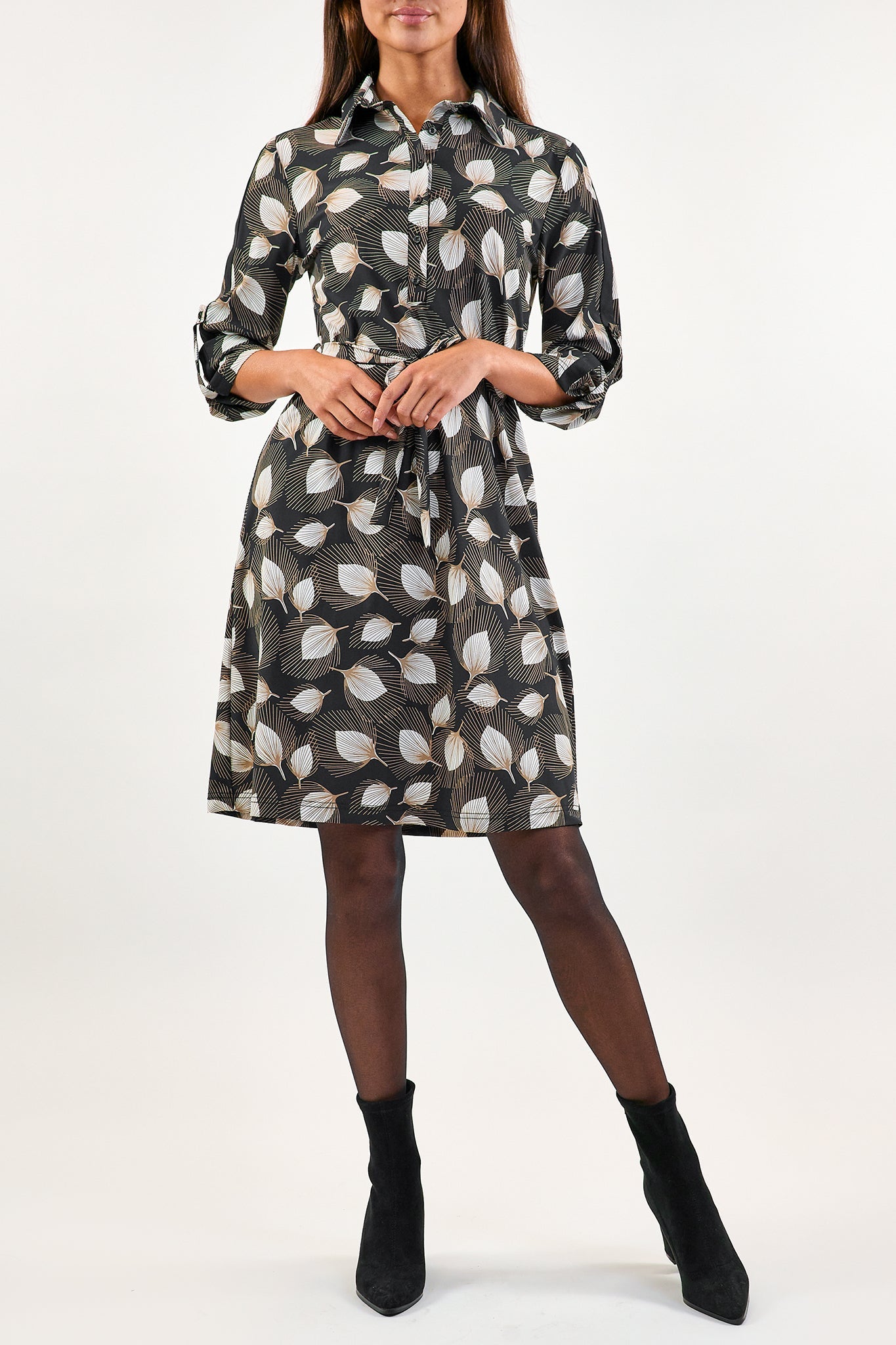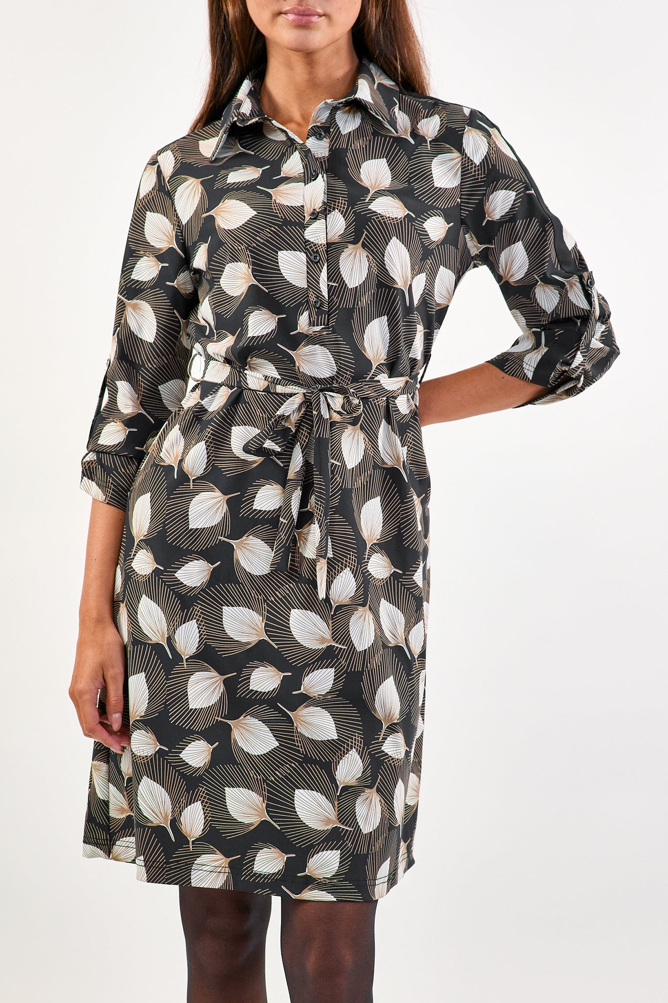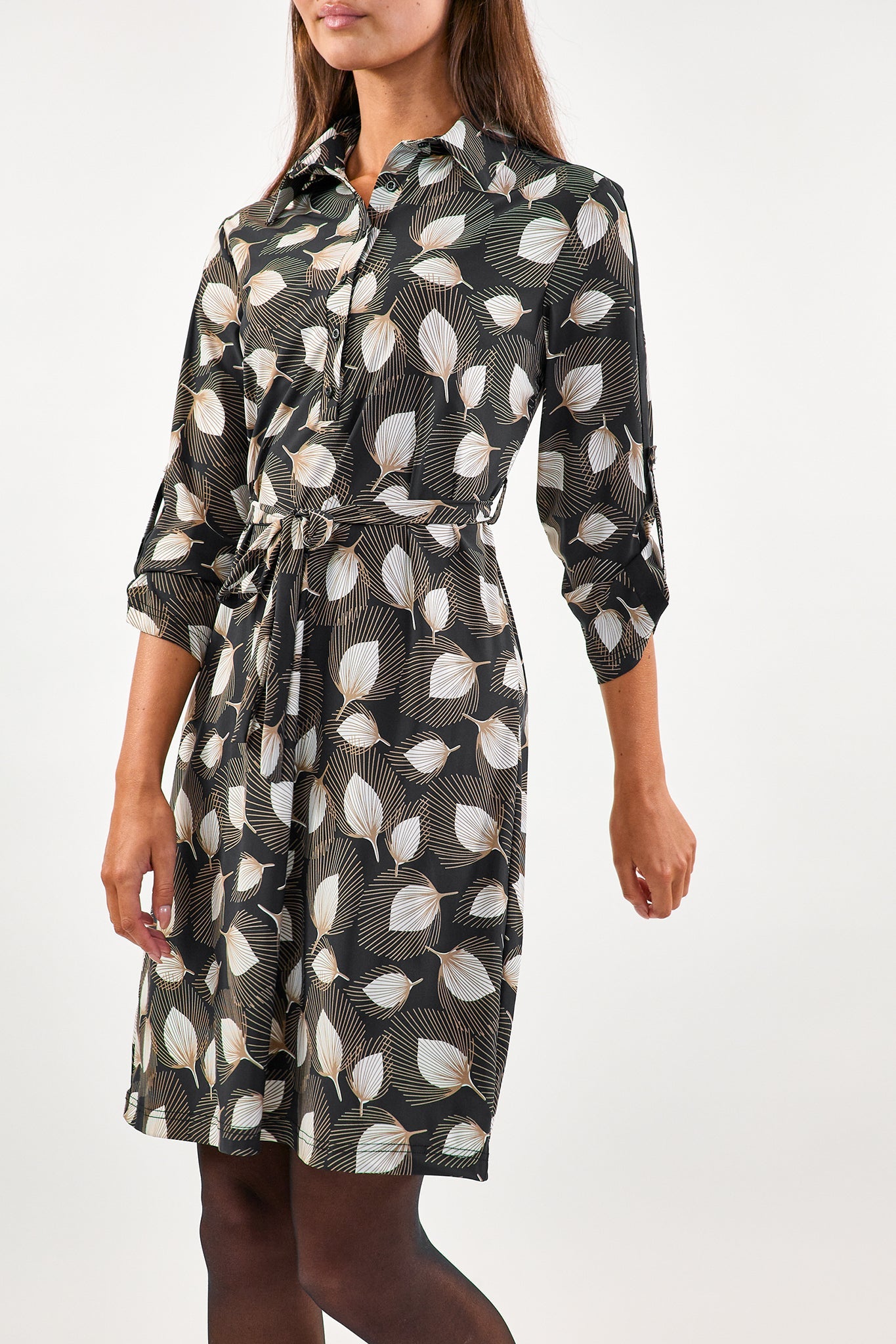 De Angie jurk heeft een opstaande kraag en is gemaakt van de comfortabele travelstof. Hierdoor bevat je jurk stretch. Op de voorkant heeft de jurk knoopjes. Een strikkoord om de middel zorgt voor een getailleerd effect.