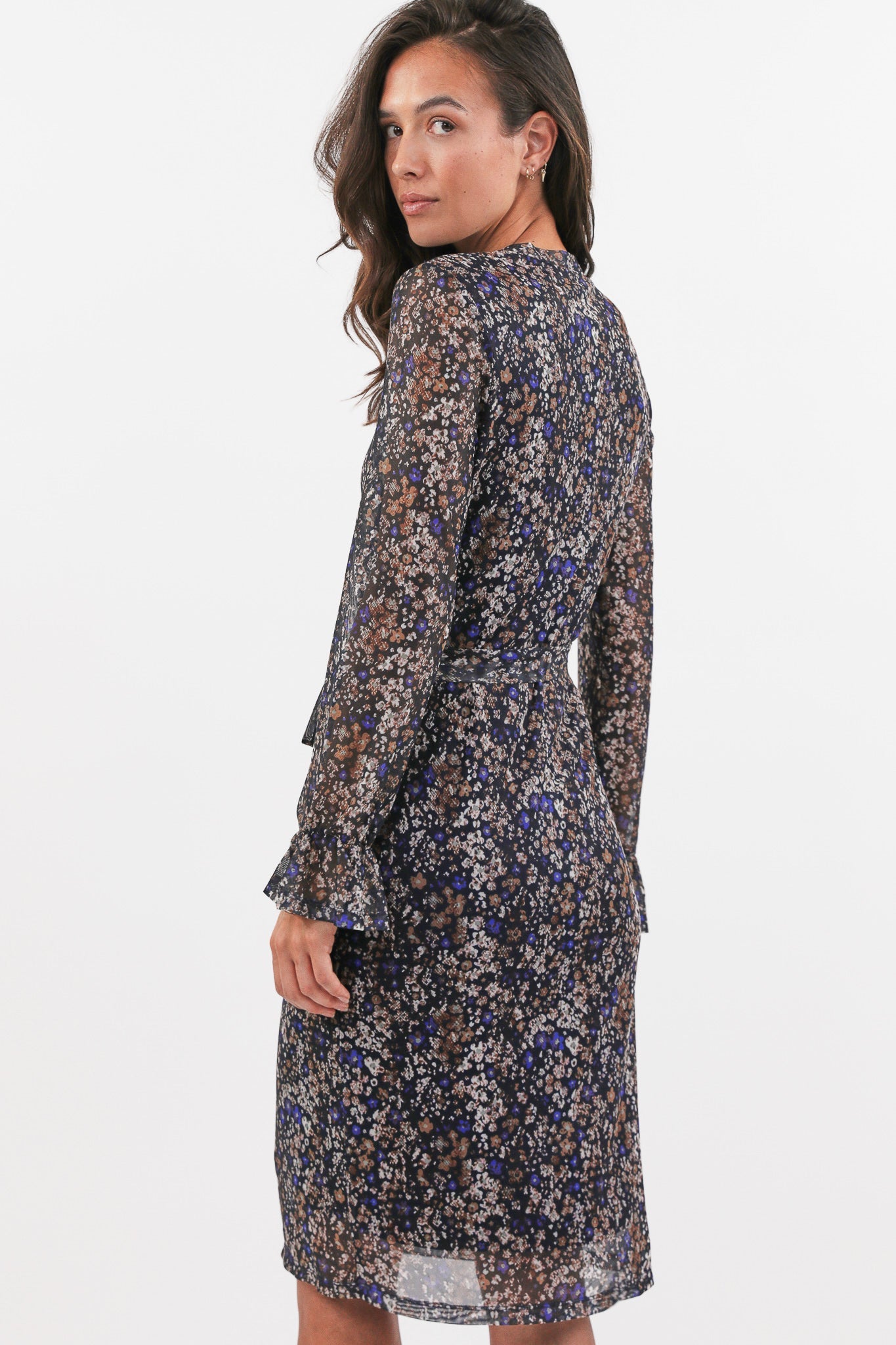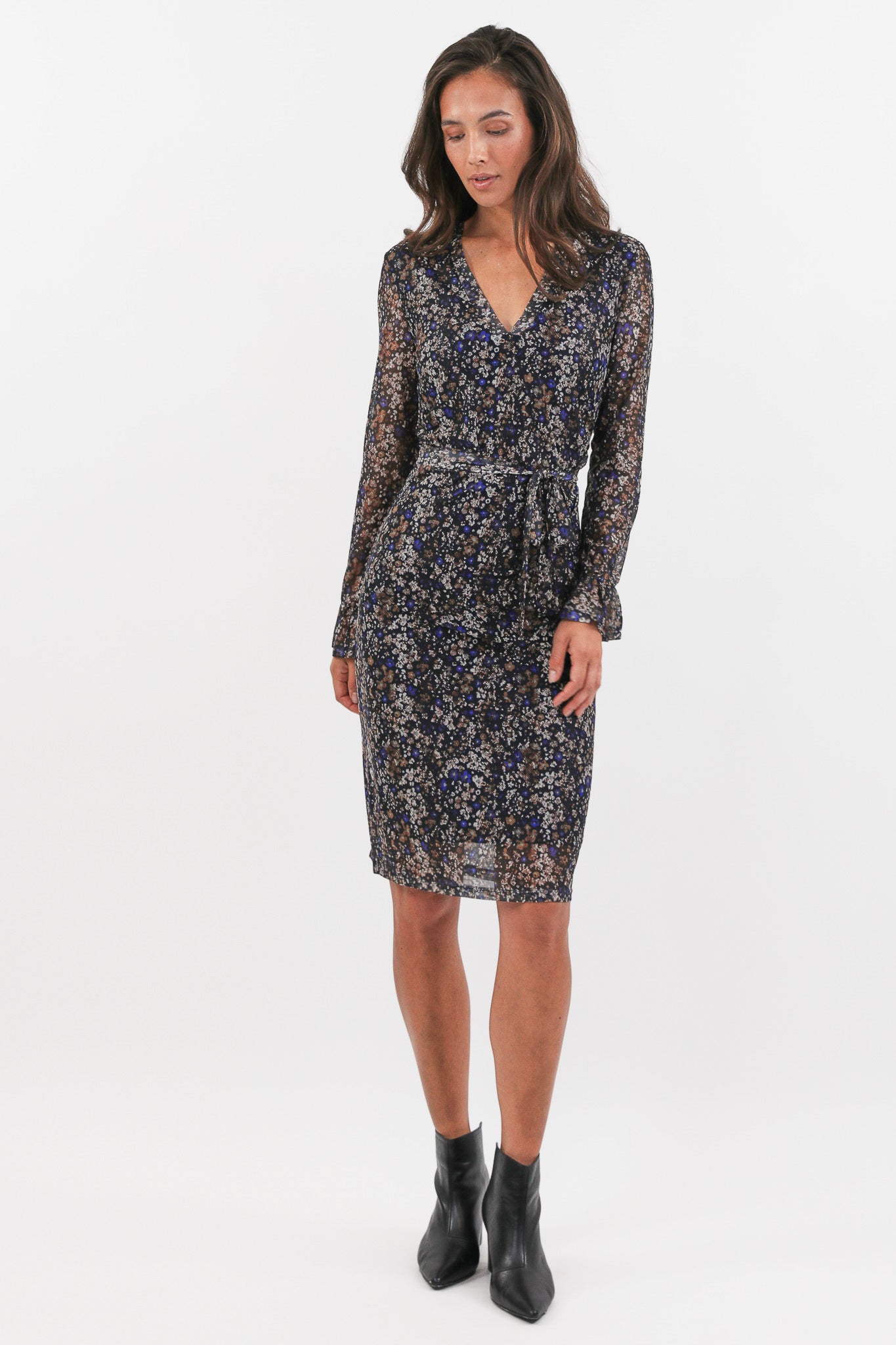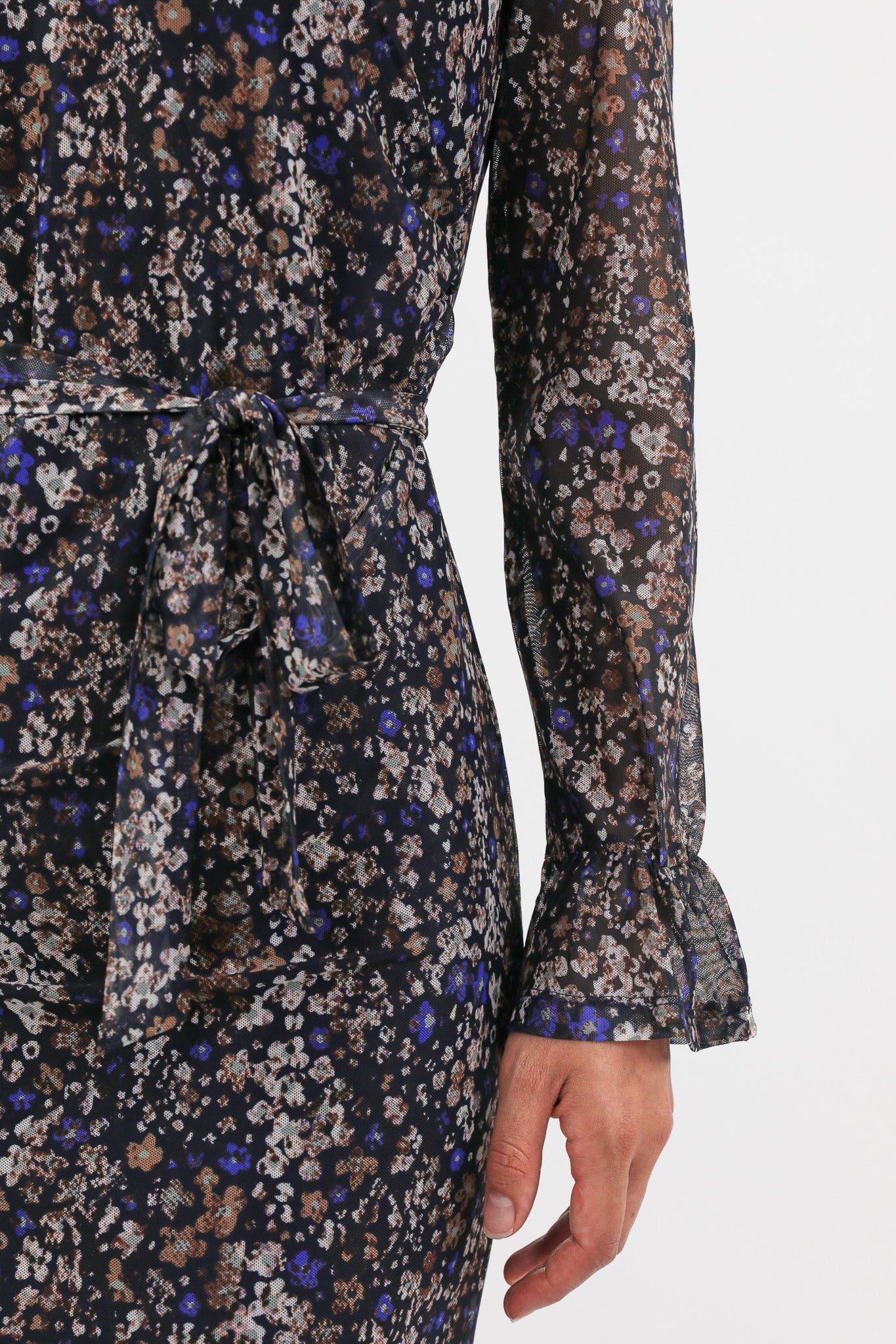De Aukje jurk heeft transparante mouwen welke uitlopen aan de onderkant. De jurk heeft een V-hals en om de taille zit een bindceintuur. De jurk valt net boven de knie