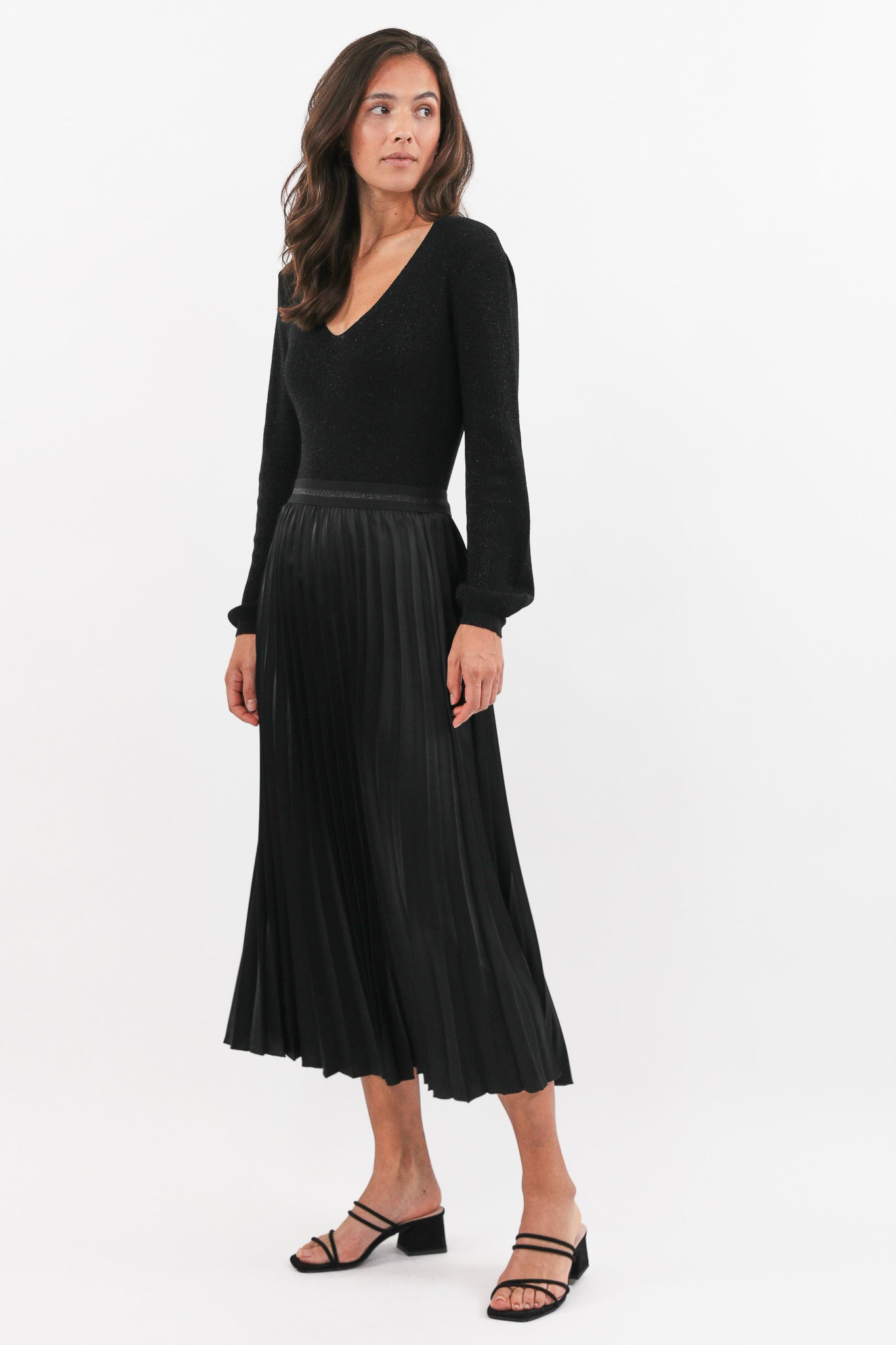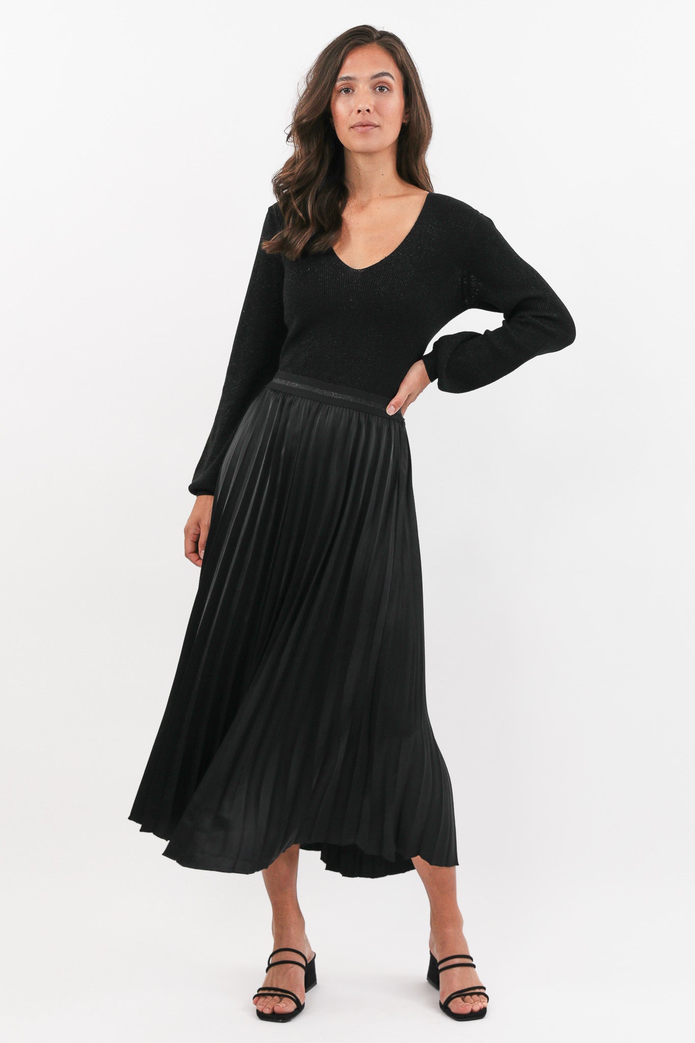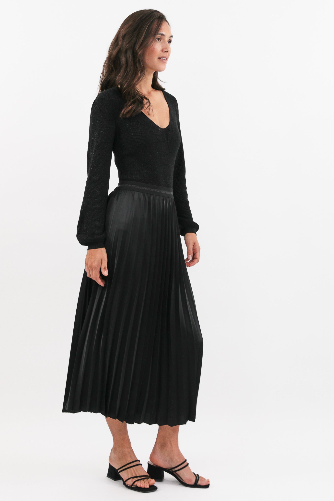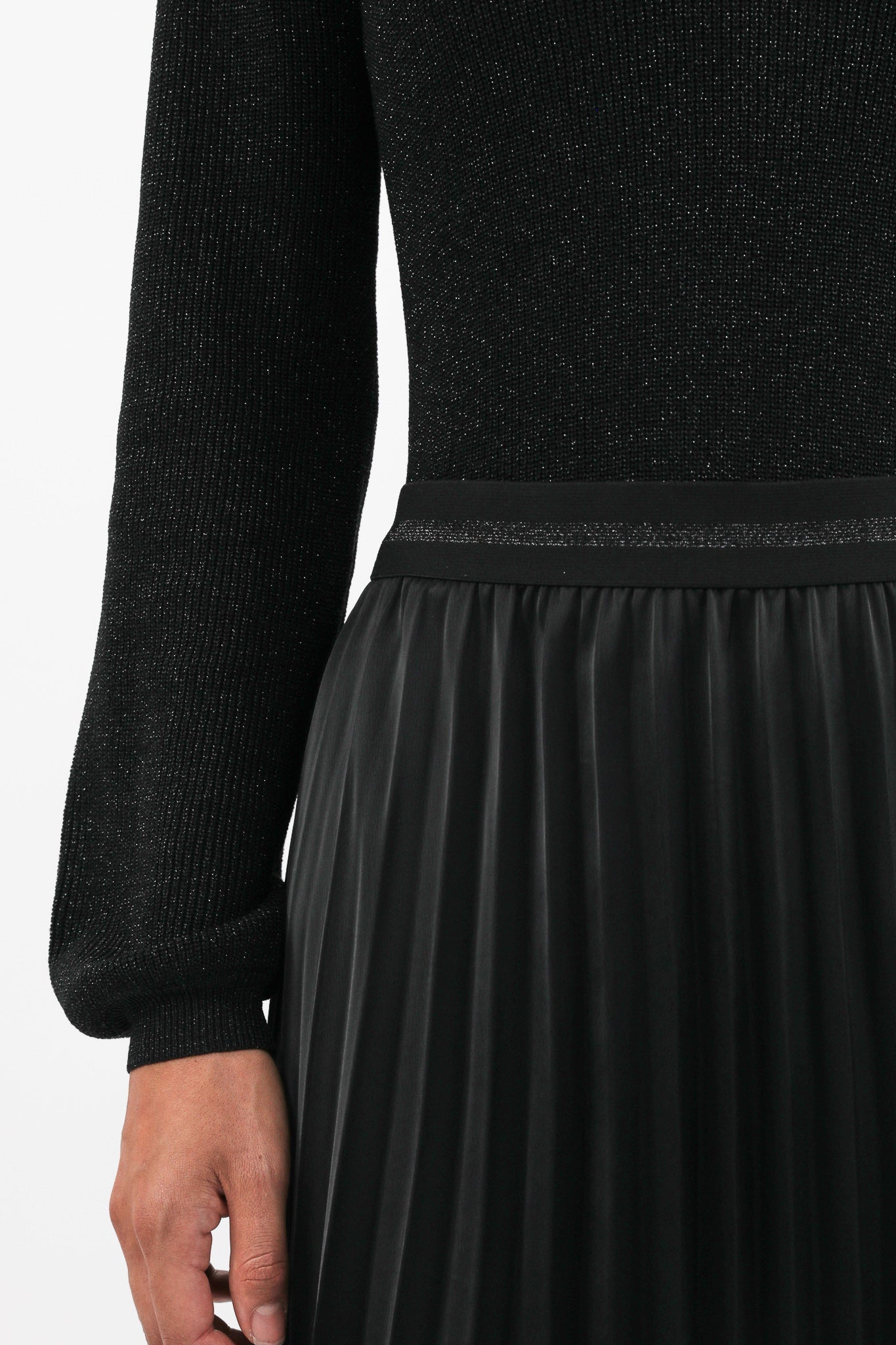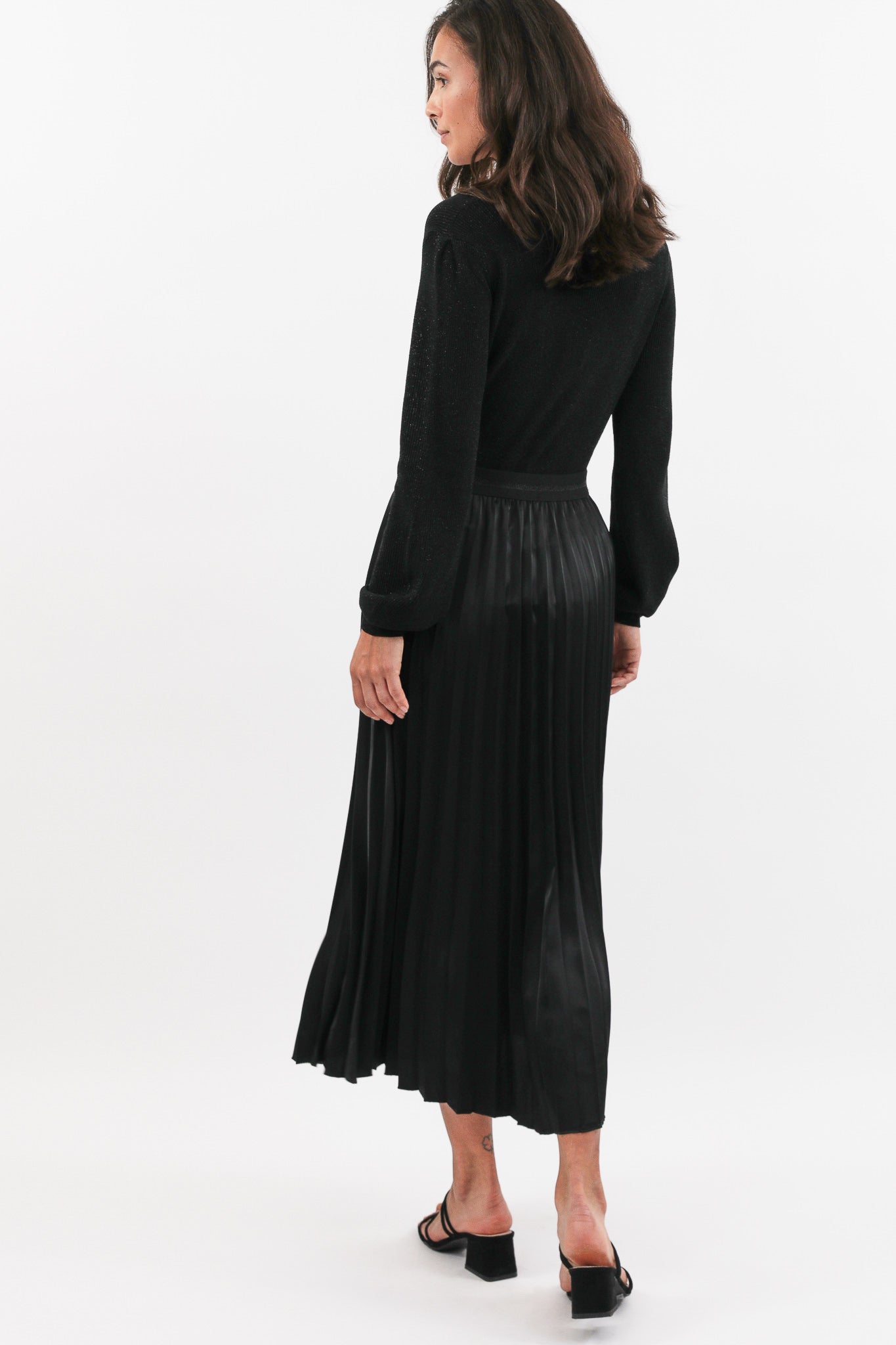 De Avril rok is een midi plissé rok met een elastische tailleband. De tailleband is voorzien van een glitter streep.