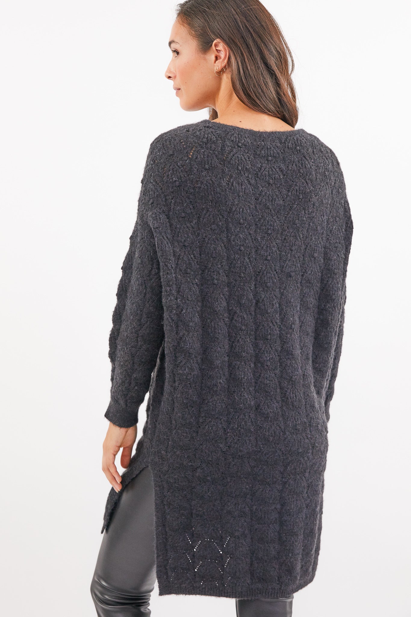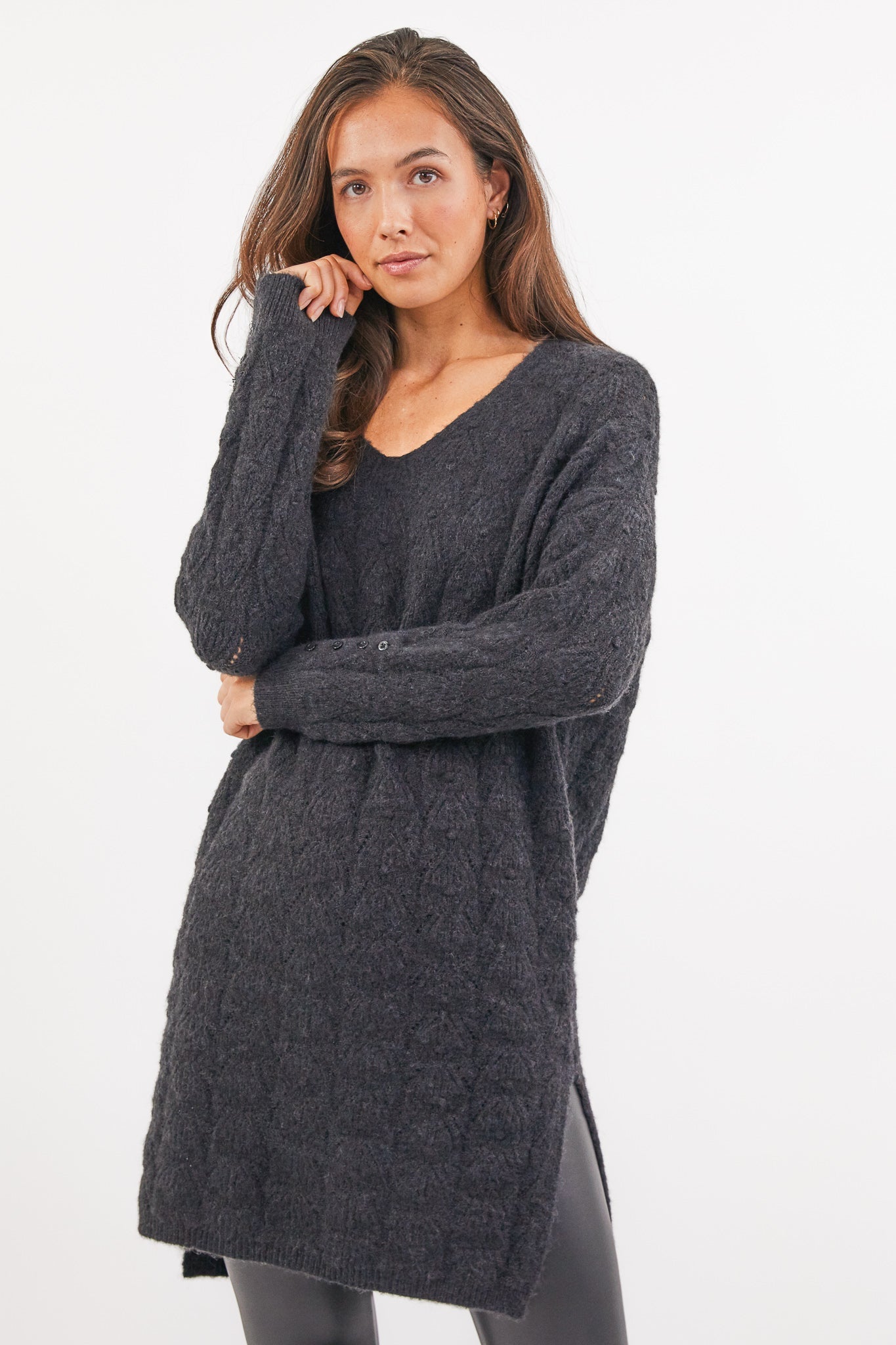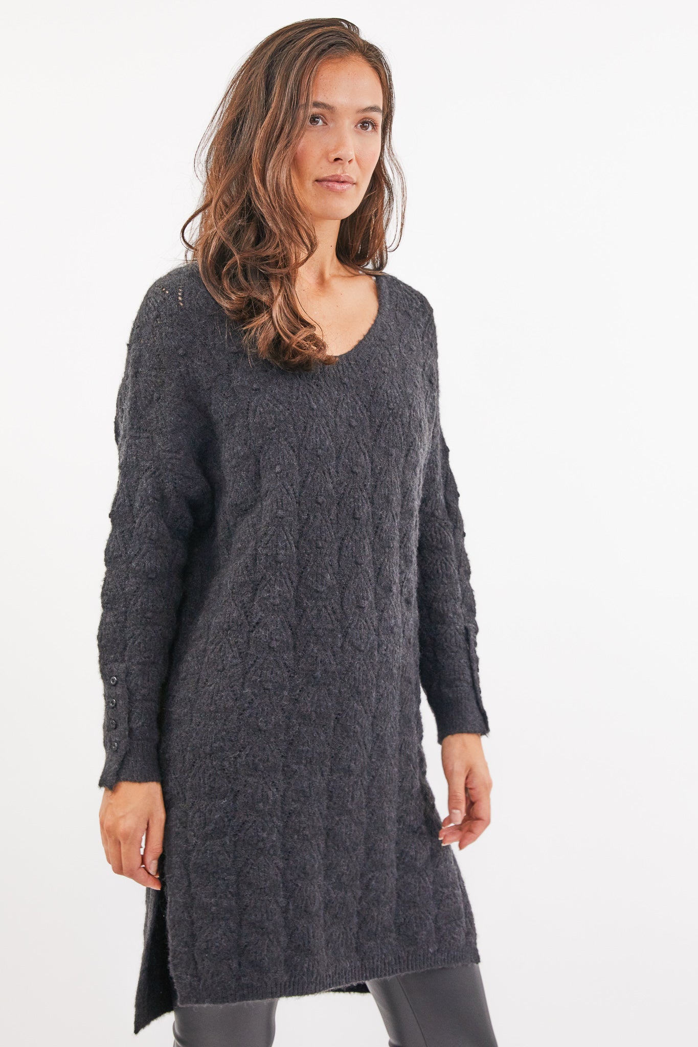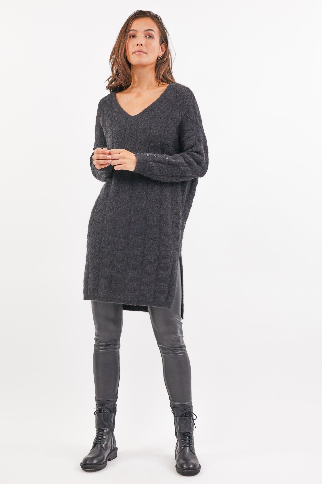 De Babet trui/jurk heeft lange mouwen en een V-hals. Het is een grof gebreide kabeltrui. De onderkant bevat korte splits en de mouwen zijn afgewerkt met knoopjes.