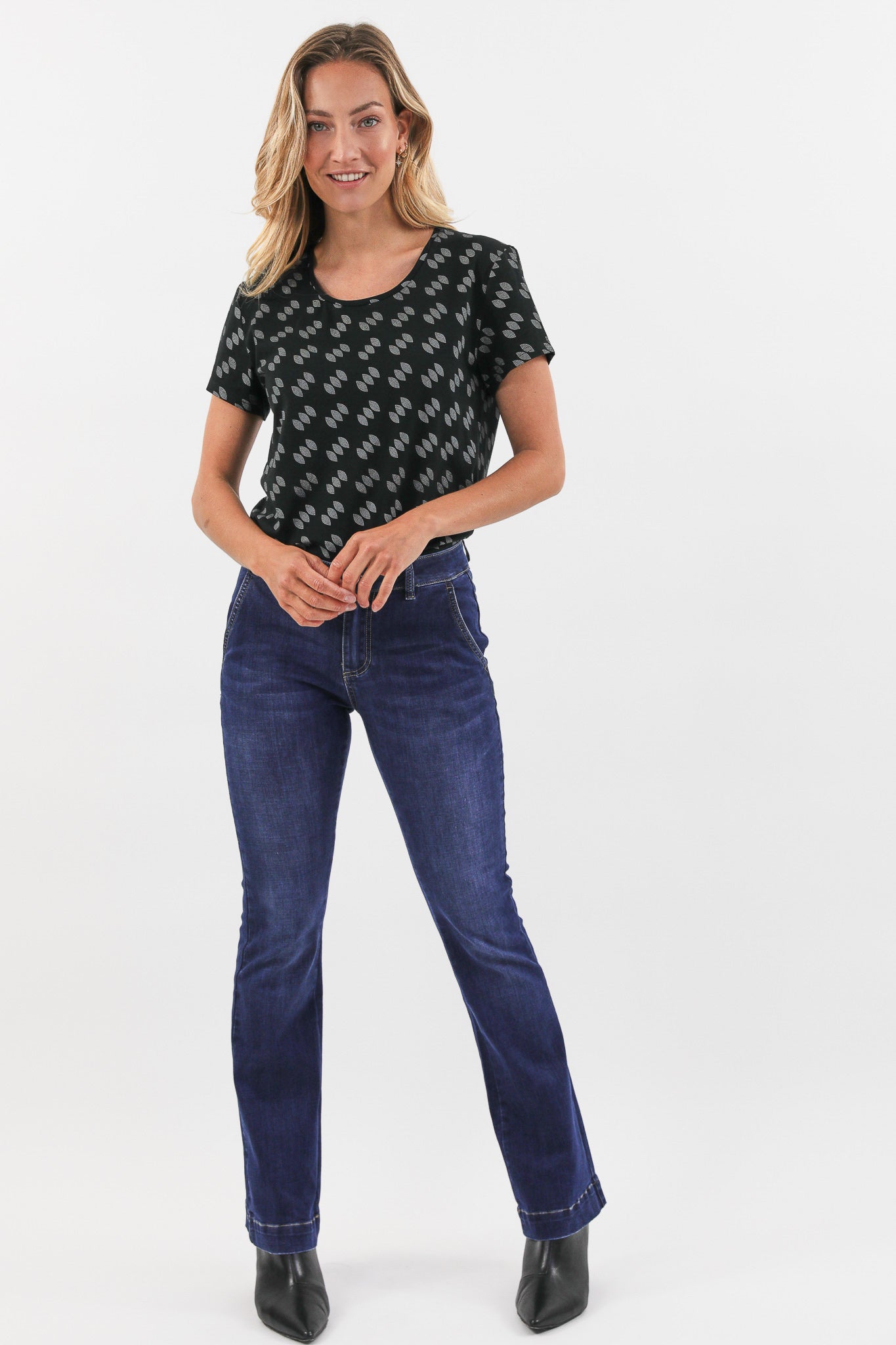 Het Babs T-shirt heeft korte mouwen en een ronde hals. De top is voorzien van een print en is gemaakt van fijne en comfortabele travelstof. De top komt in het zwart/zand en zwart/zilver.
