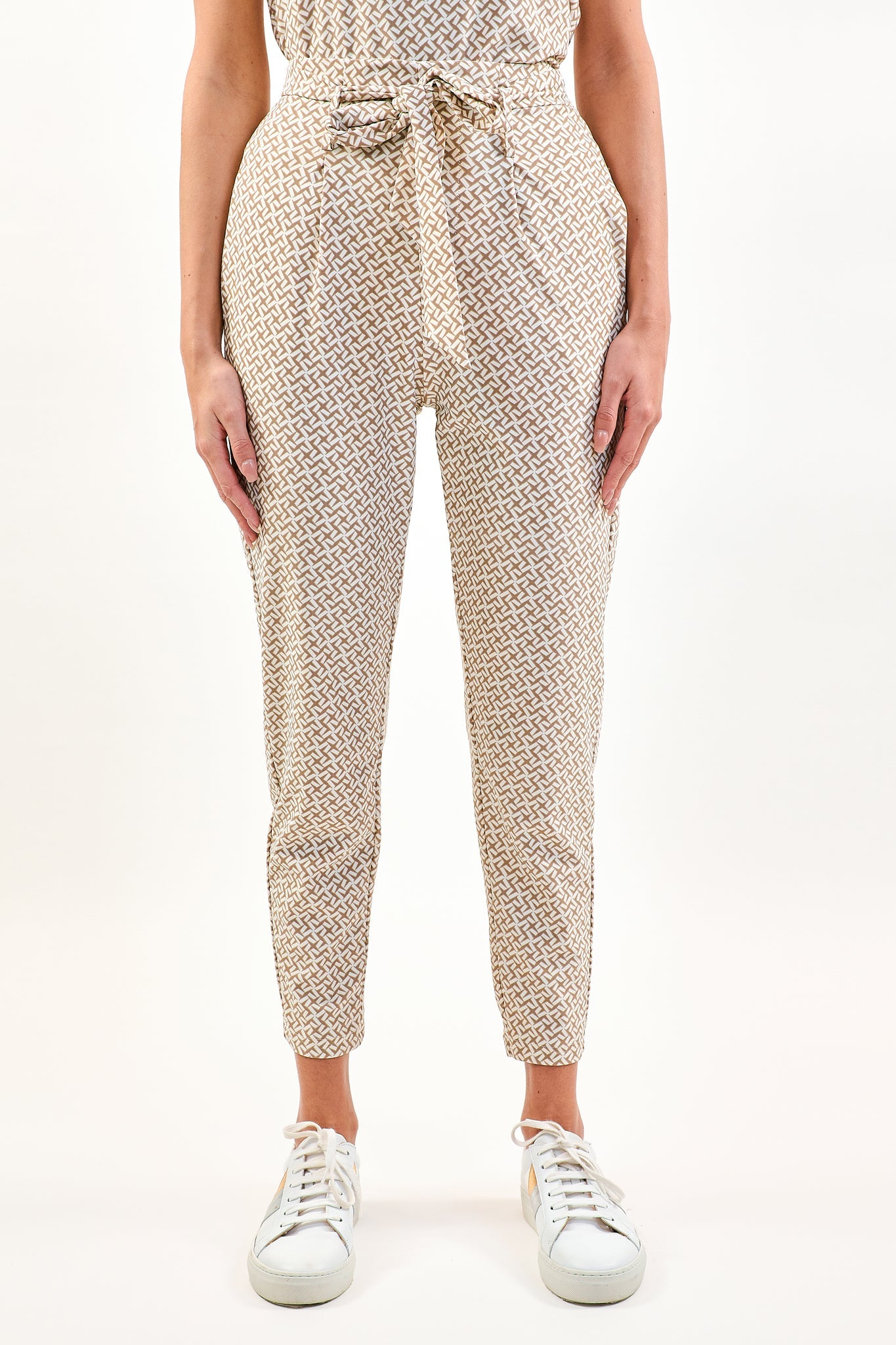 De Bernadette broek heeft een bruine grafische print en heeft een aansluitend model met striksluiting. Combineer de broek met de Angel haltertop of de Liesbeth top voor een complete set.
