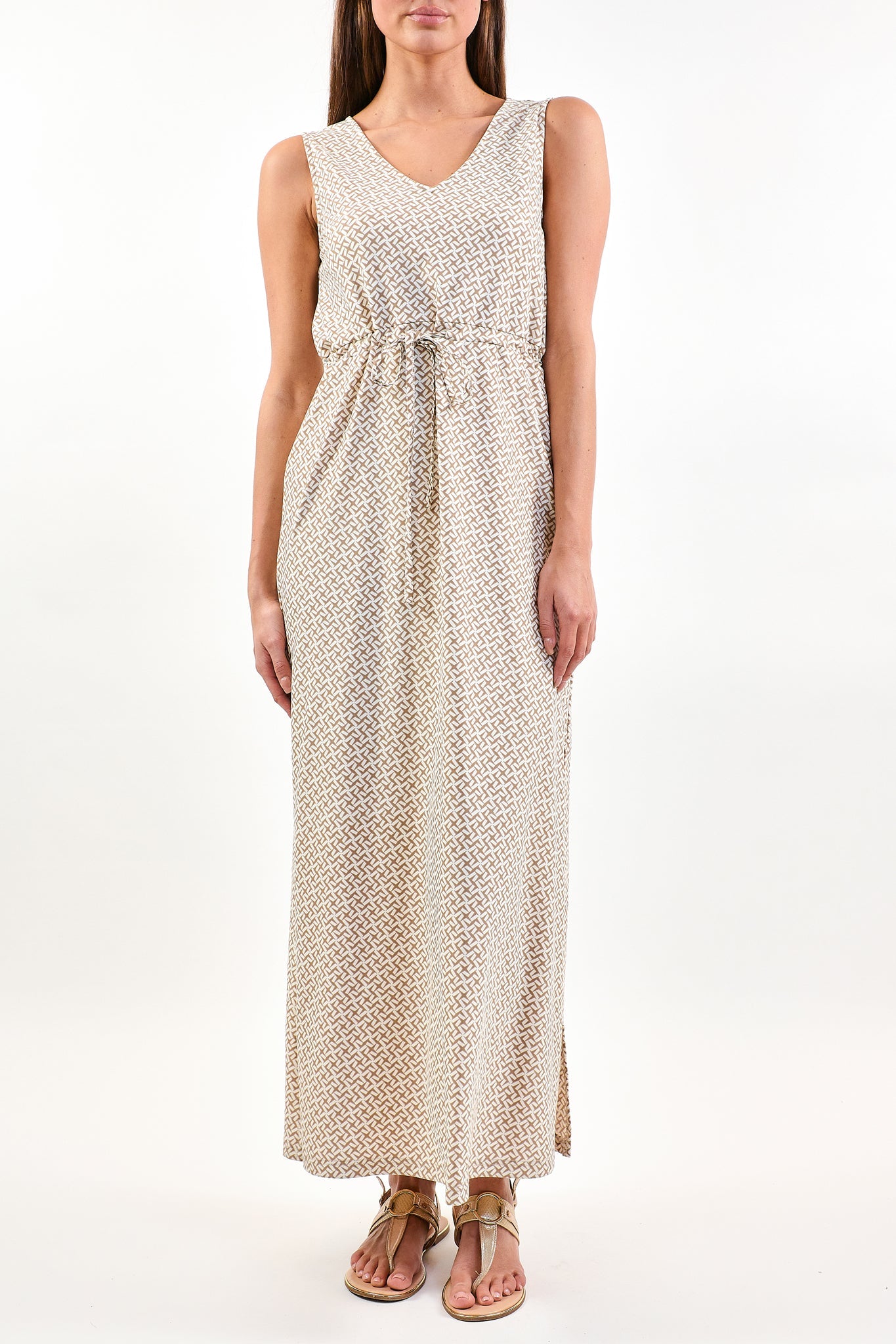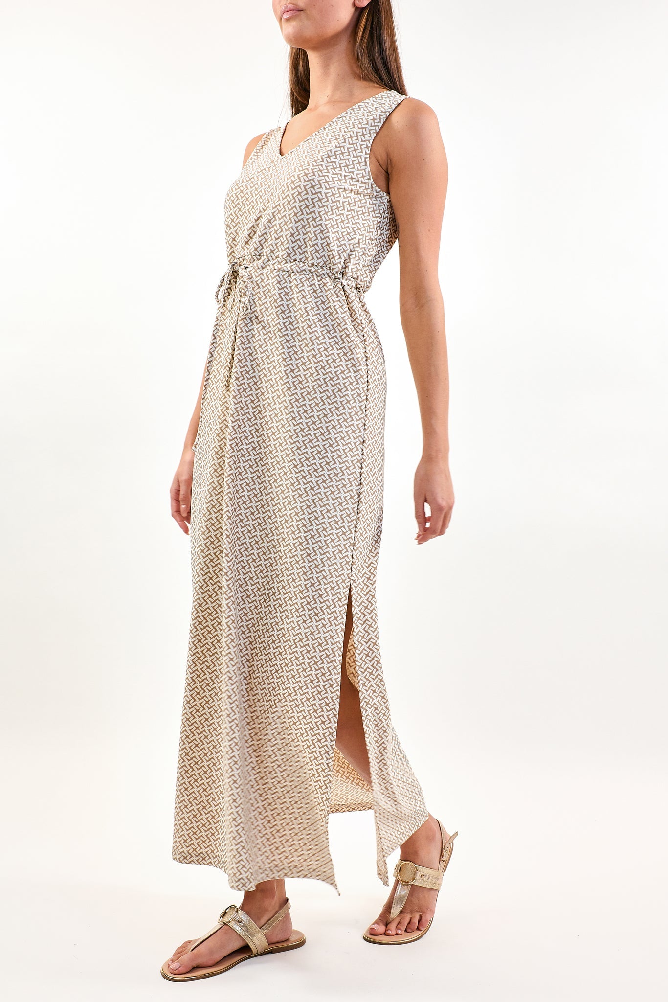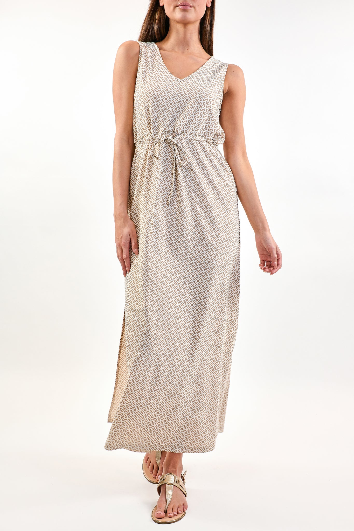 De Carize jurk is heeft een grafische print in het bruin. Deze jurk is mouwloos, valt over de knie en heeft een strikceintuur in de taille.
