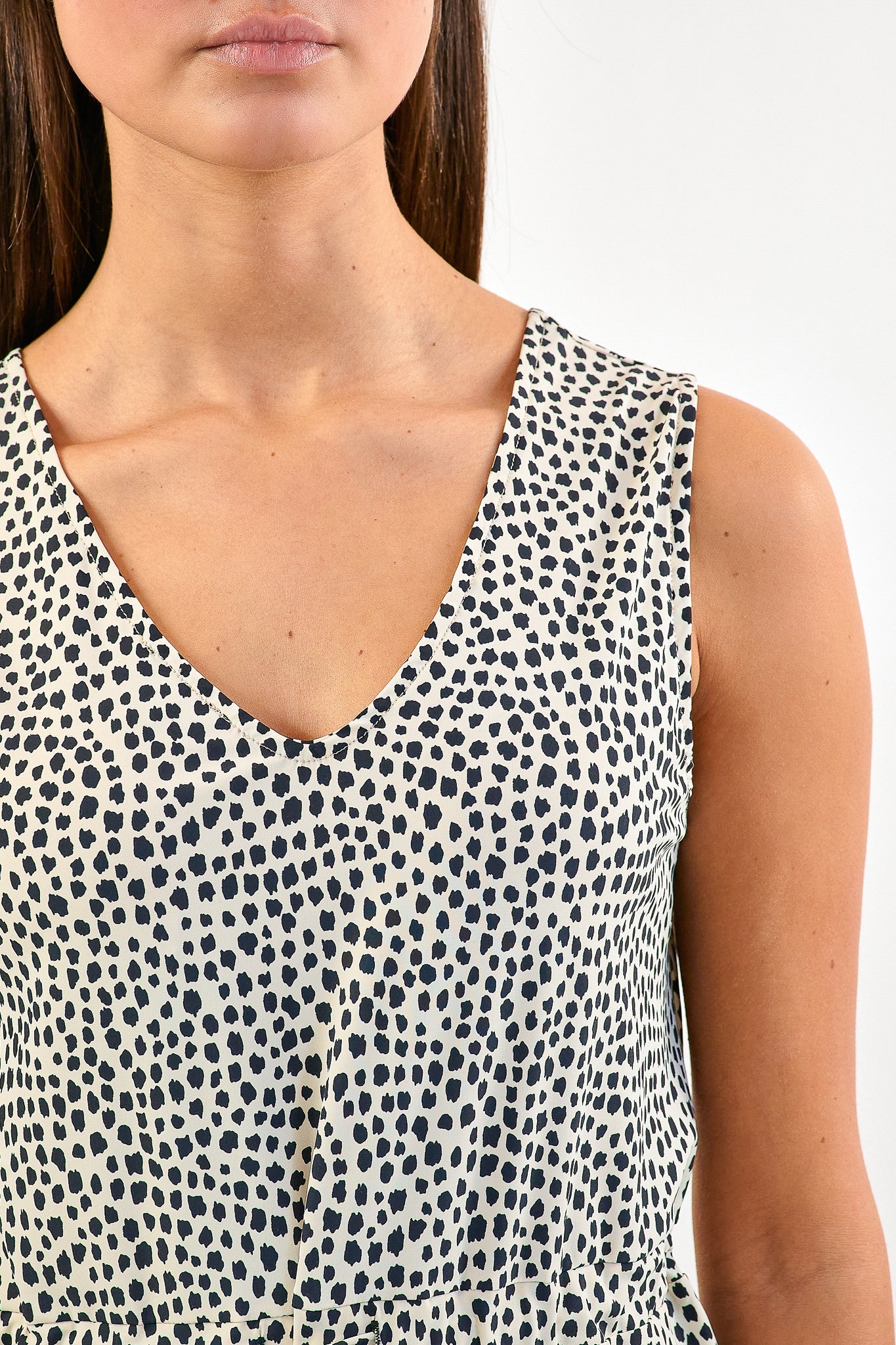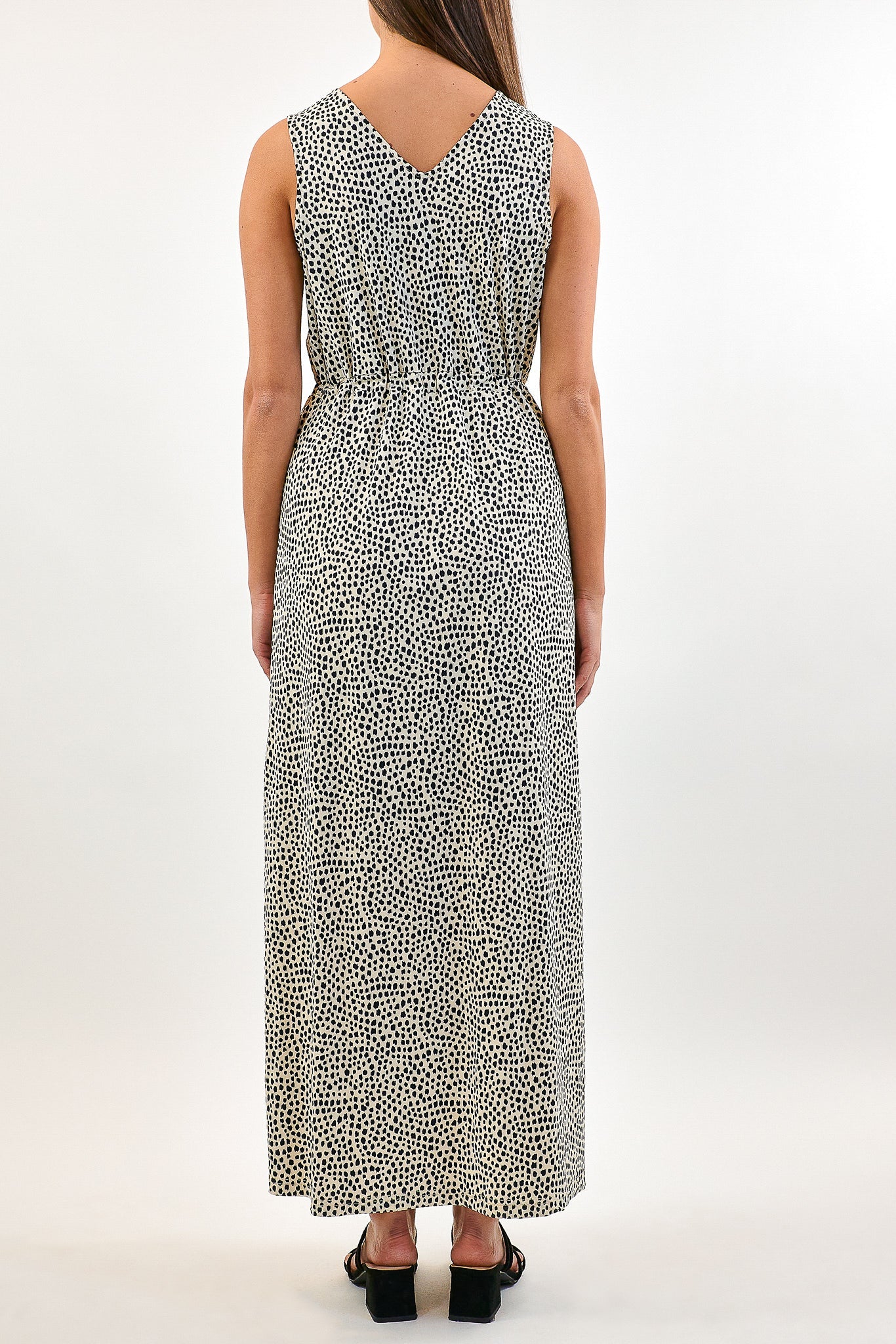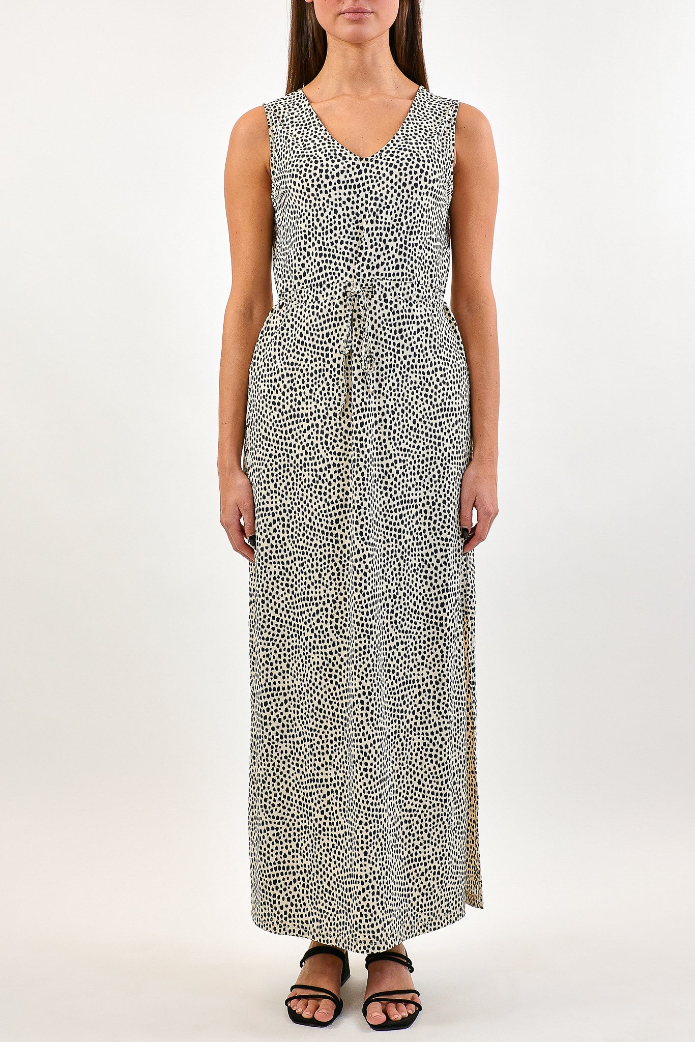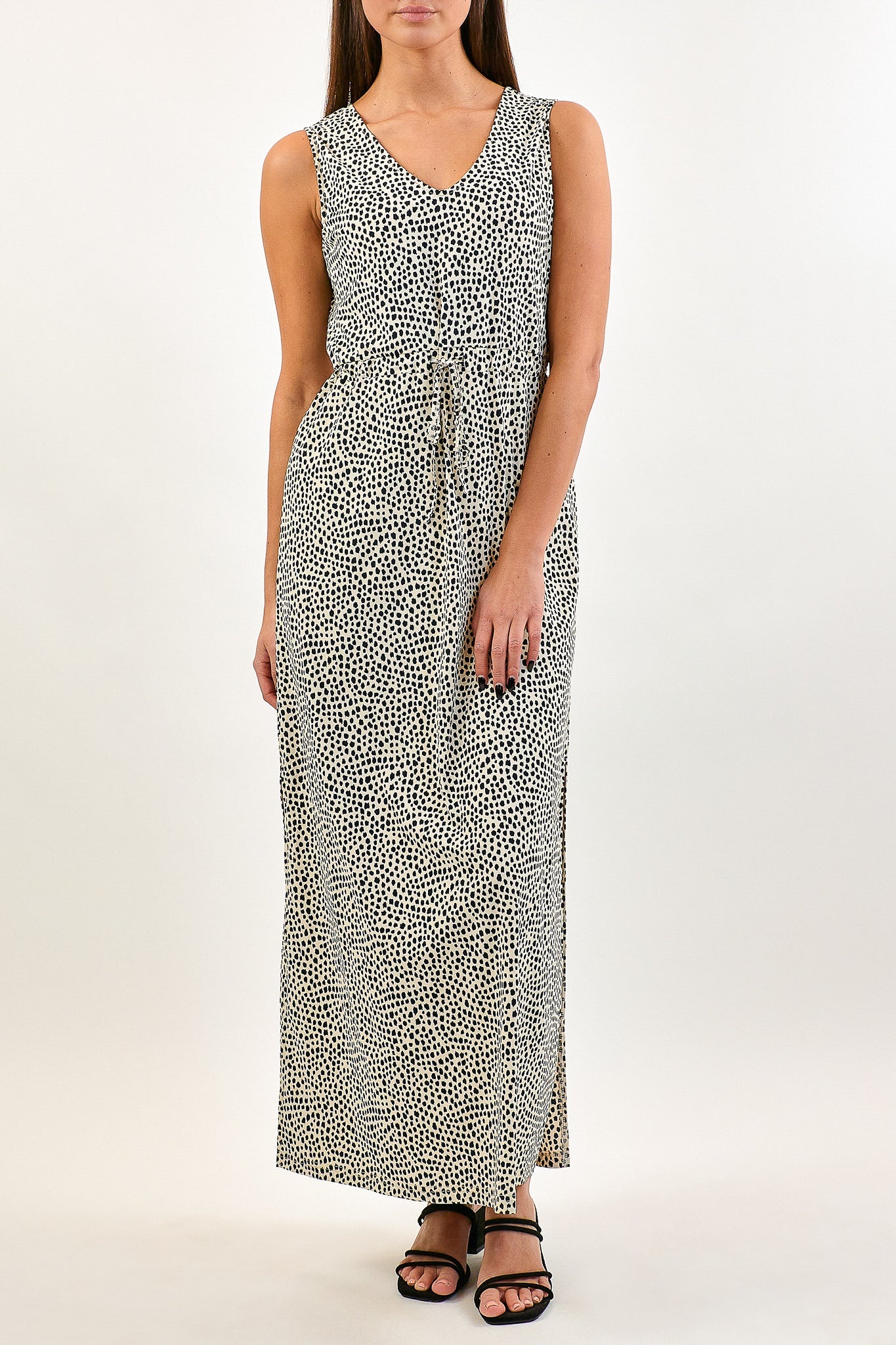 De Carize jurk heeft een ronde hals en brede banden op de schouders. De midi jurk heeft een speelse print en is gemaakt van de comfortabele travelstof. De jurk komt in de kleuren zand/mix en zand/zwart.