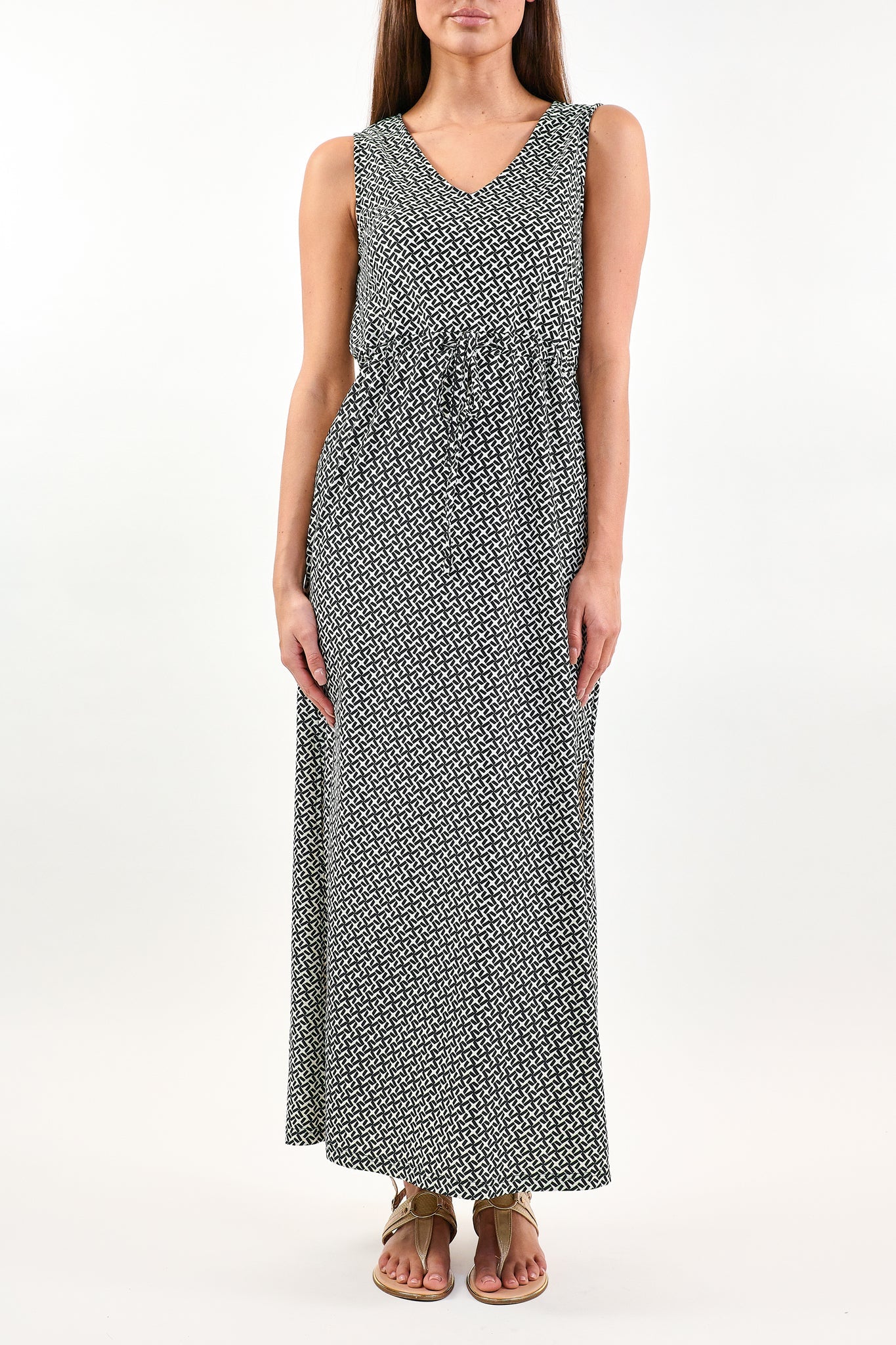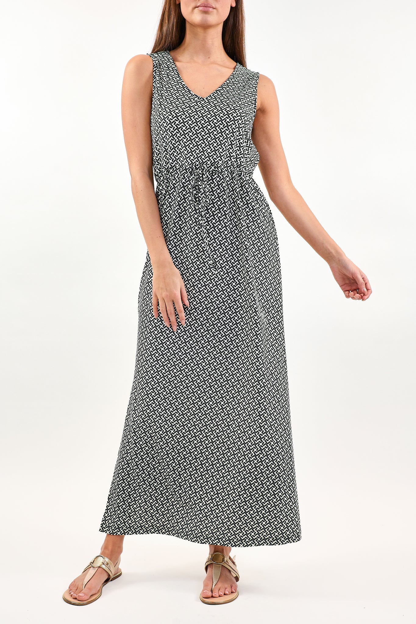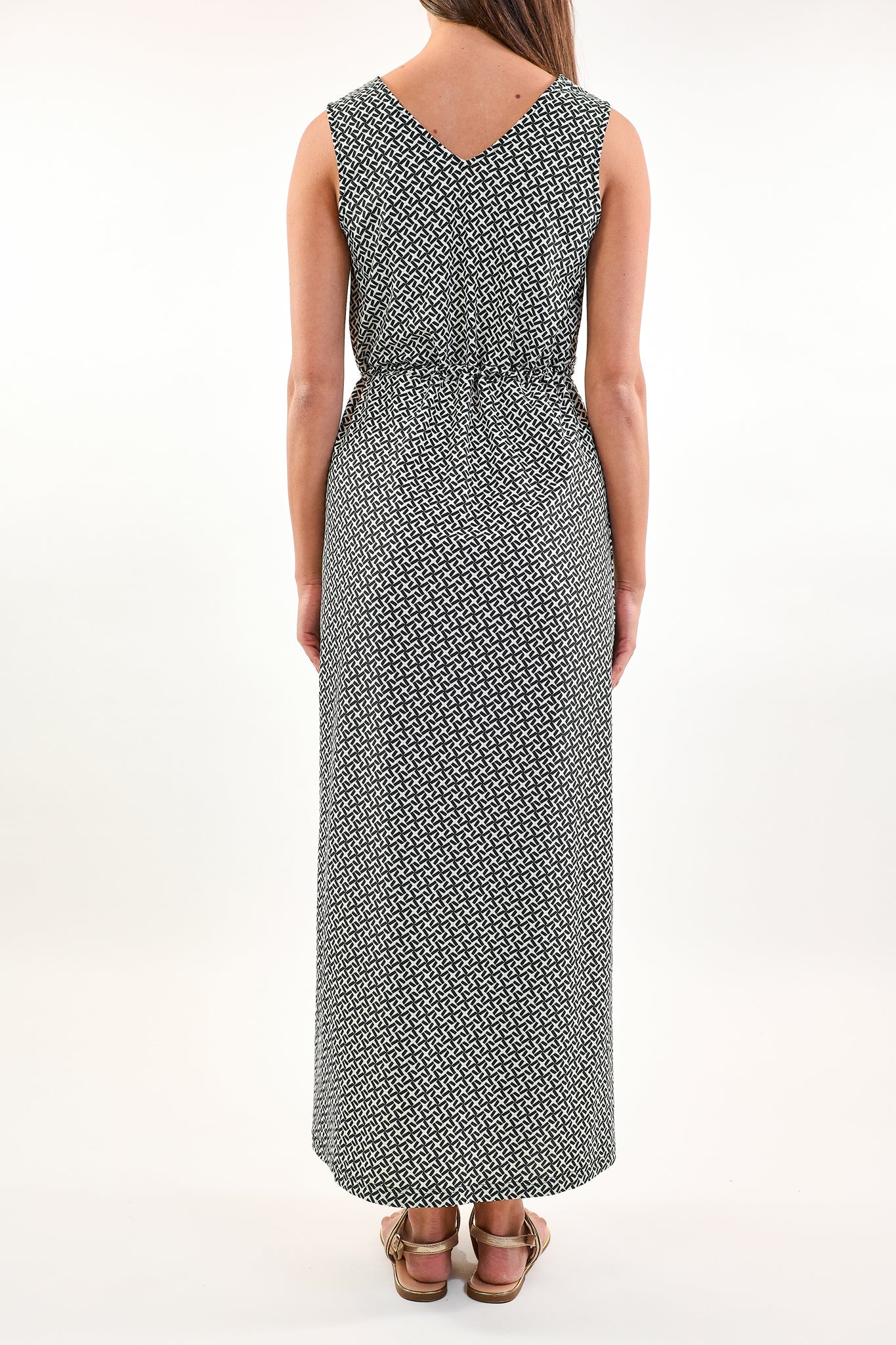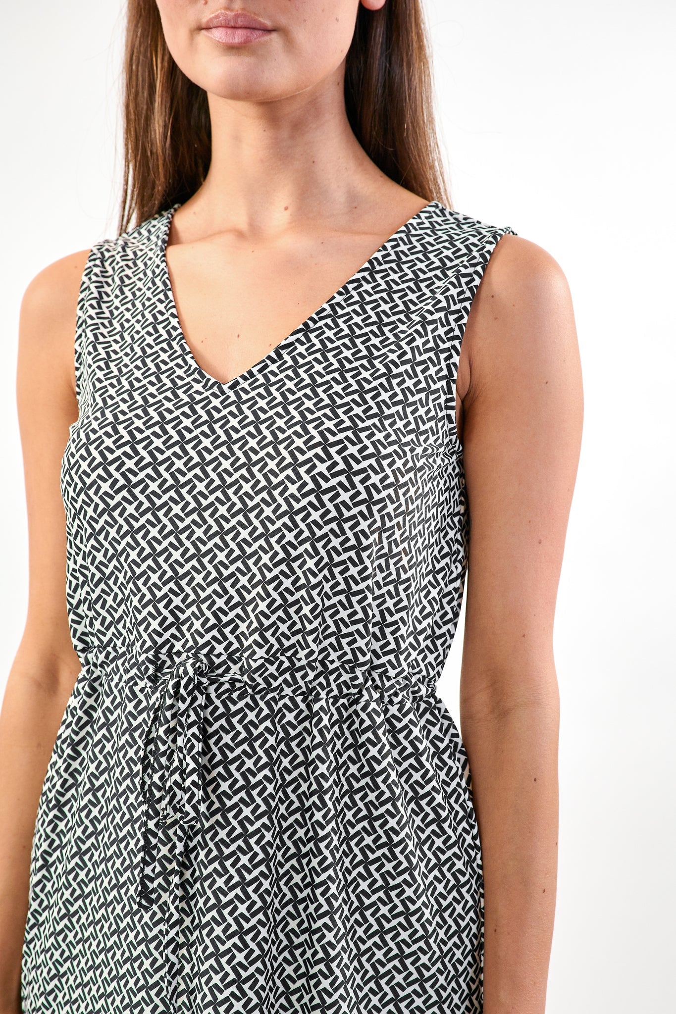 De Carize jurk is heeft een grafische print in het zwartwit. Deze jurk is mouwloos, valt over de knie en heeft een strikceintuur in de taille.