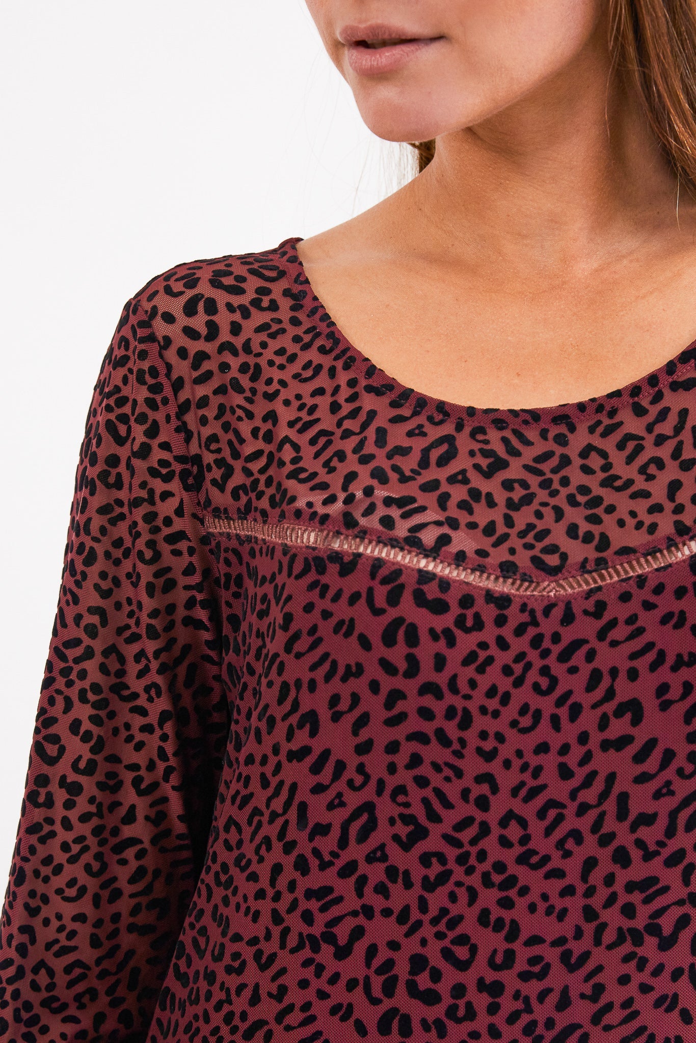 De Ceylin top heeft lange mouwen en een ronde hals. De mouwen en bovenkant van de top zijn doorschijnend. De top heeft een panterprint en komt in het zwart, bruin en bordeaux.
