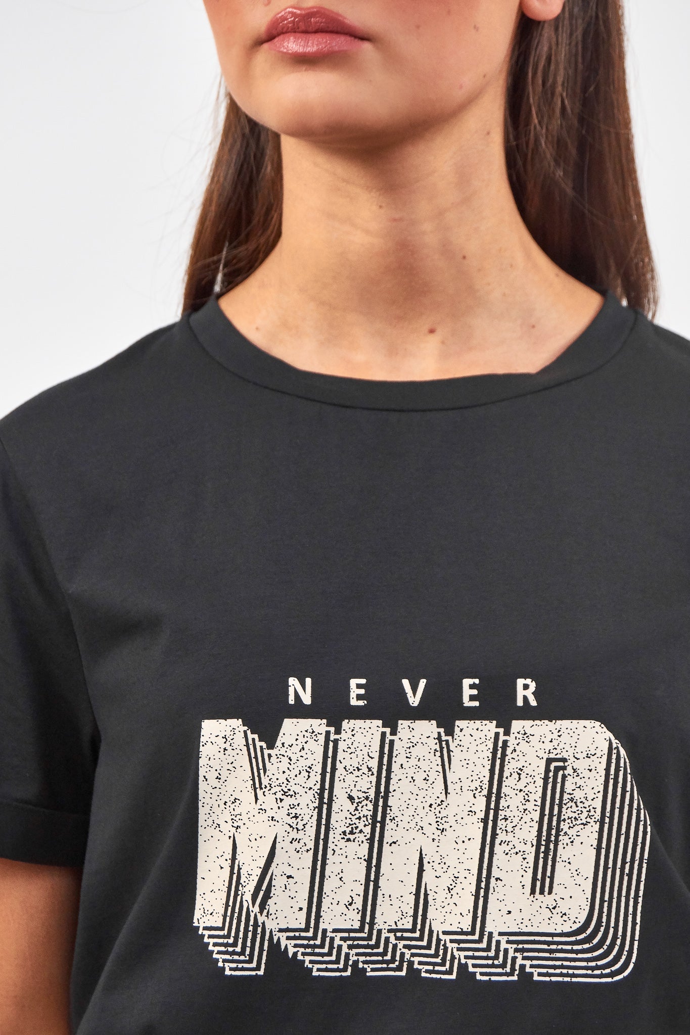 Het Charlotte T-shirt heeft korte mouwen en een hoog gesloten ronde hals. Het T-shirt is voorzien van de opdruk ‘Never Mind’.