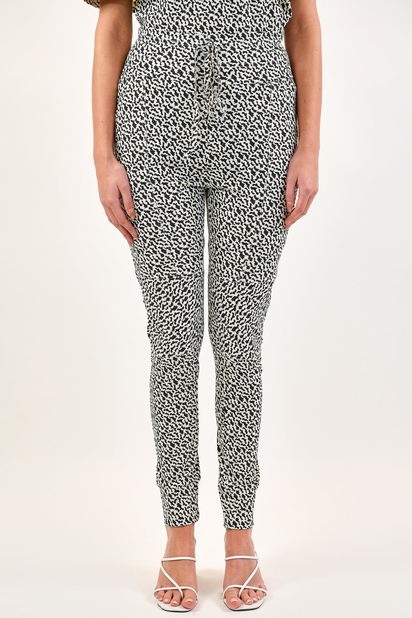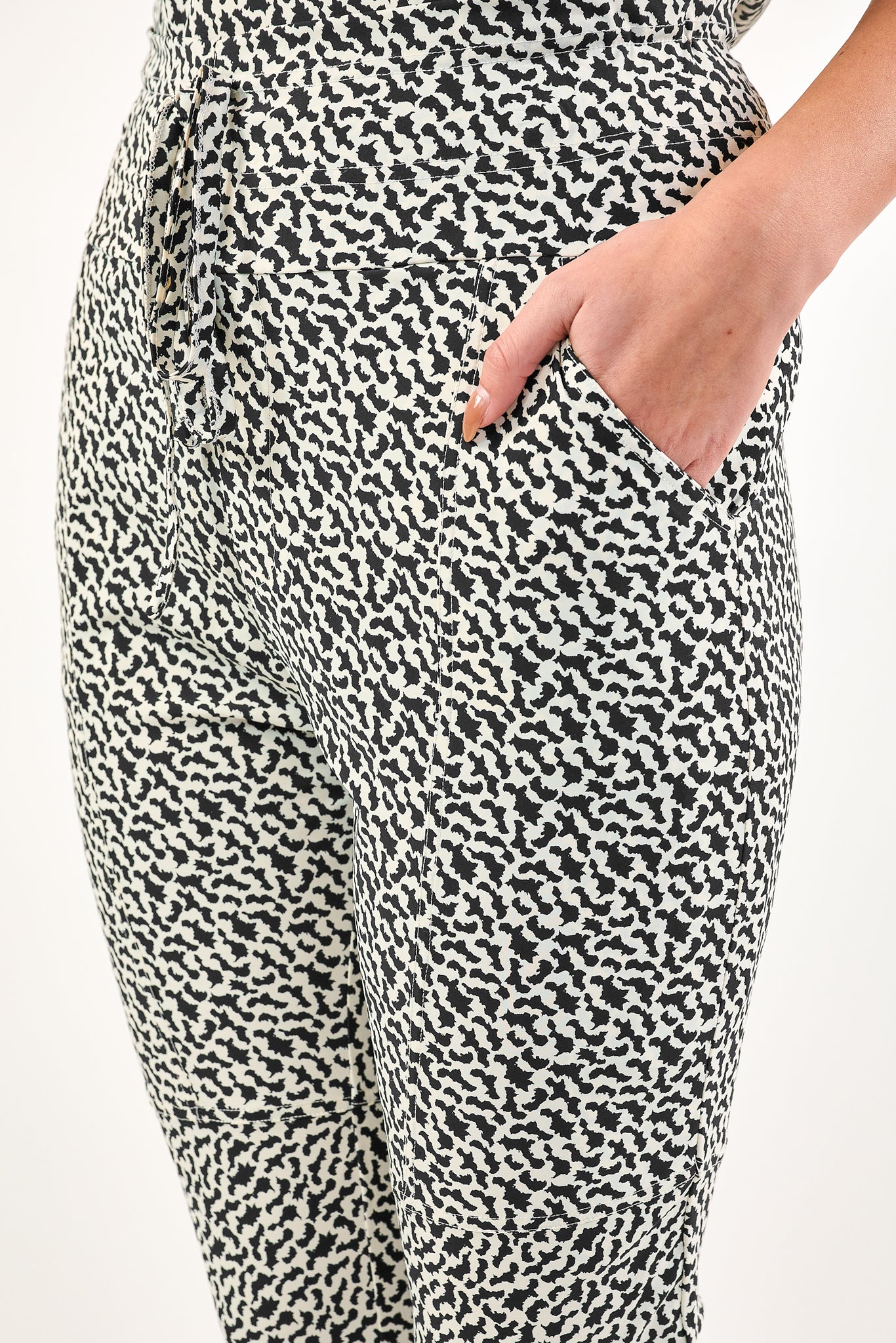 De Claire broek is een comfortabele broek met nauwsluitende pijpen. De broek is gemaakt van de unieke travel stof en heeft een strikkoord aan de bovenkant. Combineer met de Coco top voor een matchende set in dezelfde print.