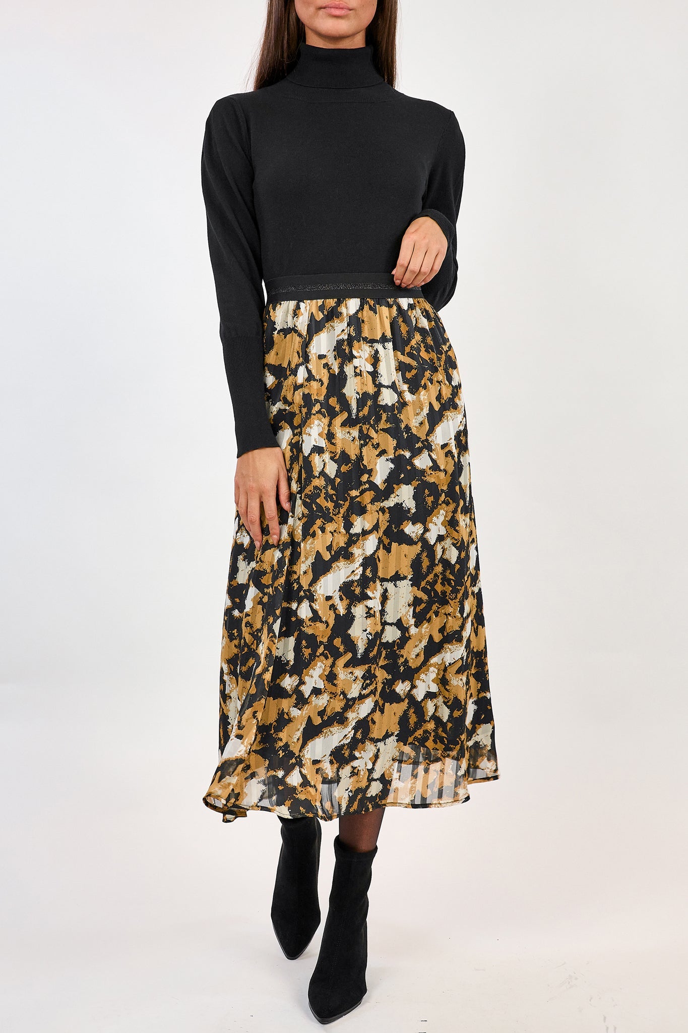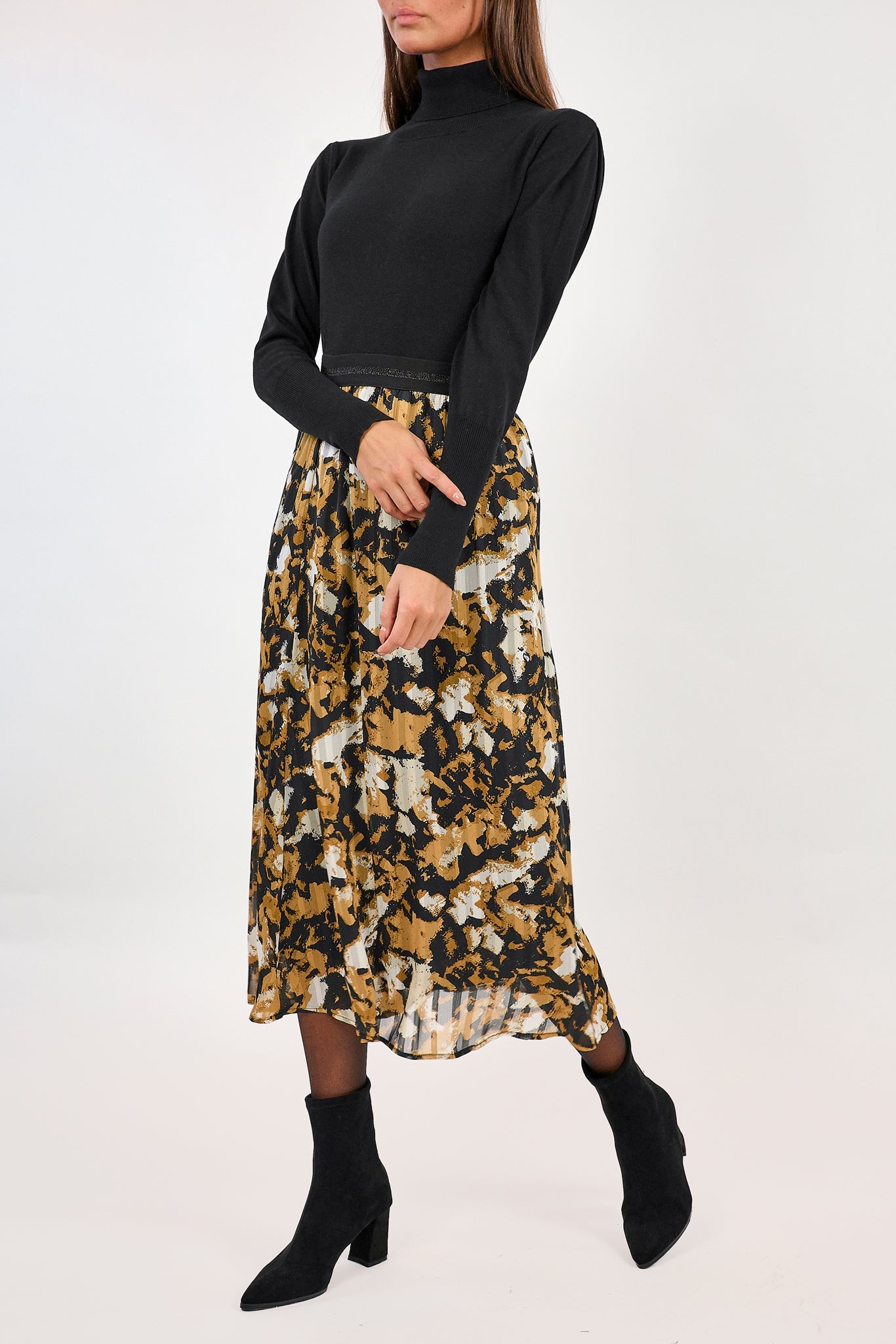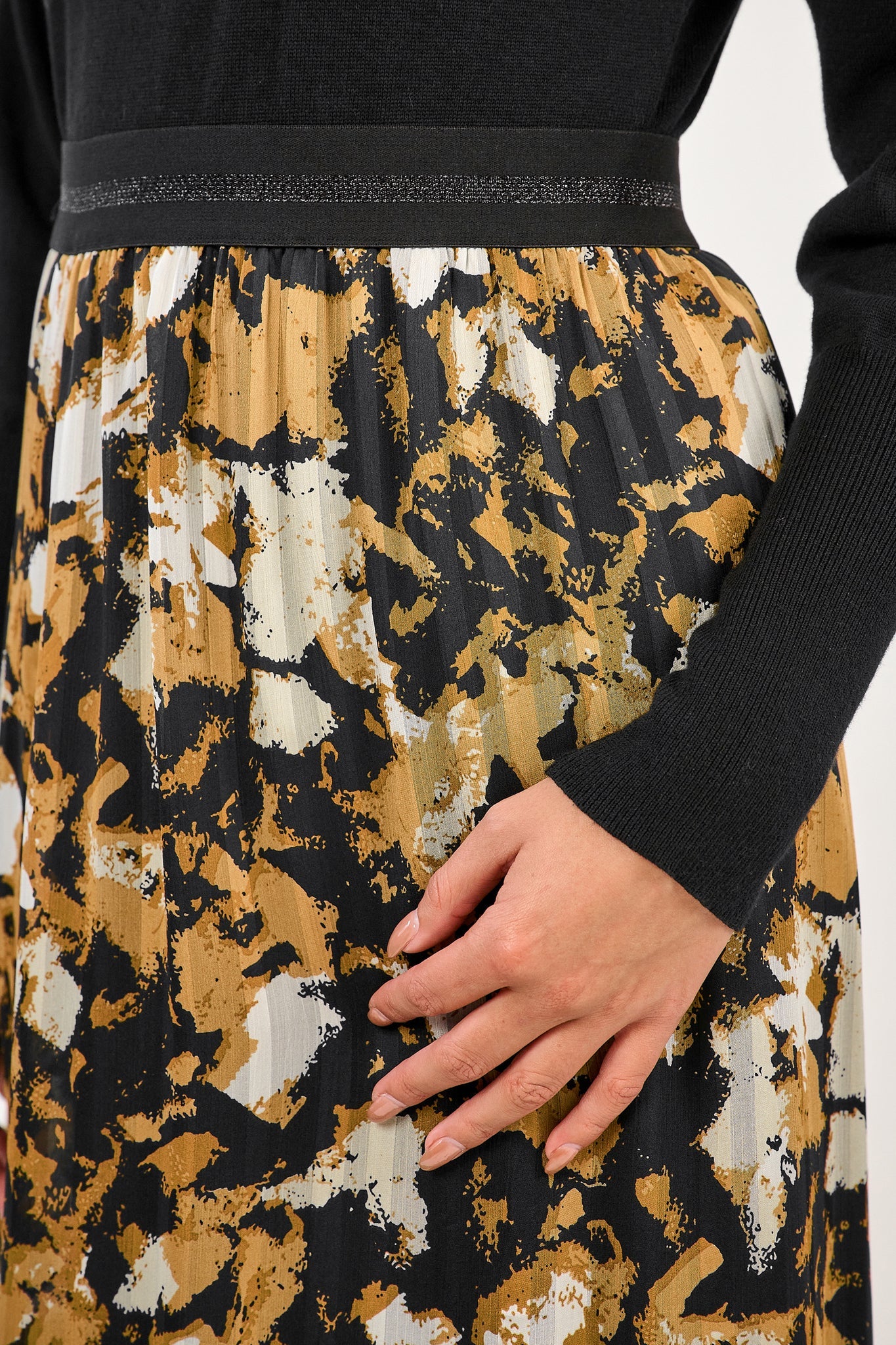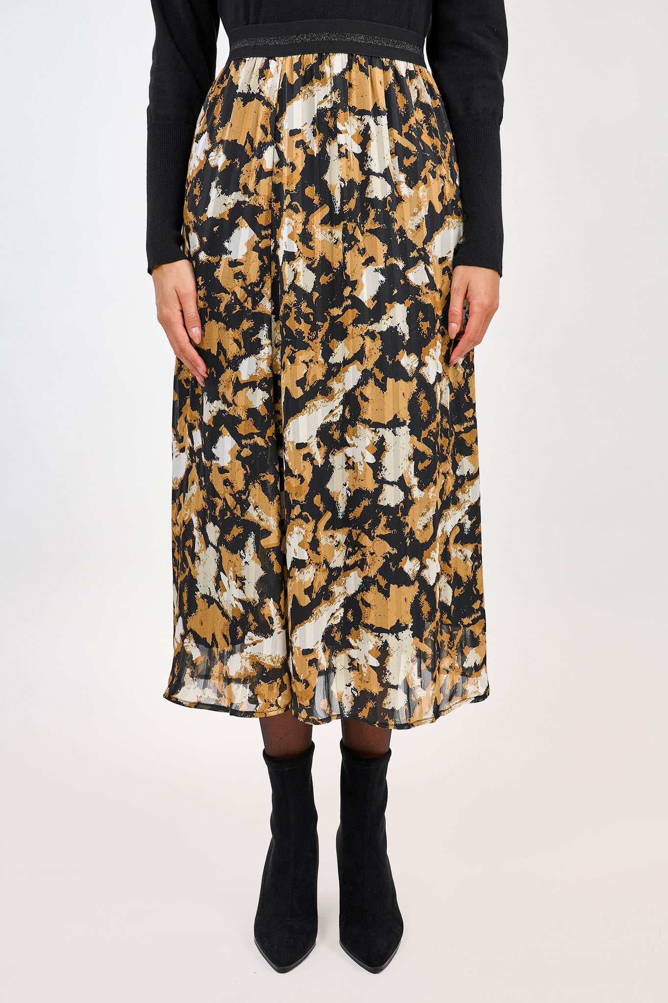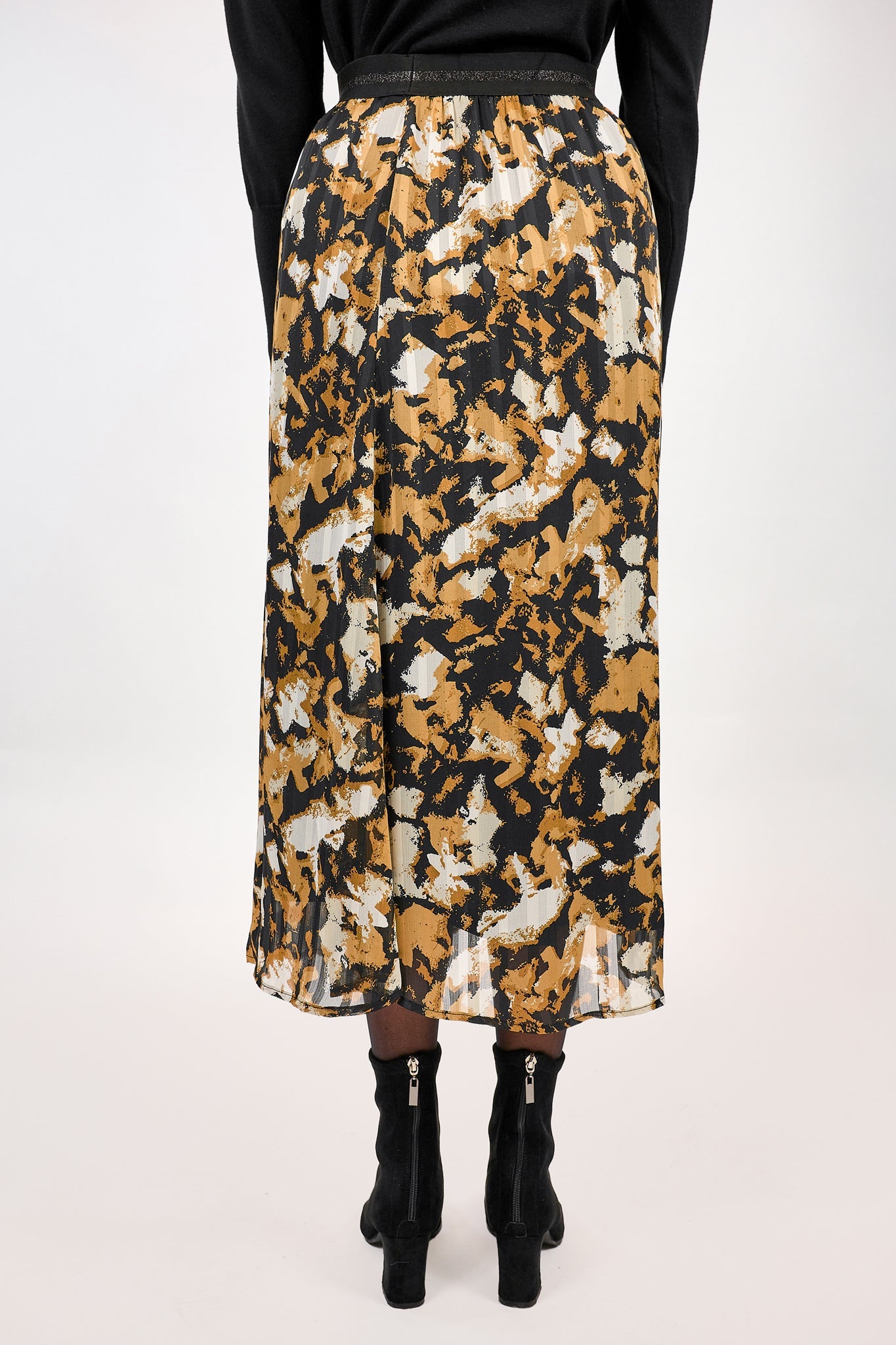 De Cobien rok heeft een abstracte print met witte en mosterdgele tinten. De rok heeft een tailleband met glitterdetails. De rok valt tot onder de knie. Combineer deze rok met de Haley top voor een complete set.