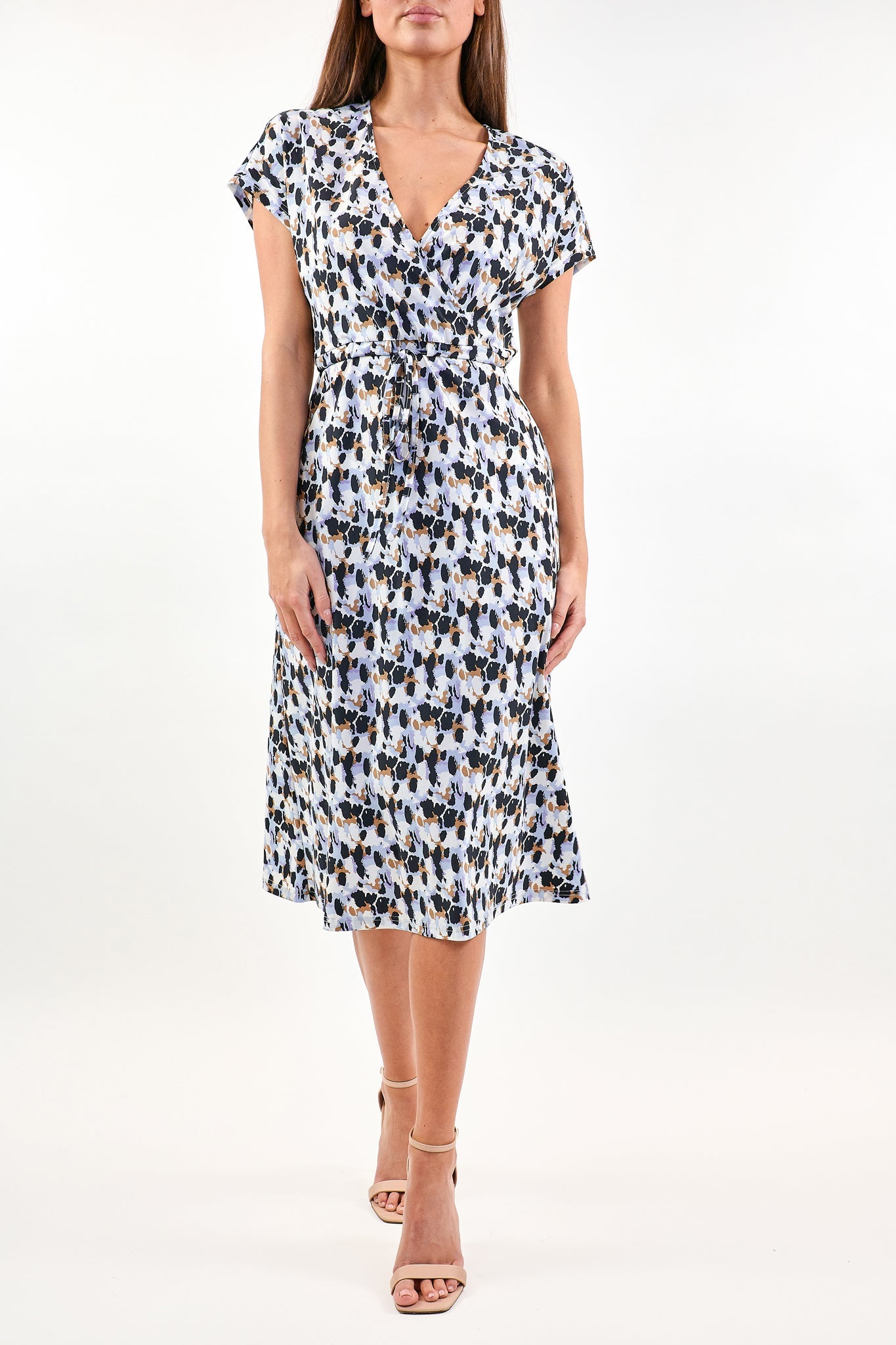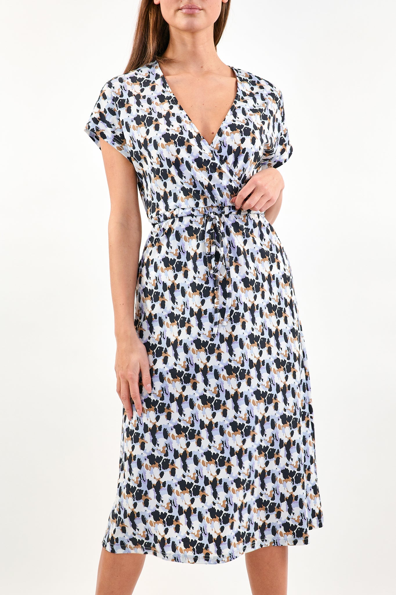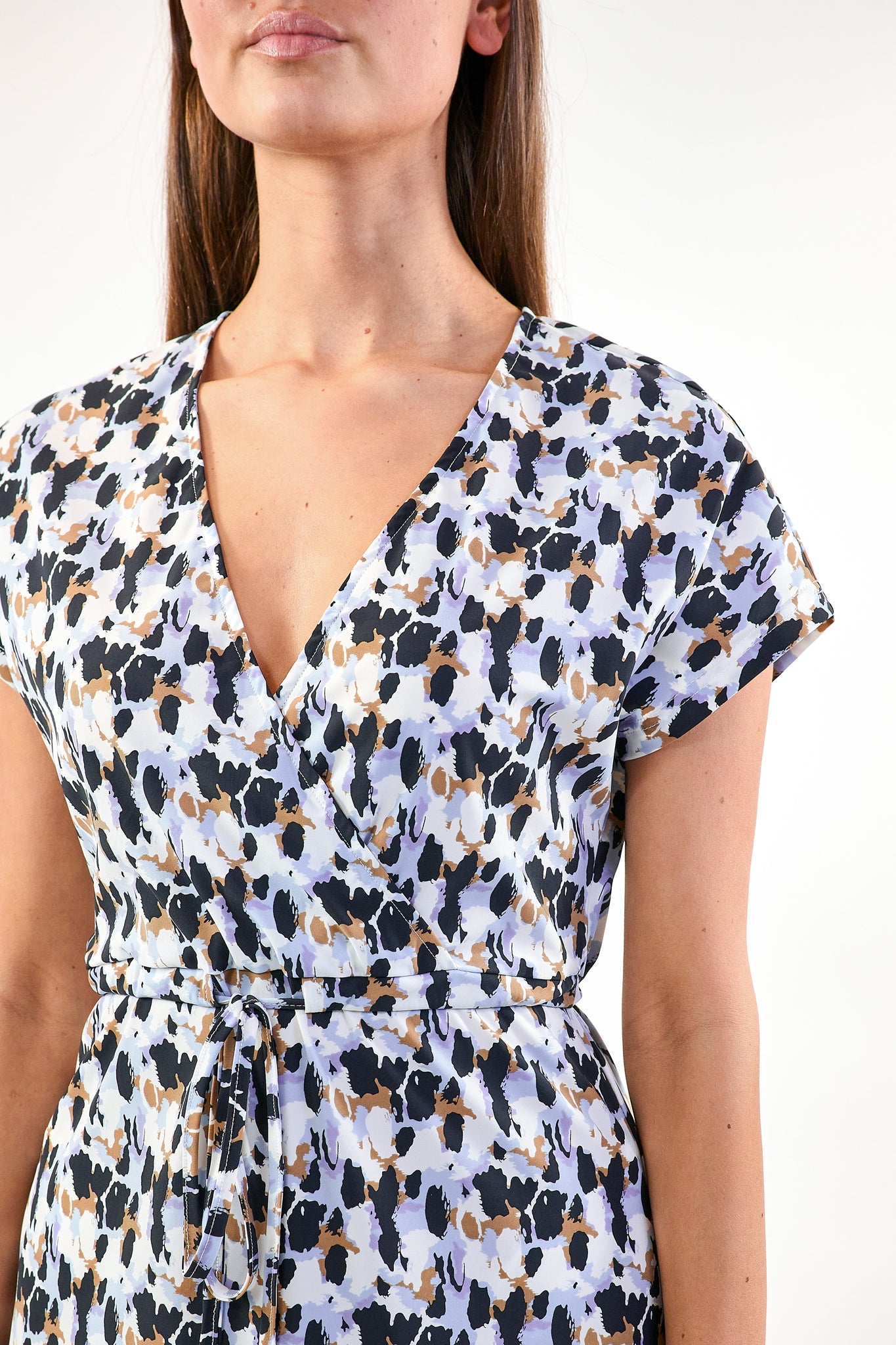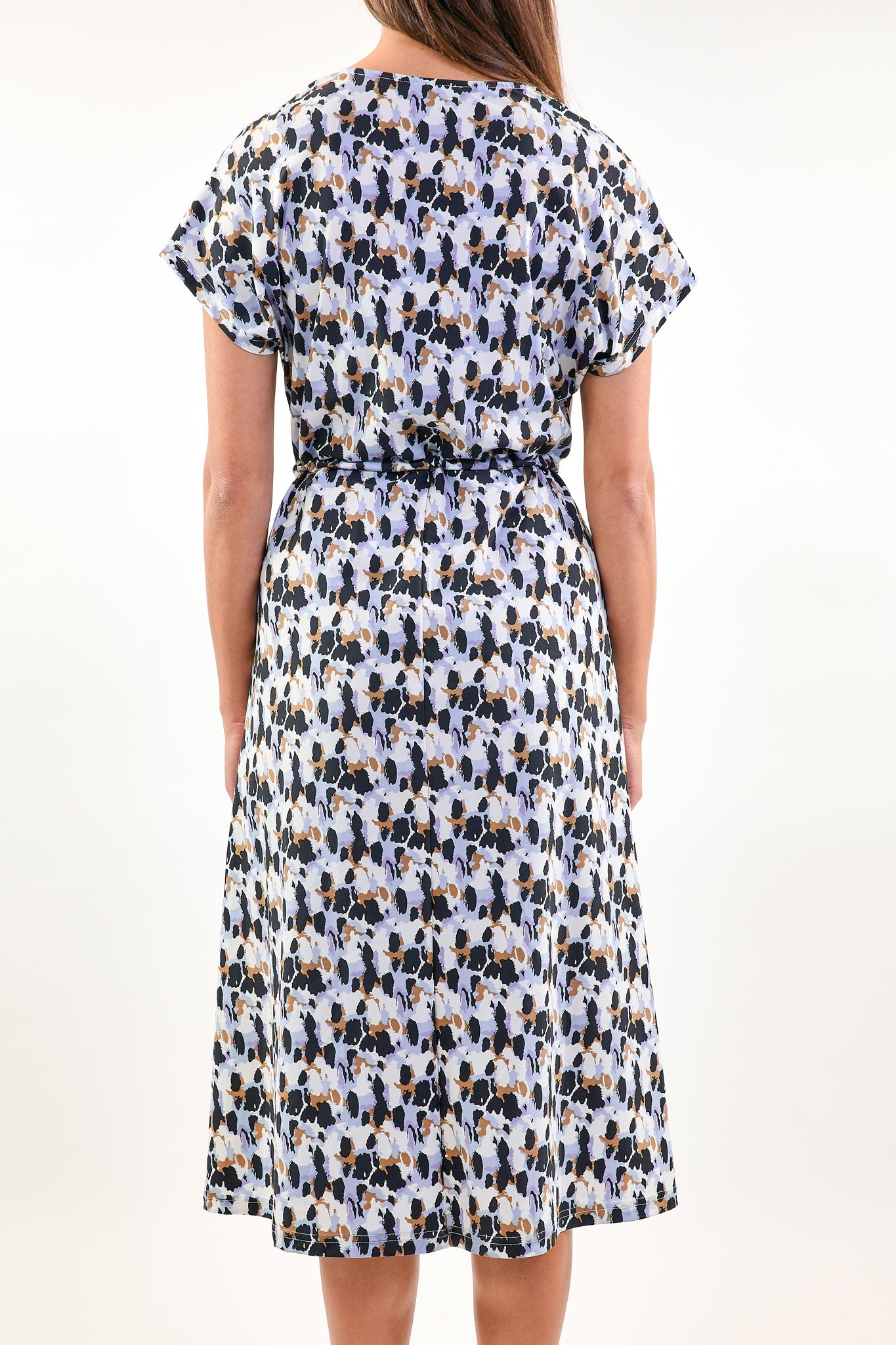 De Colette jurk valt tot over de knie en heeft een V-hals. De jurk is voorzien van een abstracte panterprint met blauwtinten.