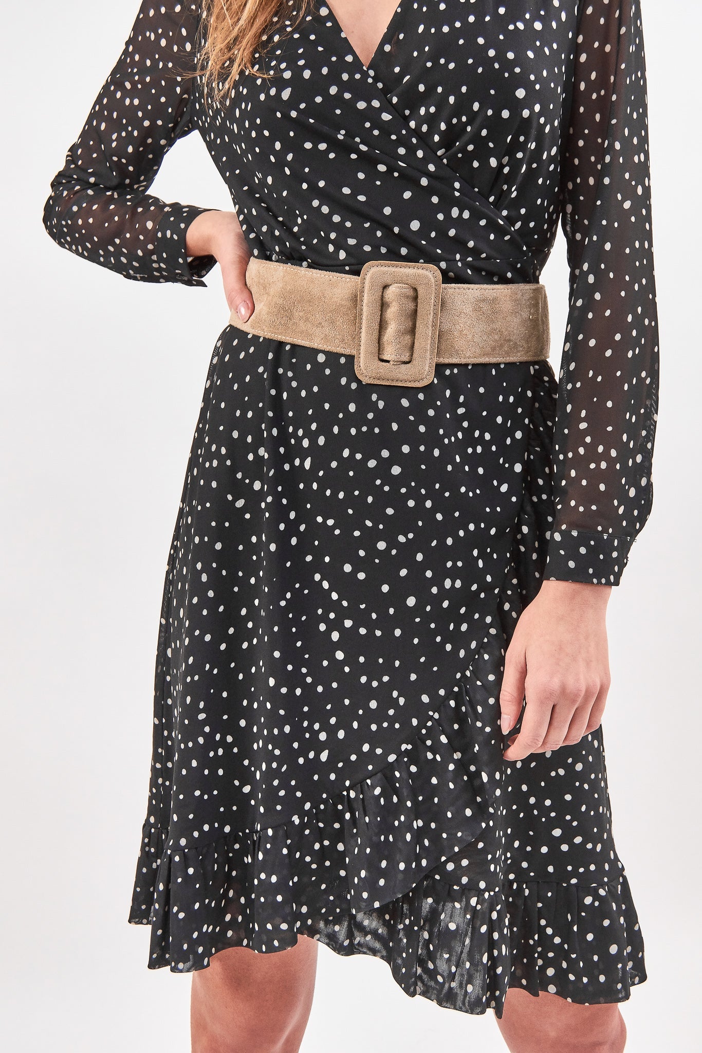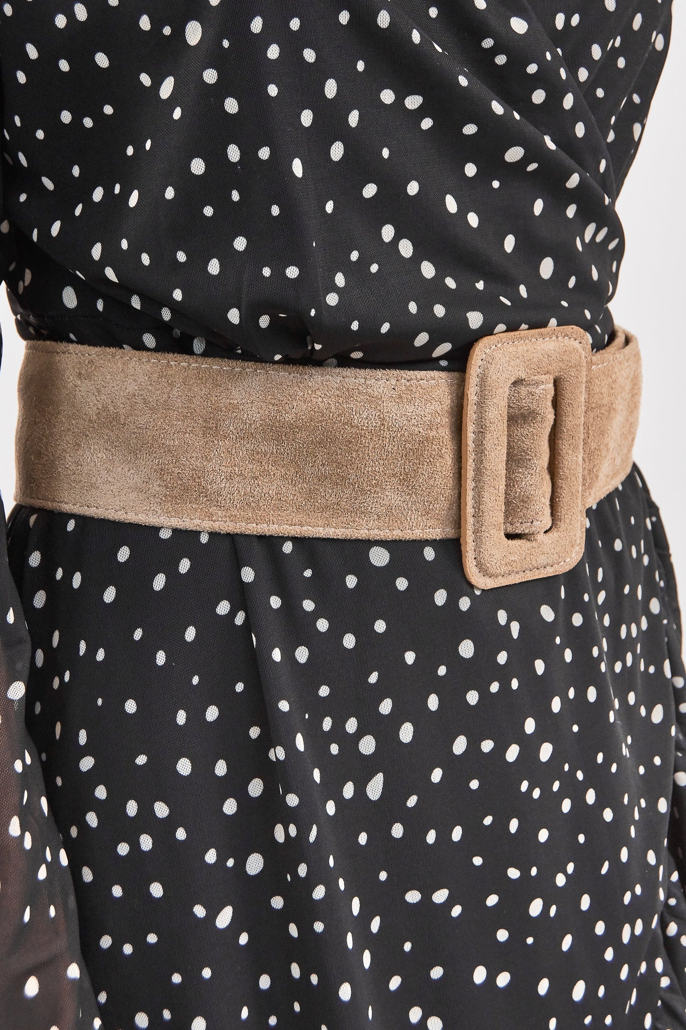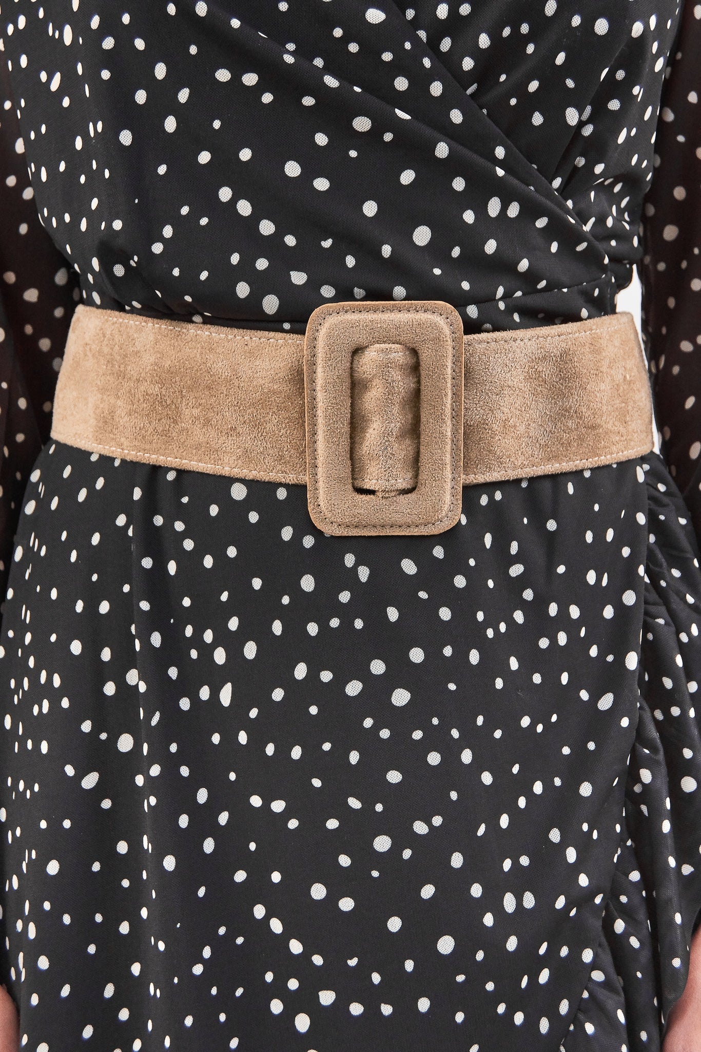 De riem heeft een suèdine look en sluit je met de gesp. Het item komt in zand, sahara bruin, taupe en cognac.