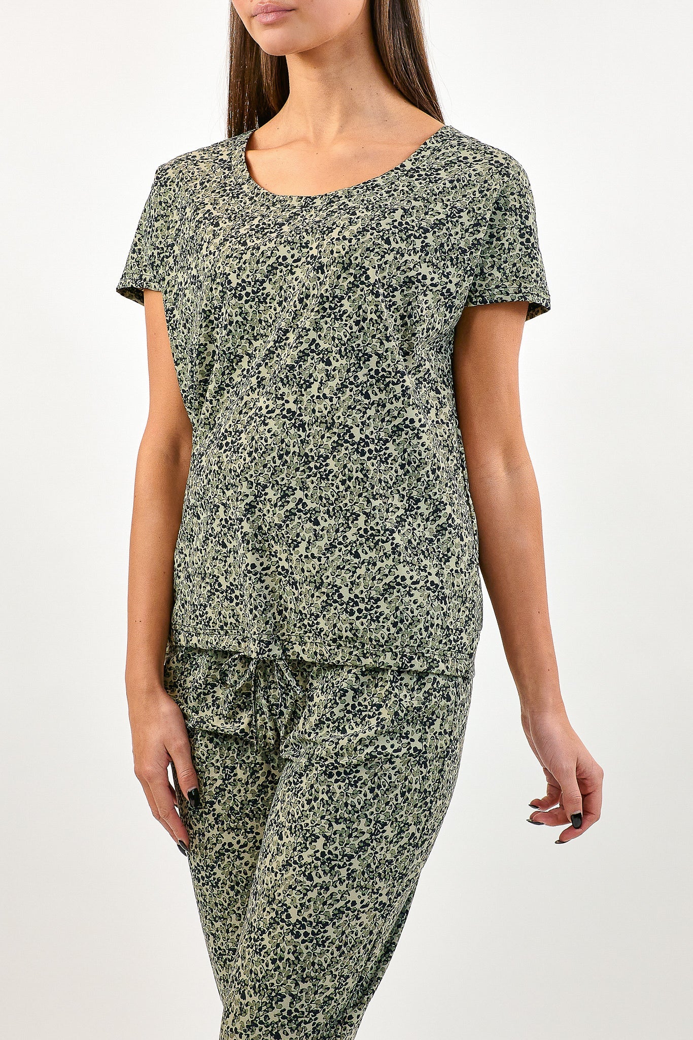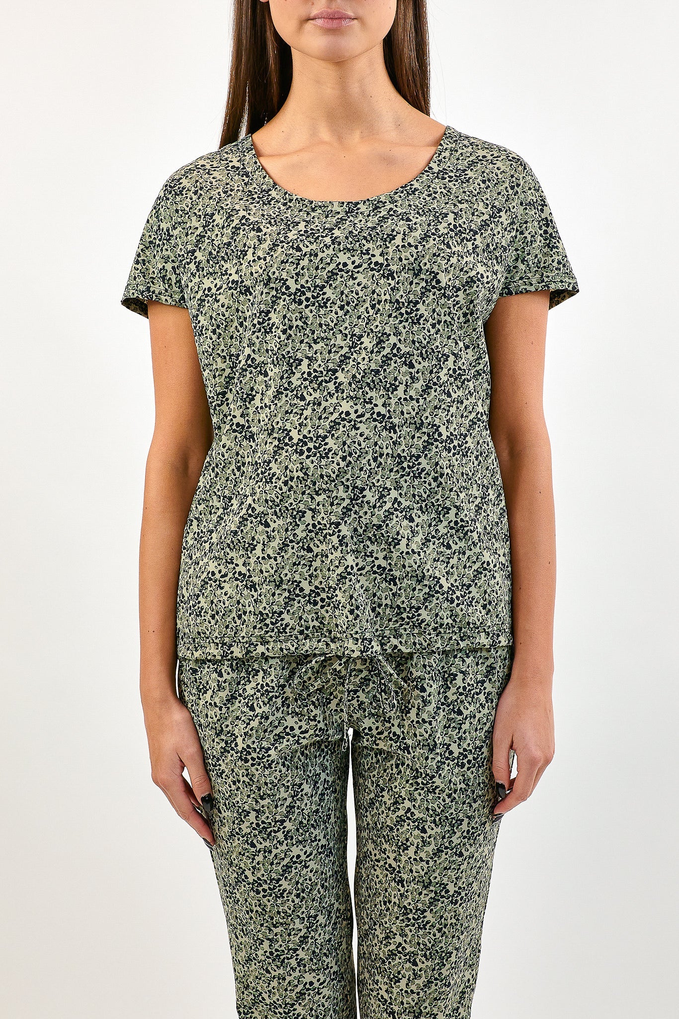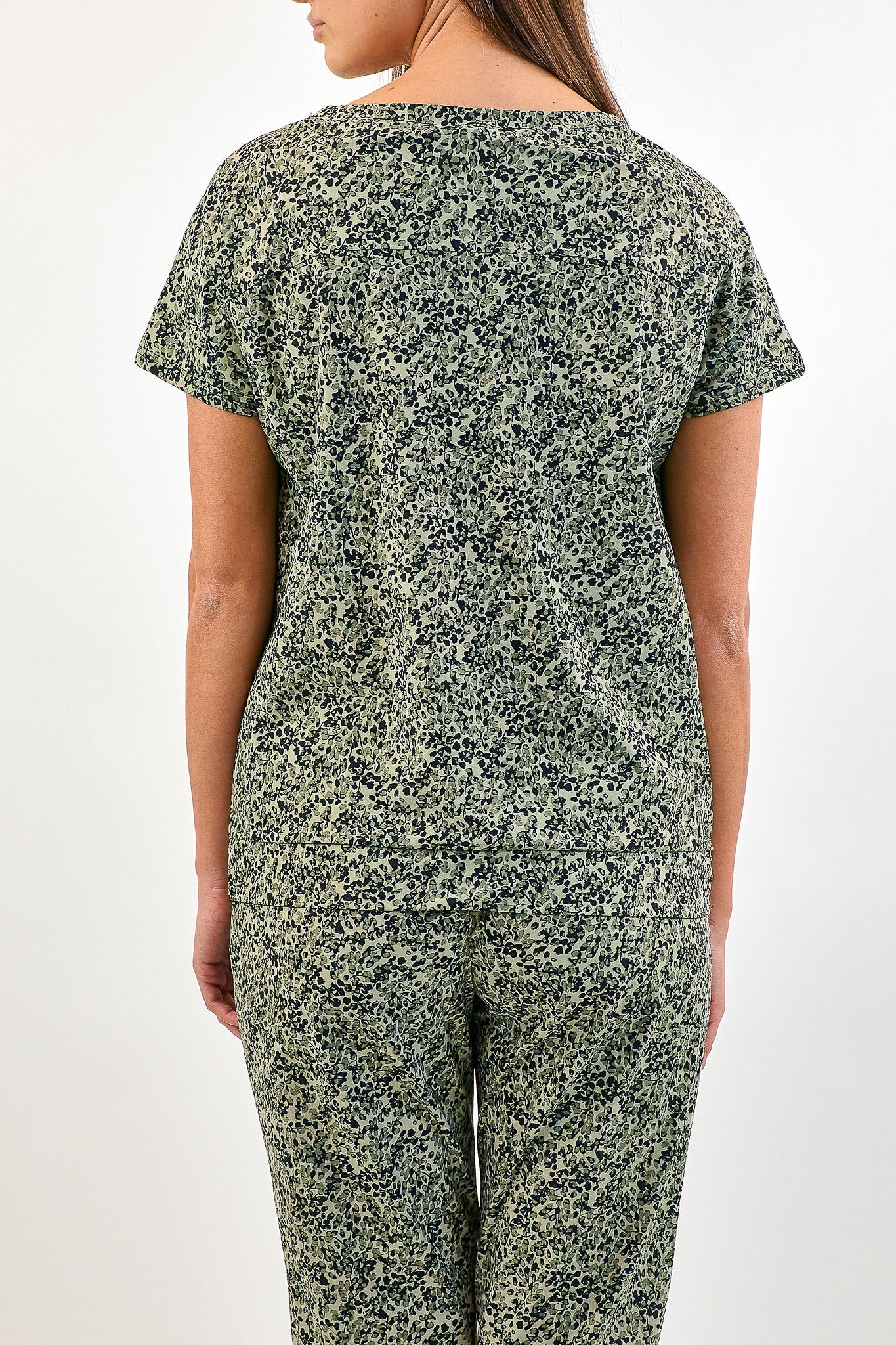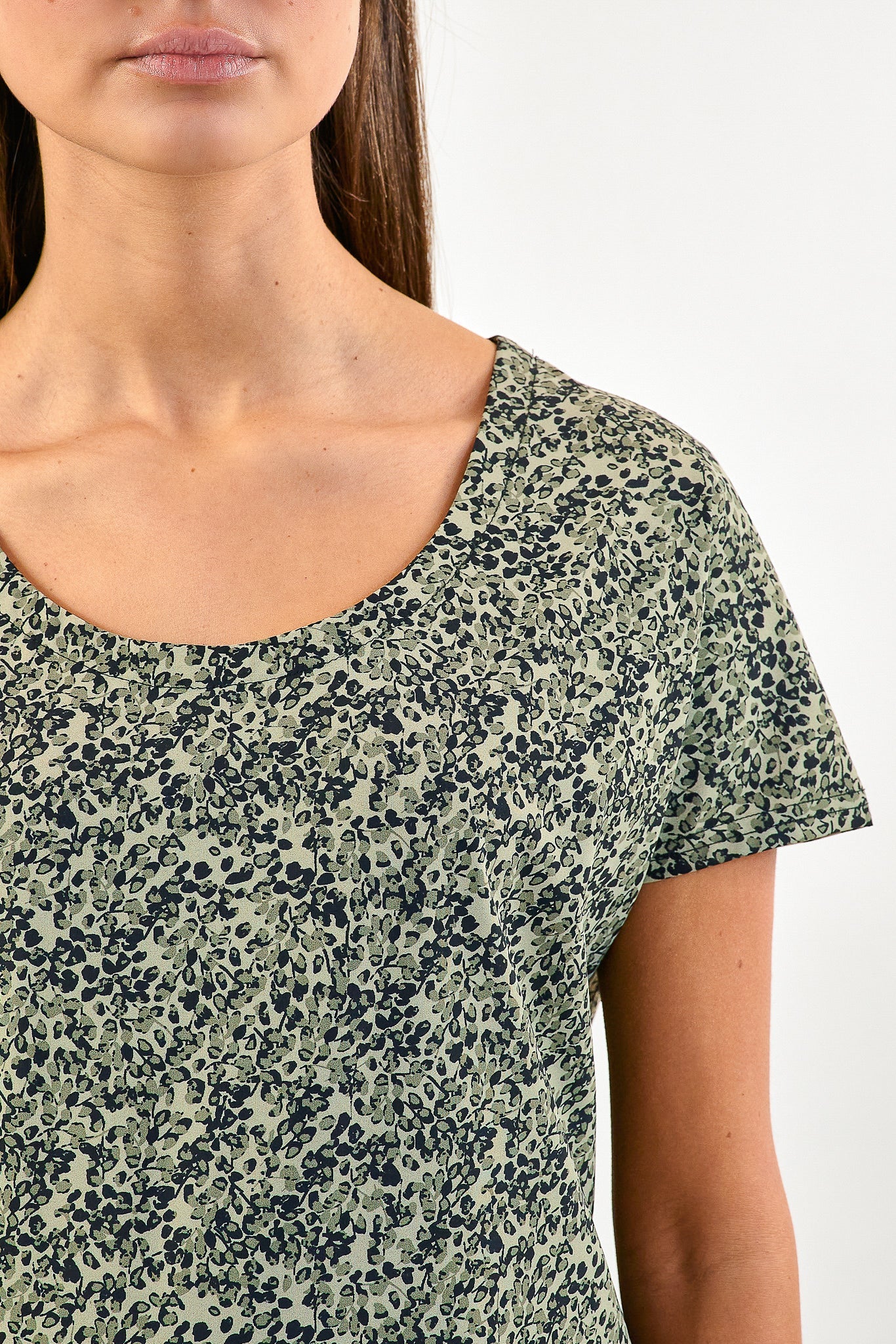 De Daan top heeft een ronde hals en korte mouwen. De top heeft een speelse strik taille aan de voorkant. Gemaakt van de comfortabele travelstof. Combineer met de Colinda broek voor een matchende set in dezelfde zomergroene print.