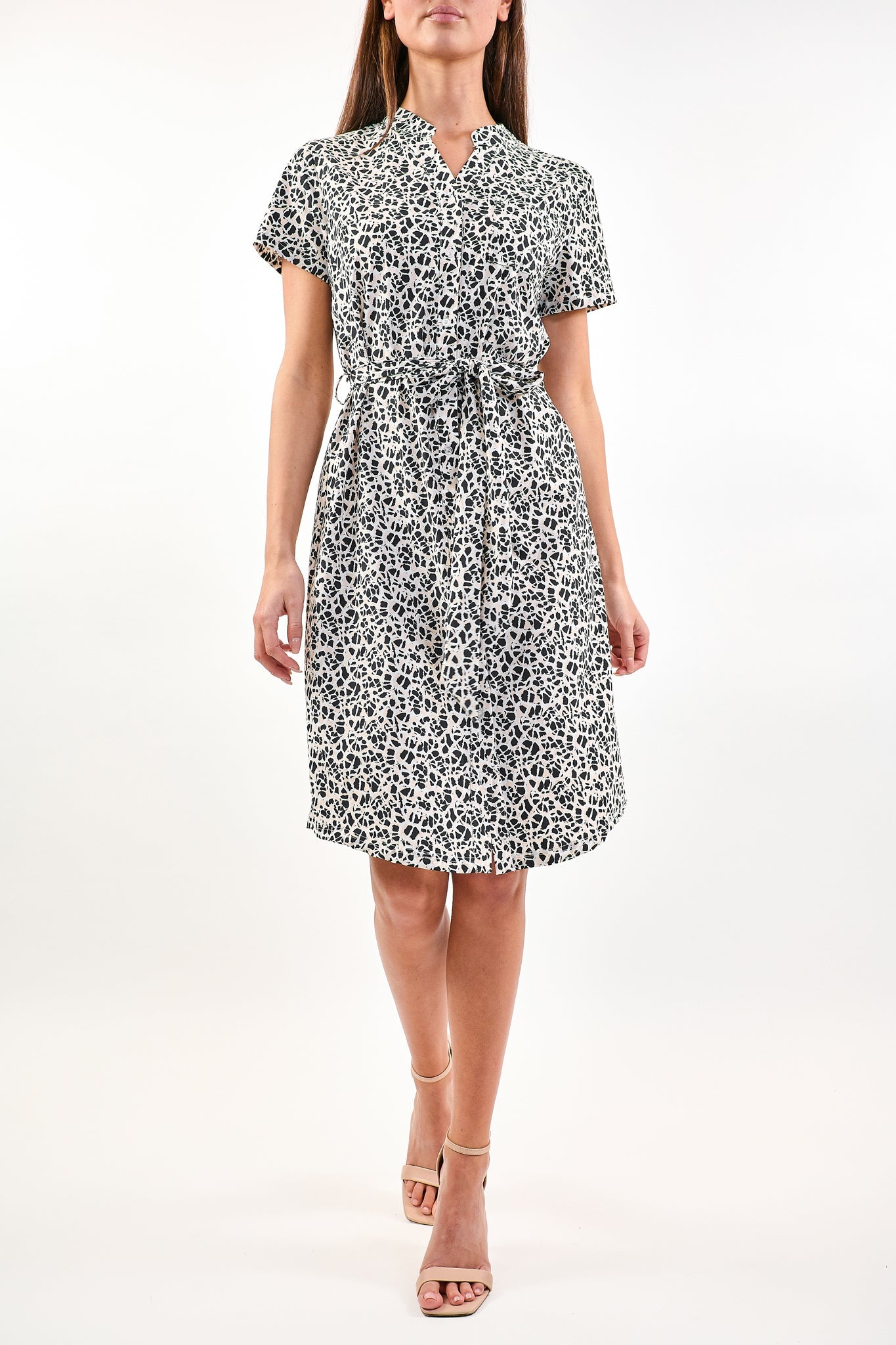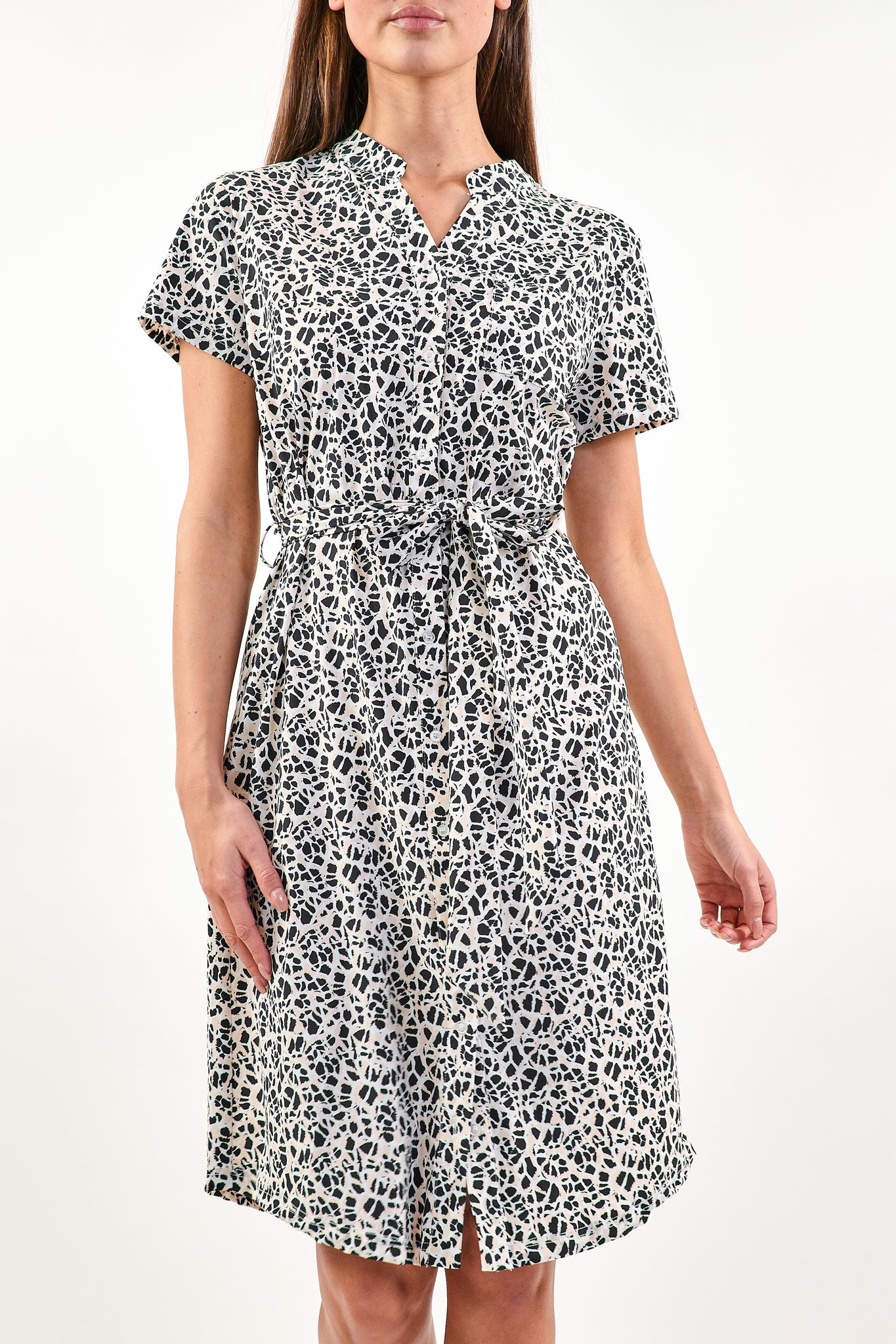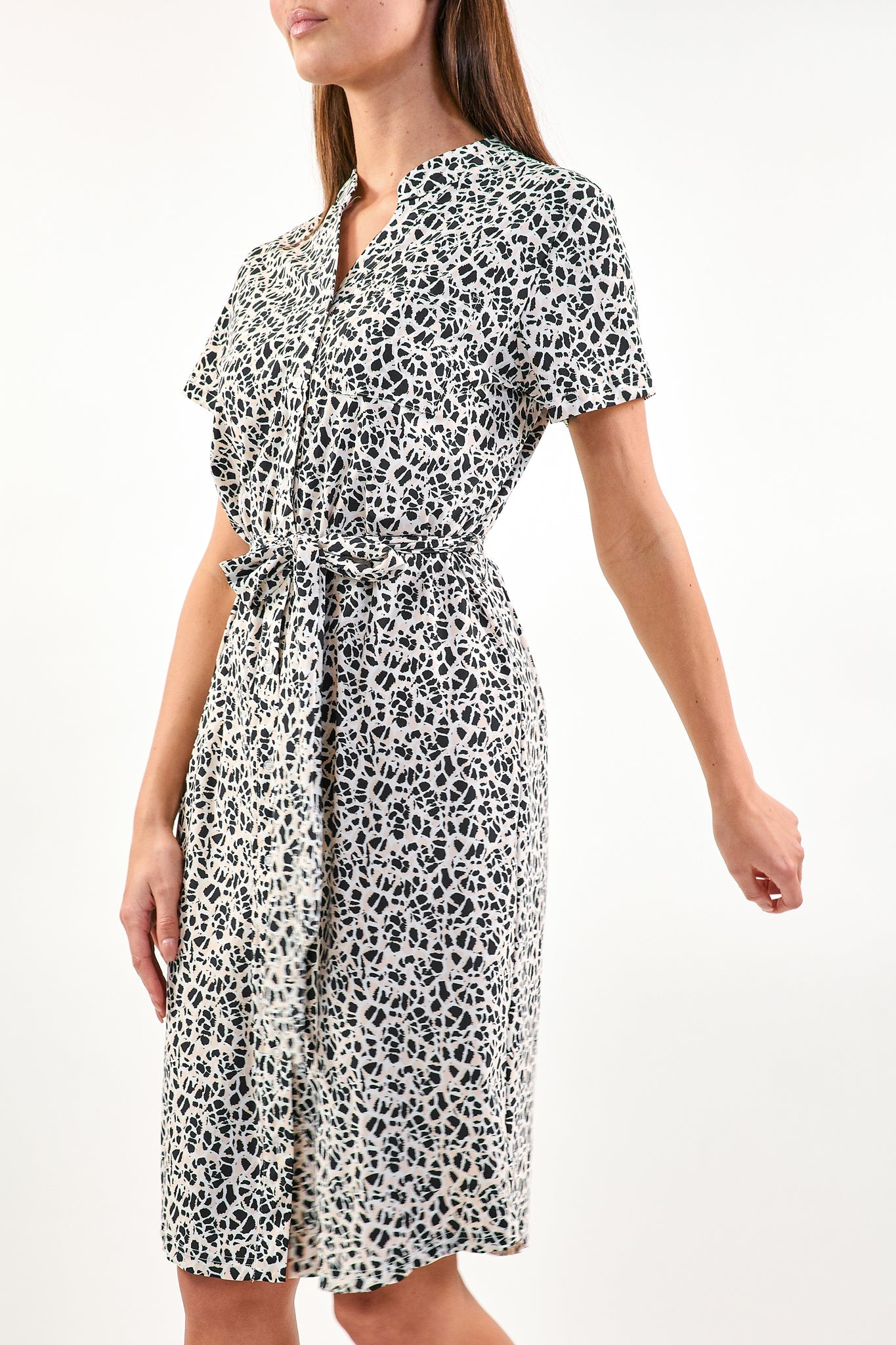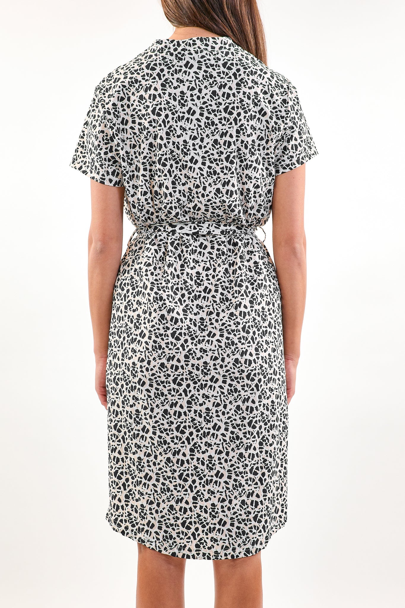 De Daantje jurk is voorzien van een print geïnspireerd op de Terrazo trend. De jurk valt tot de knie, heeft en V-hals en een strikceintuur rond de taille.