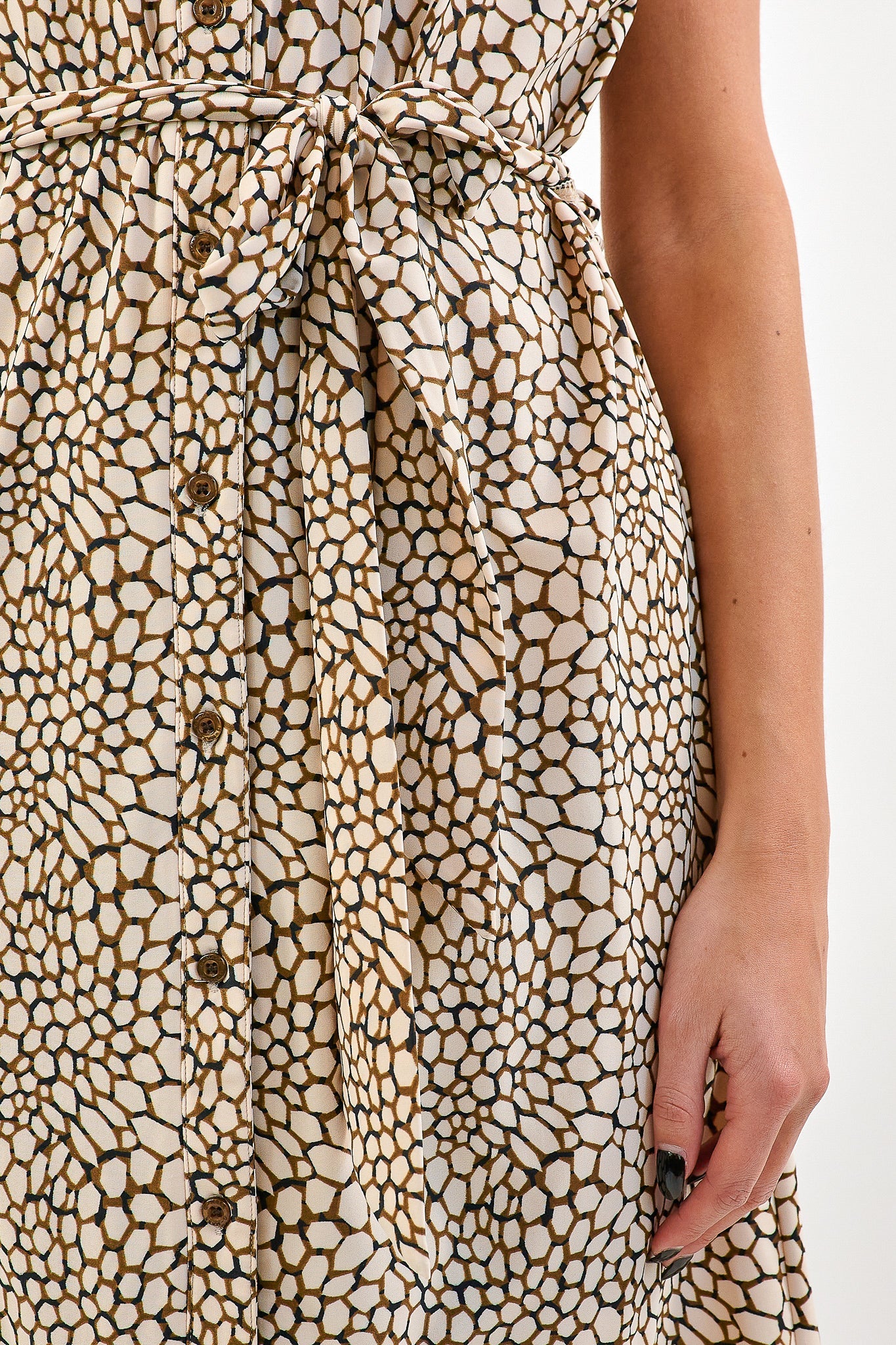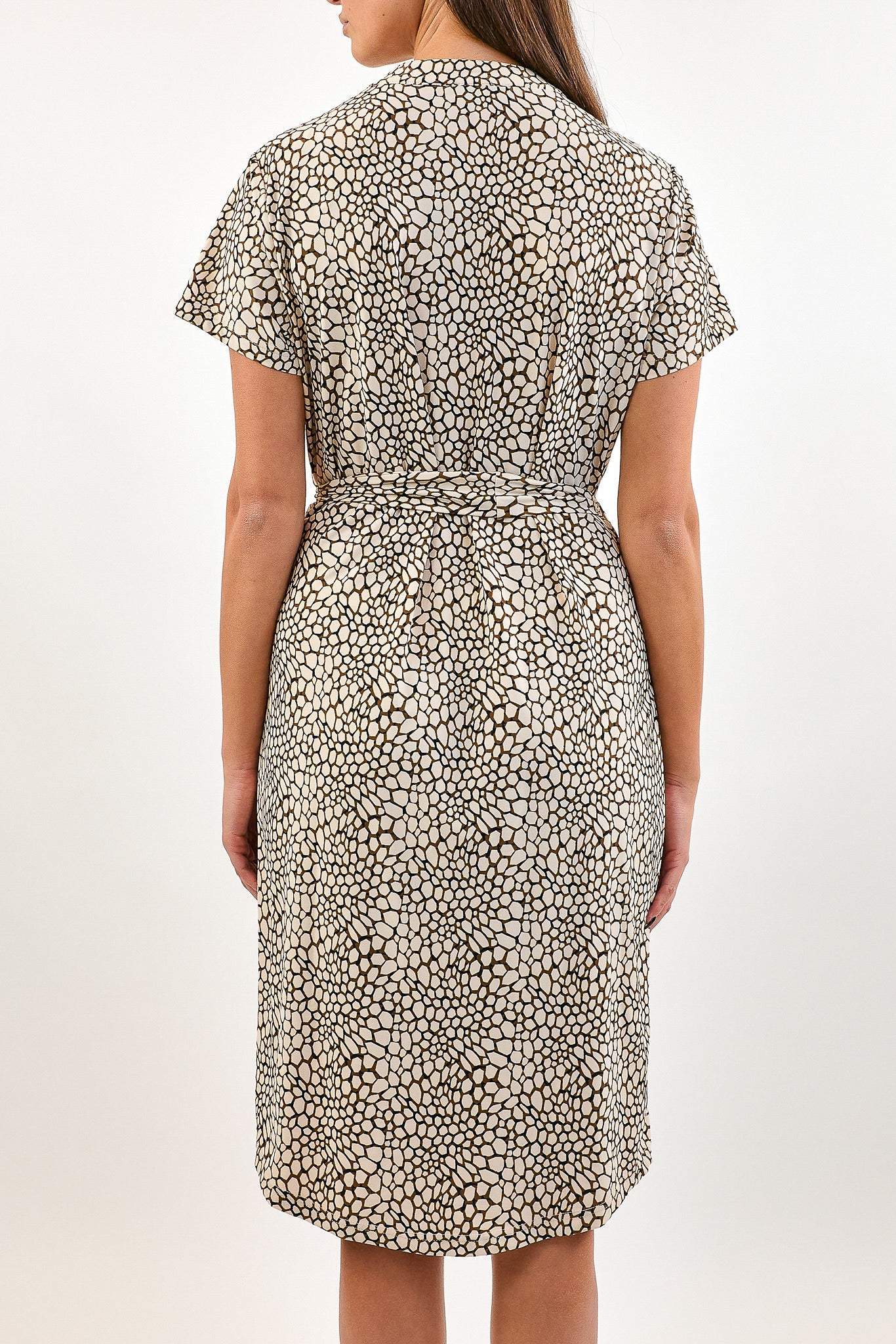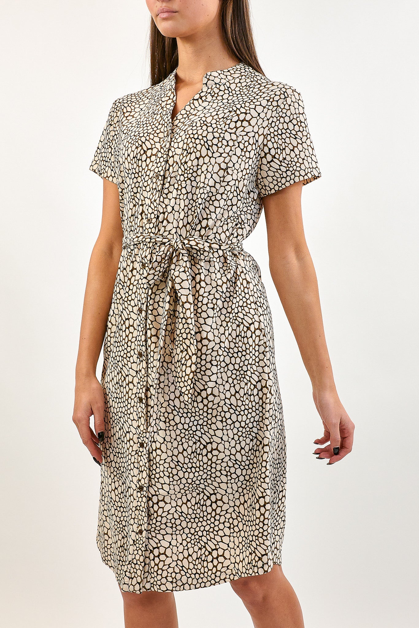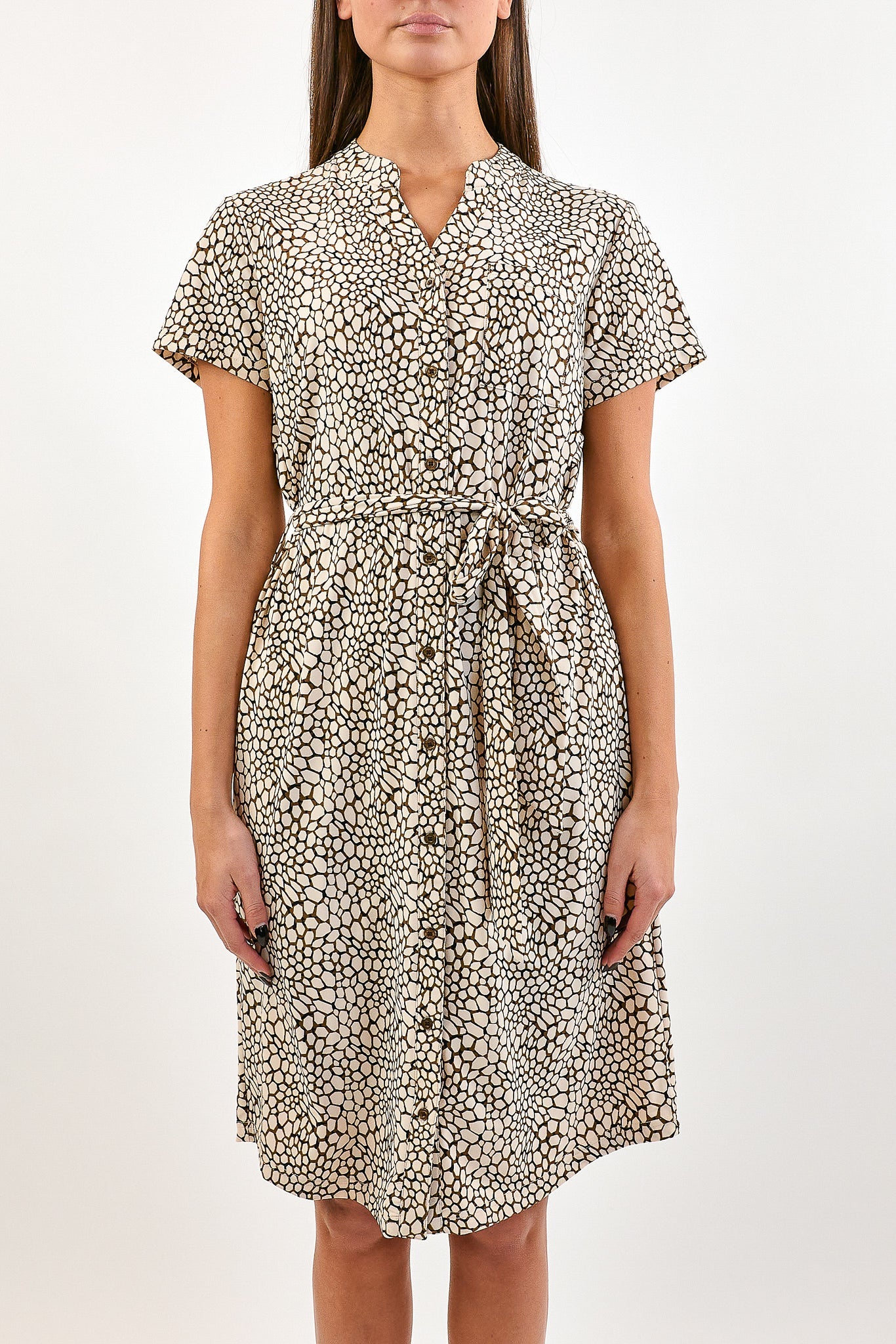 De Daantje jurk heeft korte mouwen en een blouse kraag met knoopjes tot beneden. De jurk is voorzien van een strikkoord voor een getailleerd effect. Gemaakt van de comfortabele travelstof.