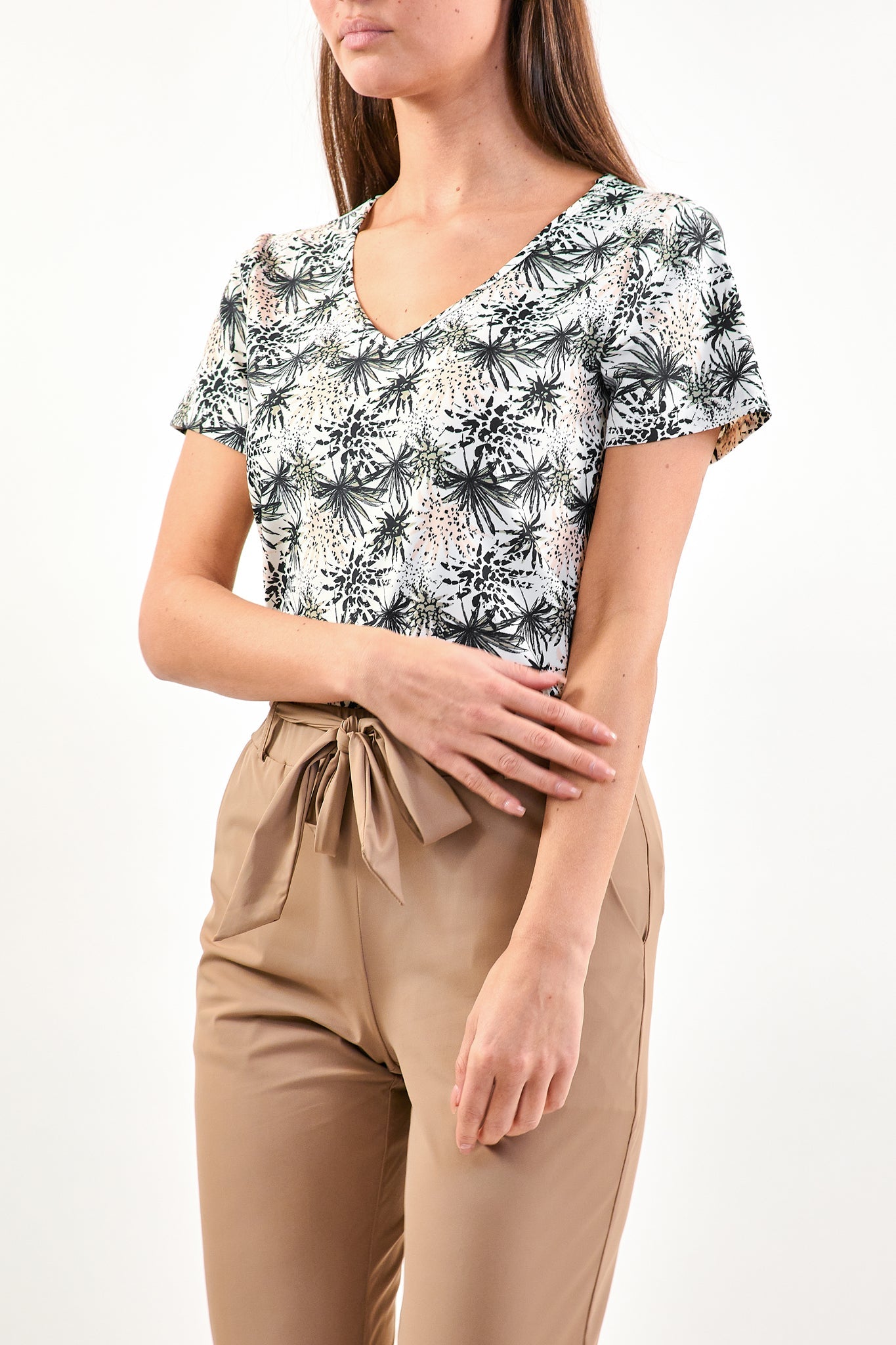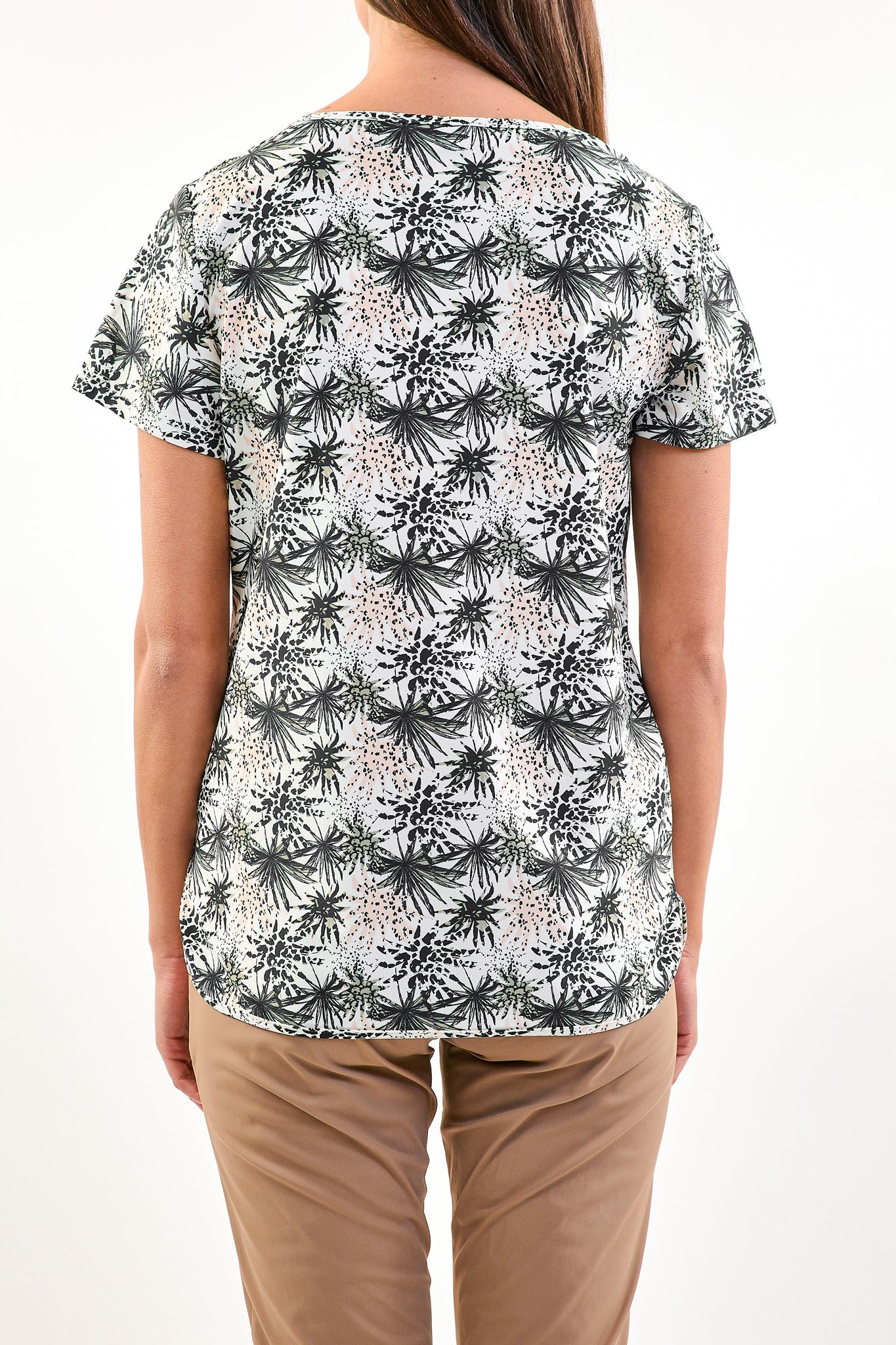 De top heeft een aansluitend model en is voorzien van een palmboom-achtige print met groentinten.