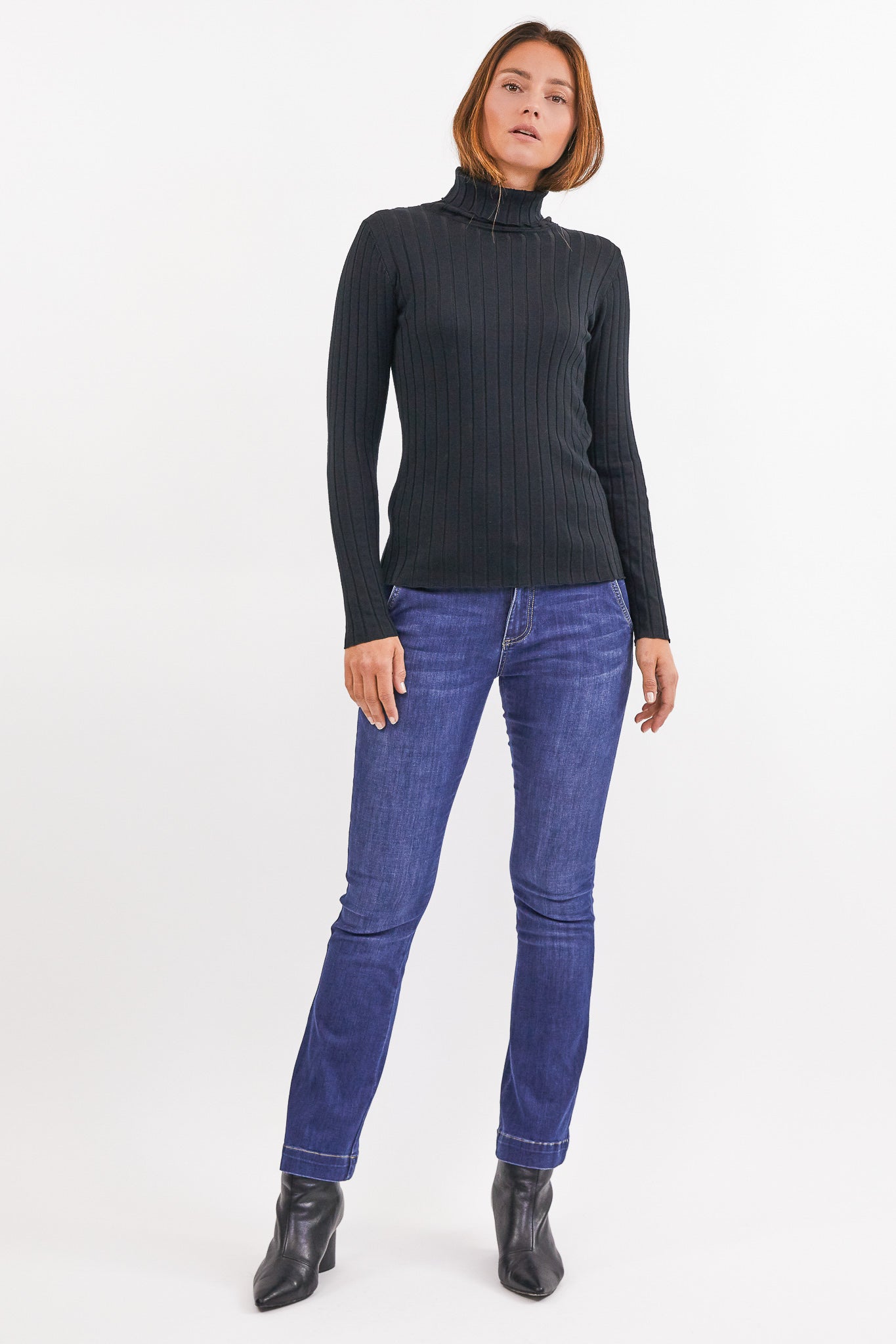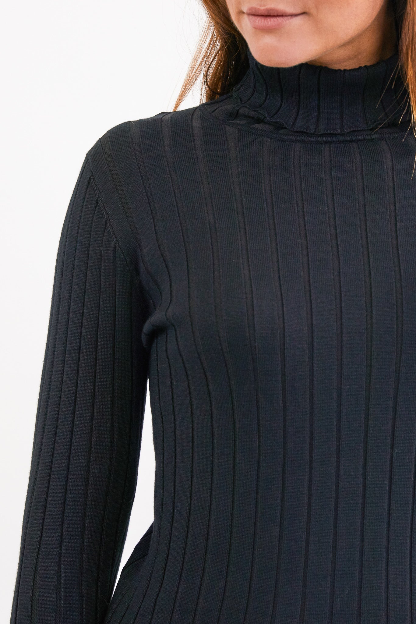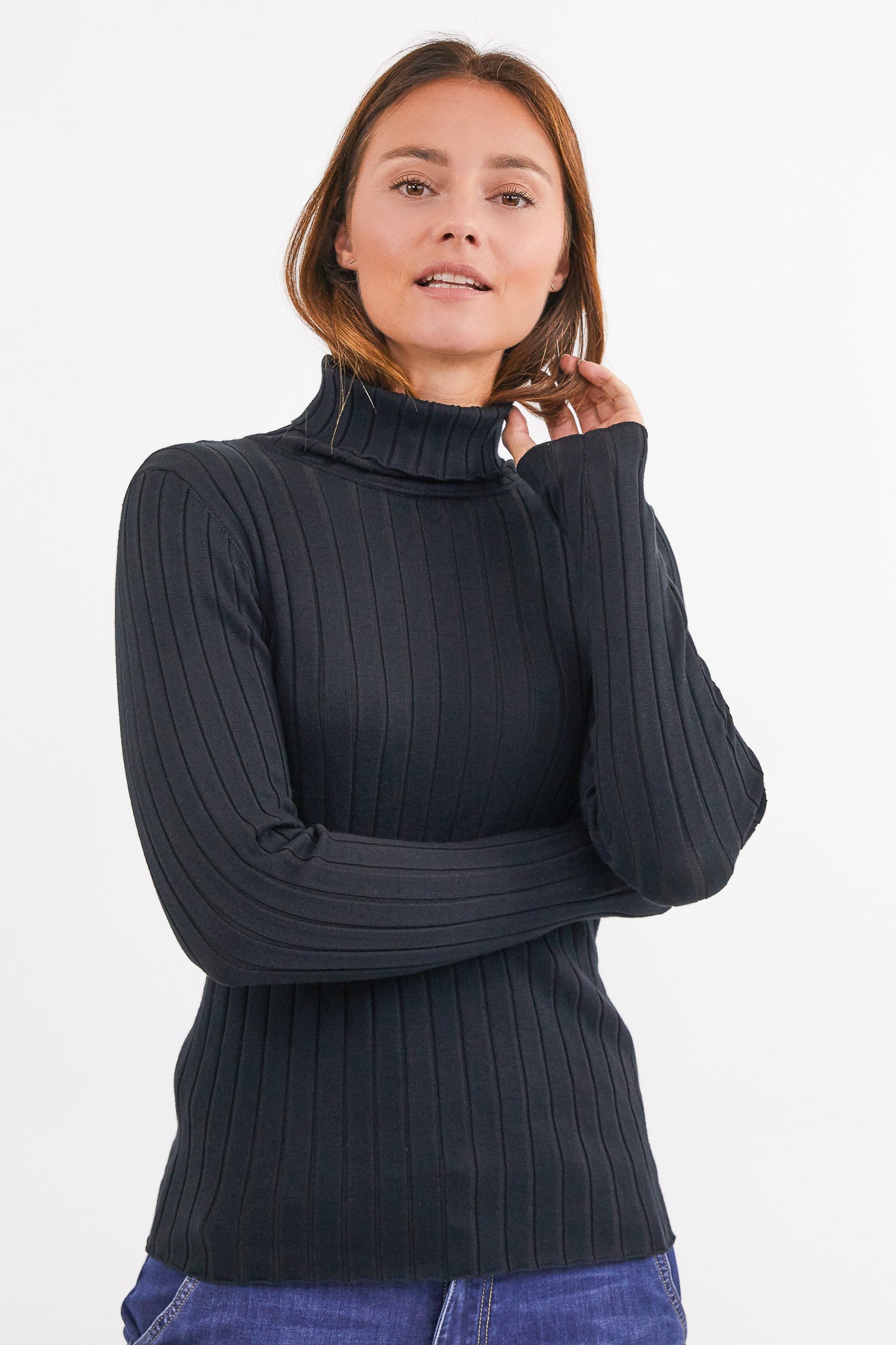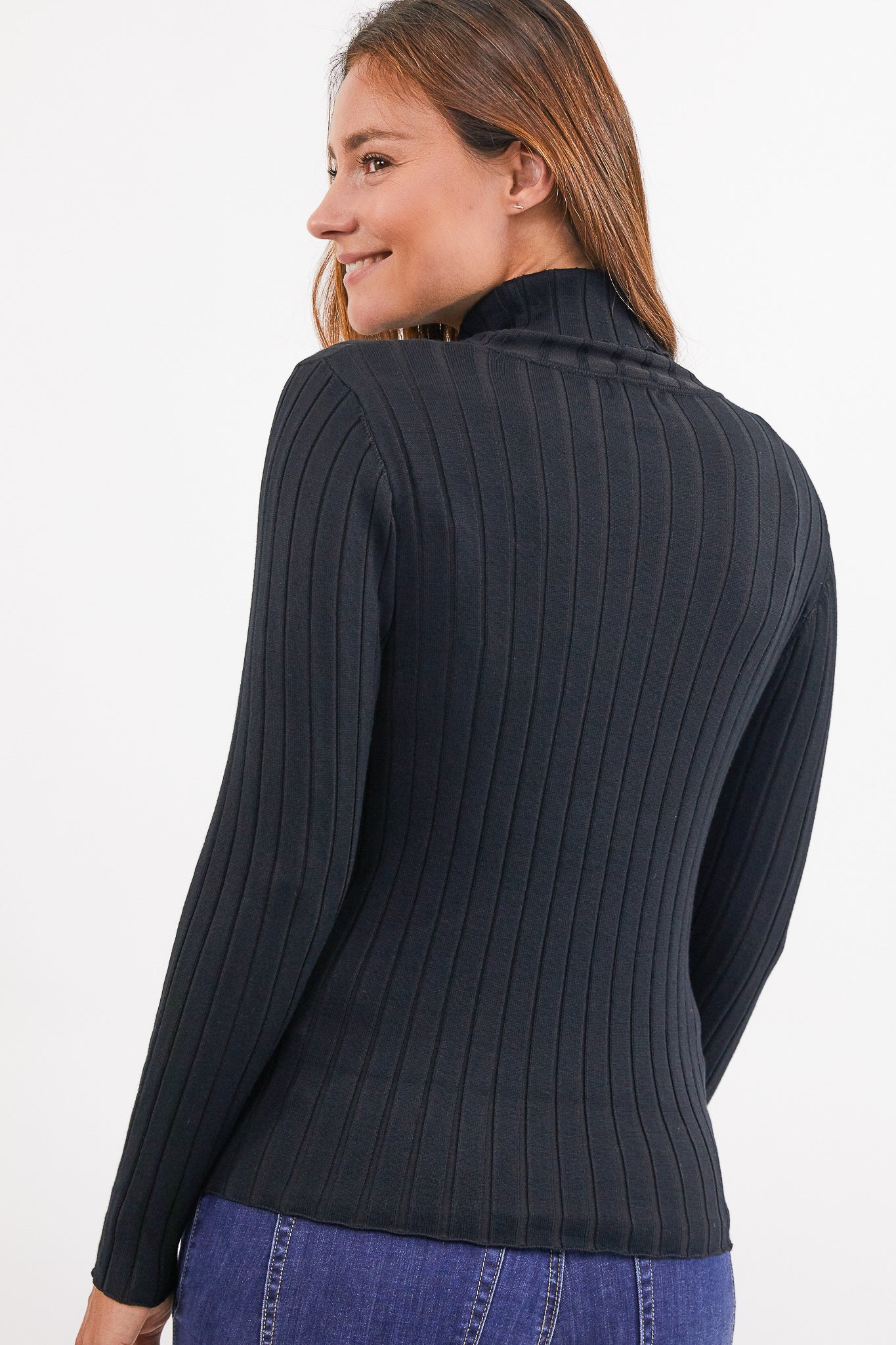 De Daisy trui heeft lange mouwen en een col. De trui heeft een geribde structuur.