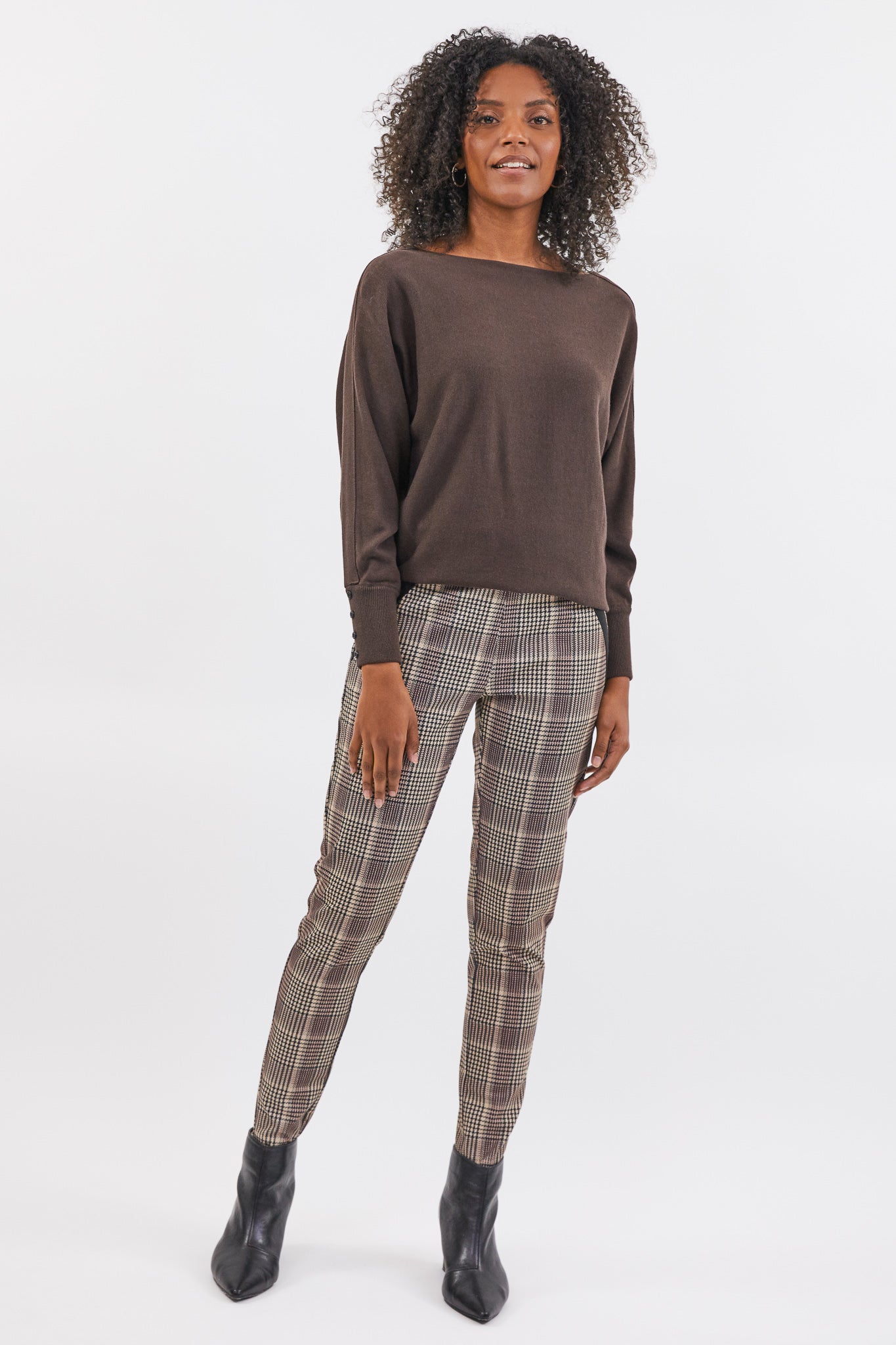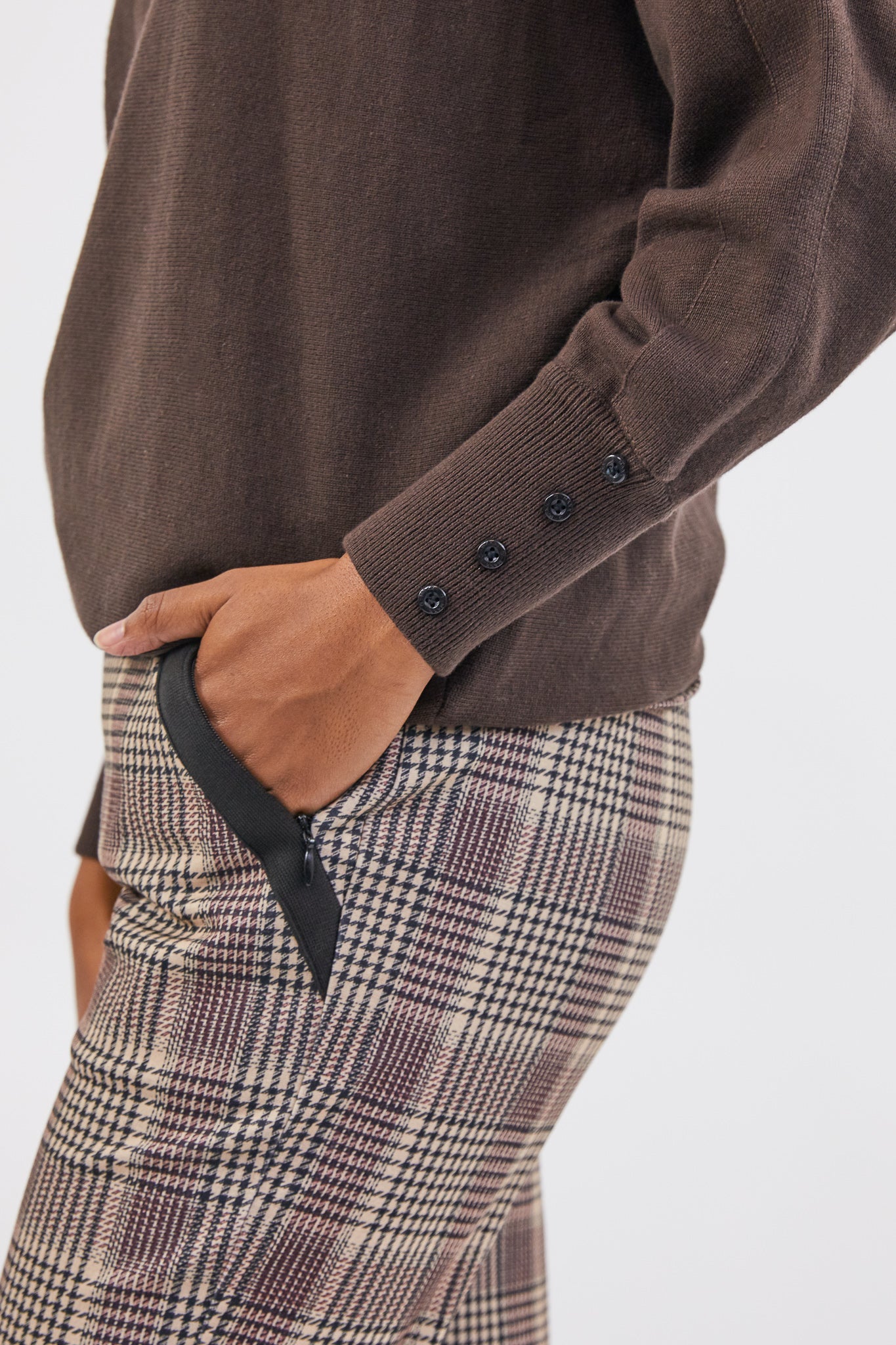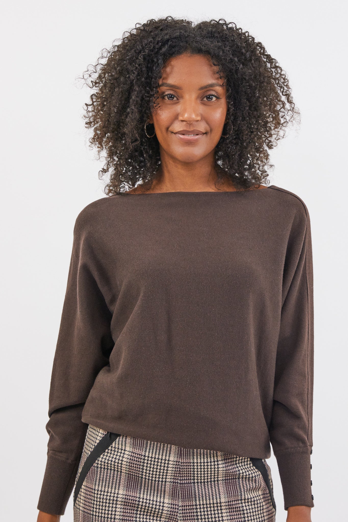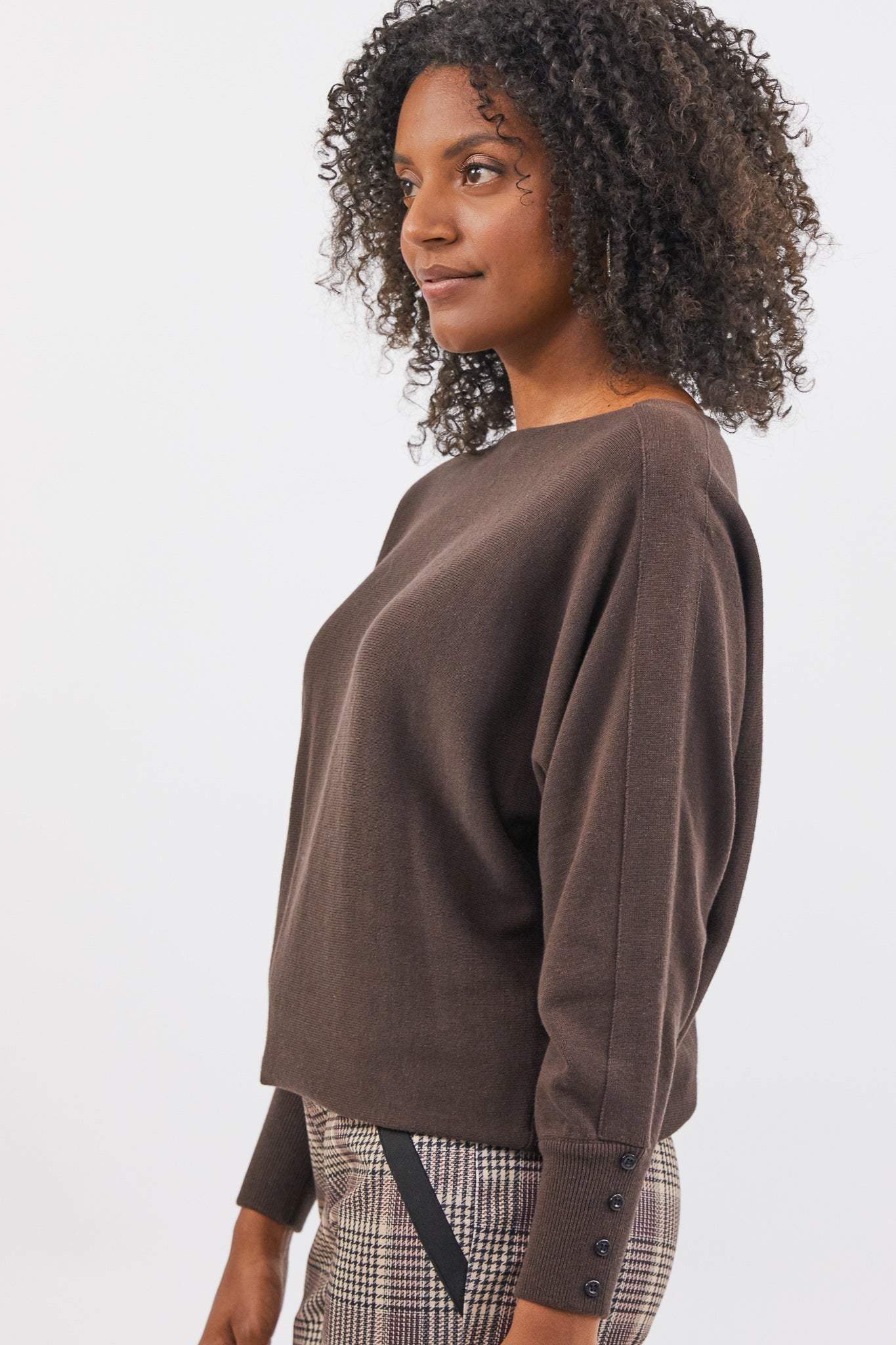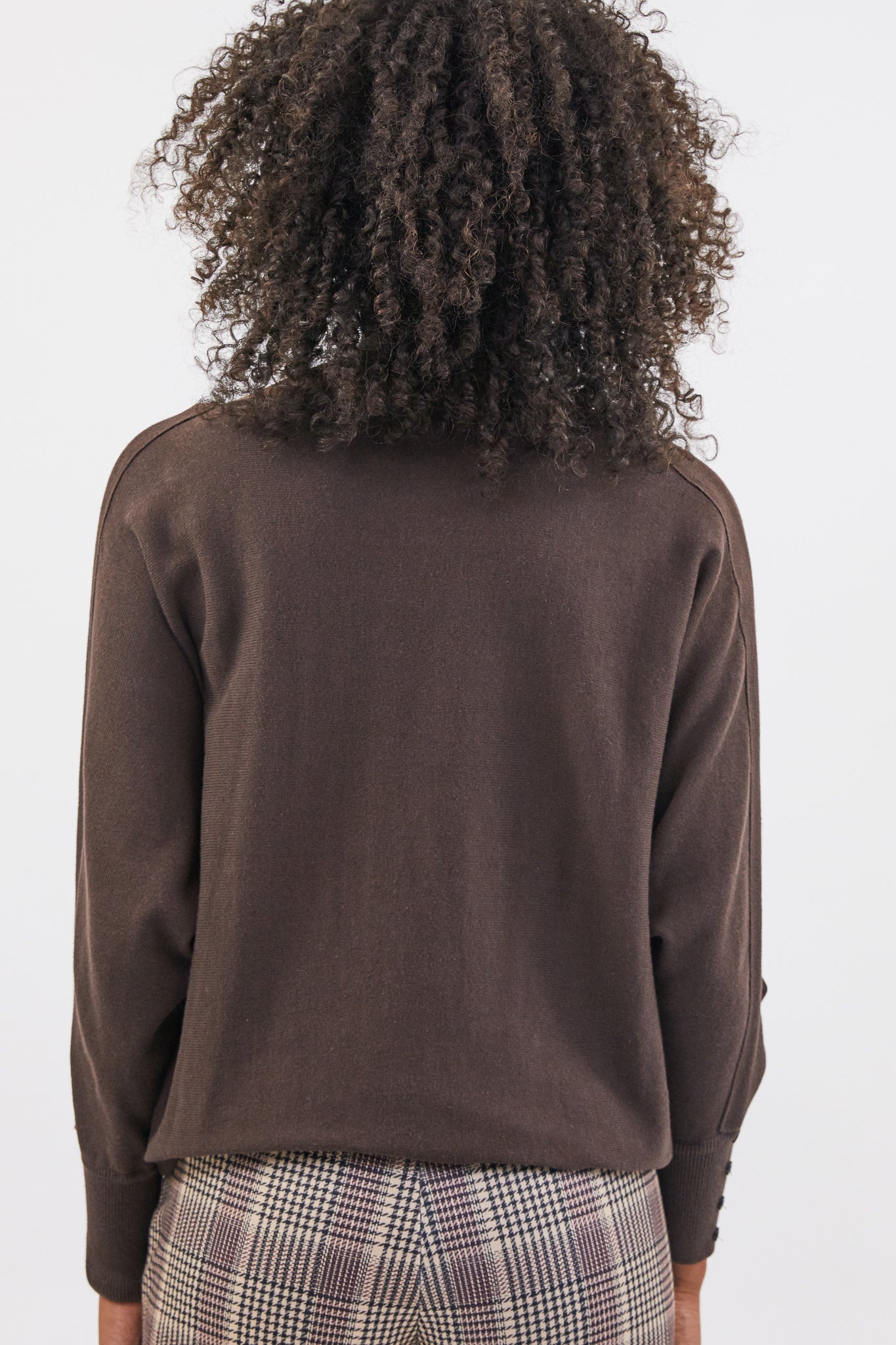 De Dalia trui heeft lange mouwen en een hoge ronde kraag. De onderkant van de mouwen zijn afgewerkt met knoopjes. De trui komt in het zwart, donkergroen, camel, paars en bruin.