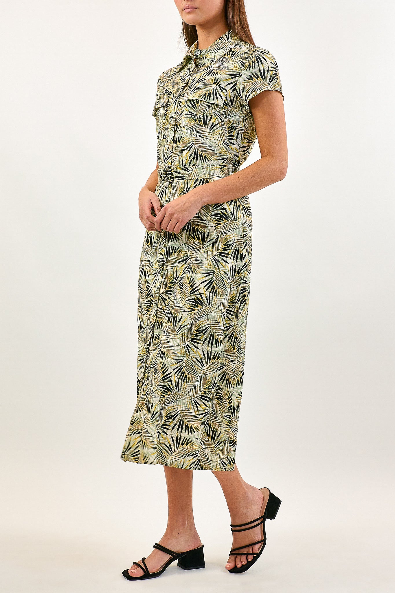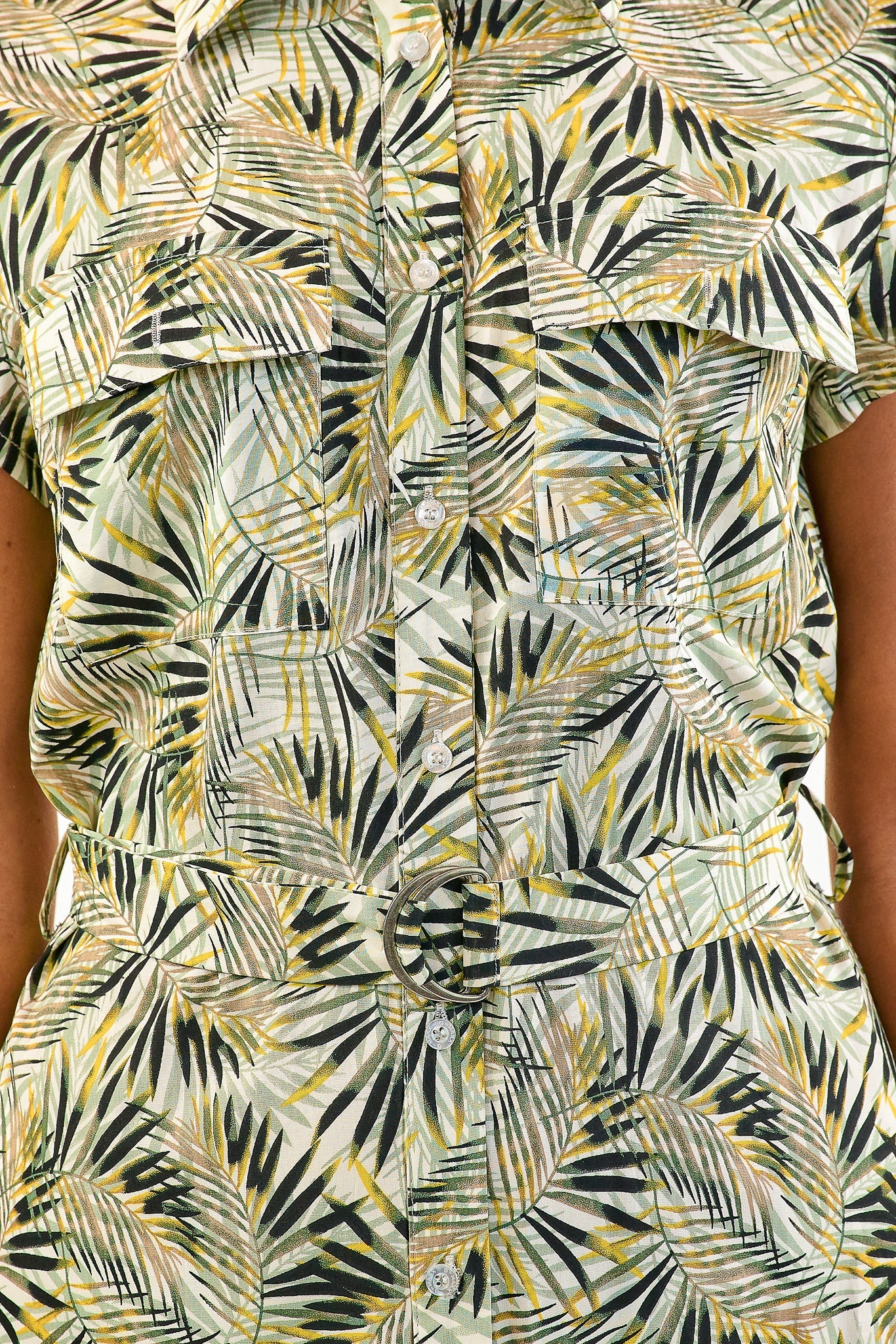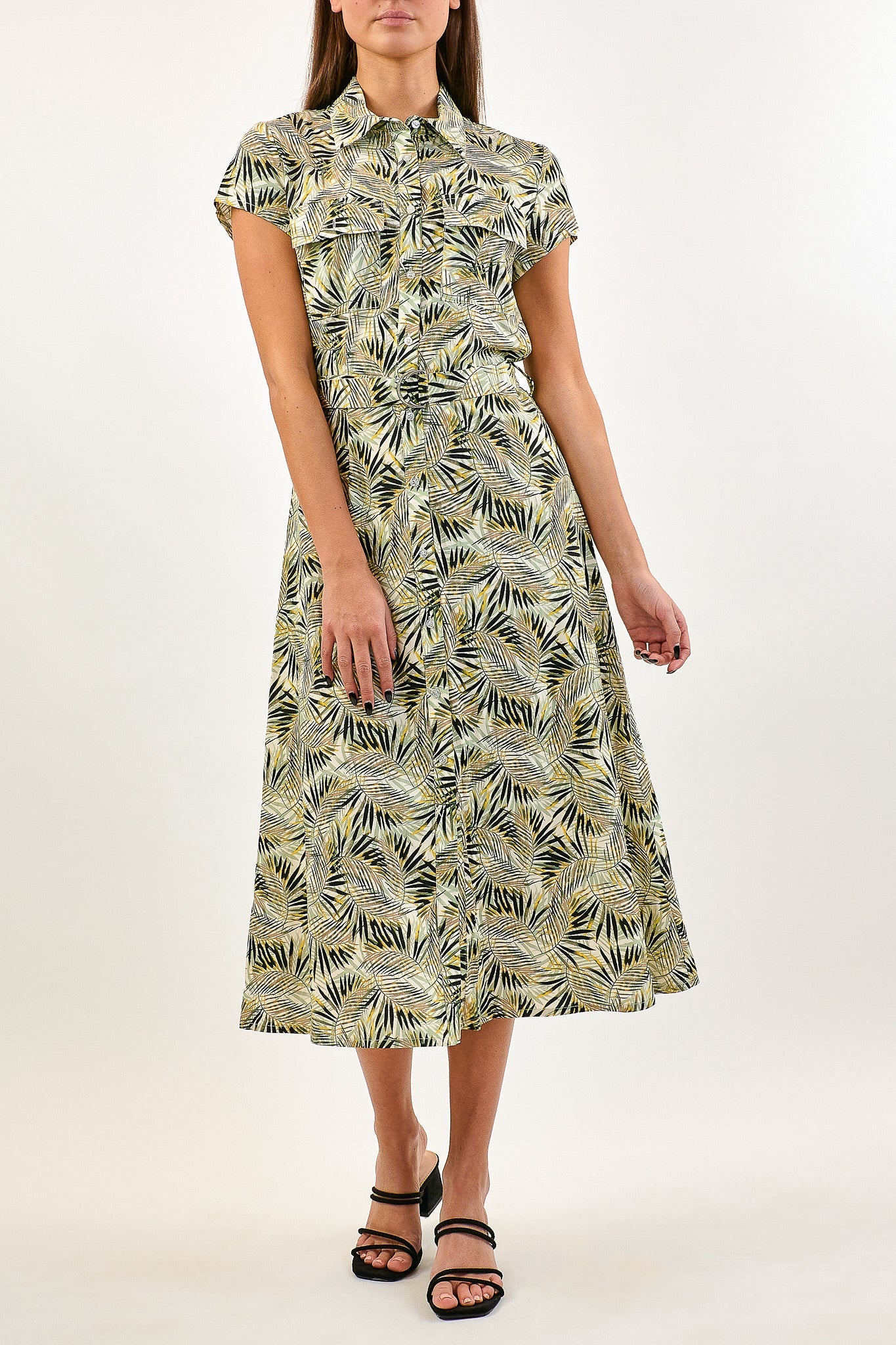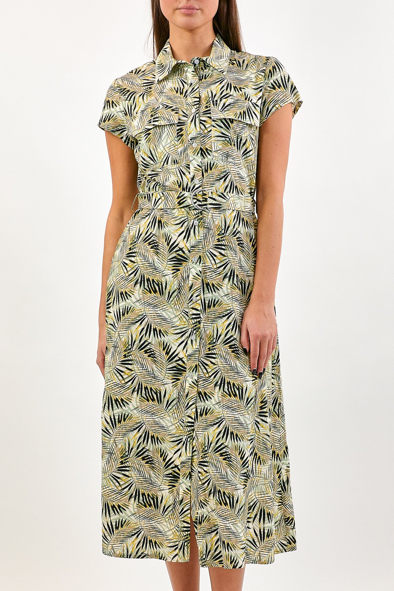 De Dalila jurk heeft een zomerse natuurlijke print. De jurk heeft korte mouwen en een blousekraag met knoopjes aan de voorkant.