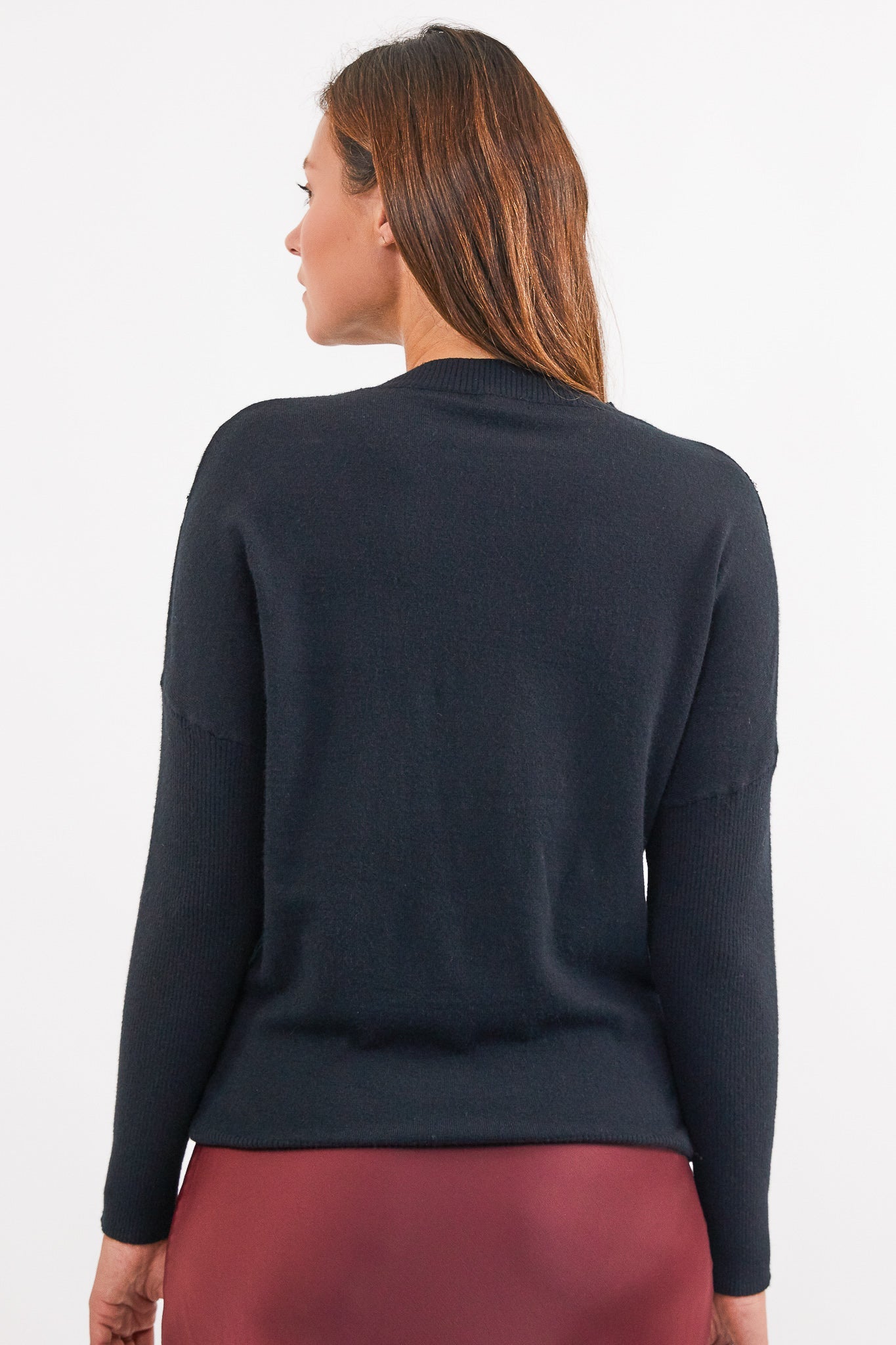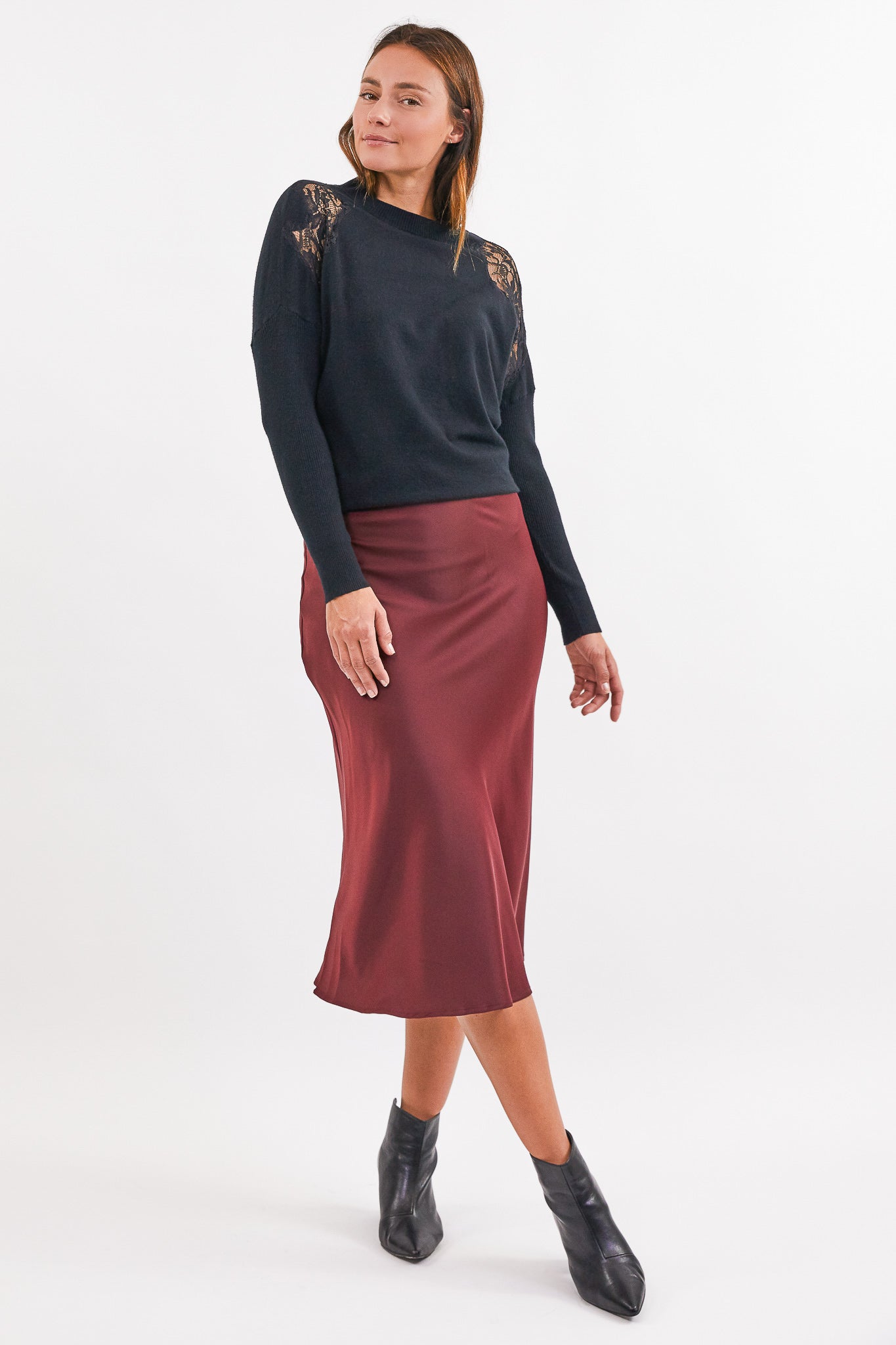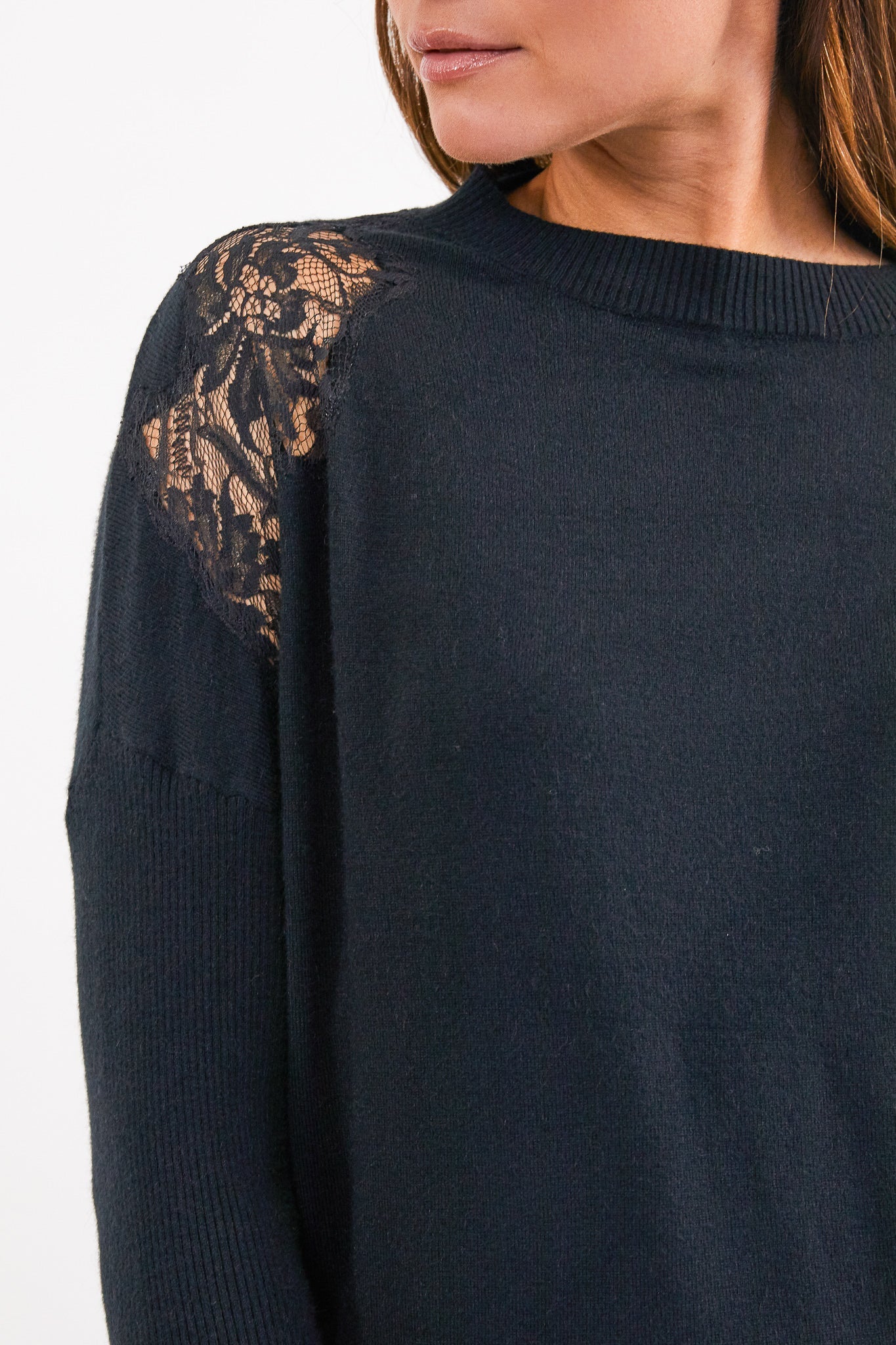 De Dani Jo trui heeft lange mouwen en een hoge ronde hals. De schouders van de trui zijn afgewerkt met kant. Maat XS valt als XS/S, maat S valt als S/M, maat M valt als M/L en maat L valt als L/XL.