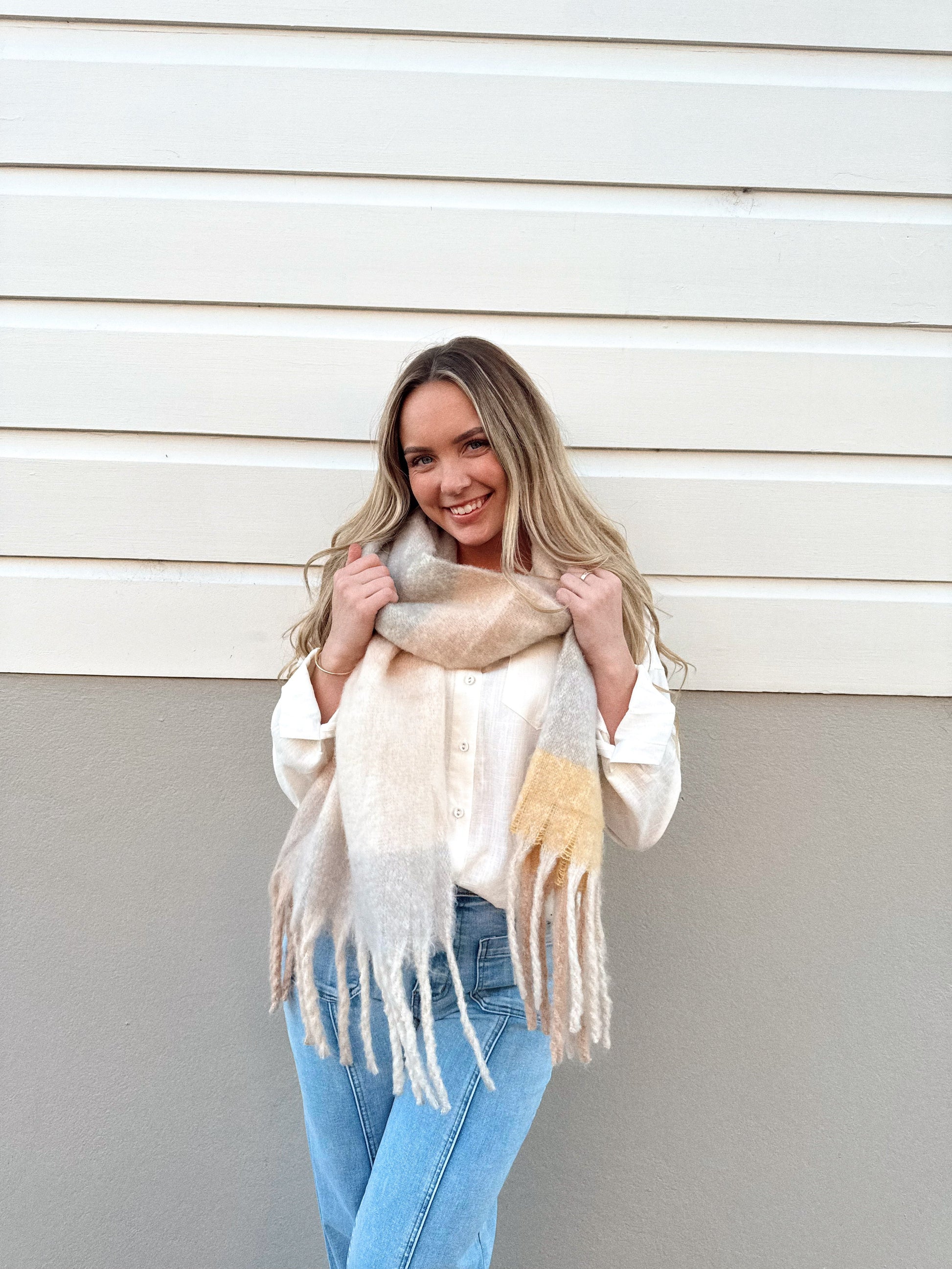 The Limone Creme colourway features soft pastels with a hint of buttery yellow. Completed with tassel detailing on the ends.